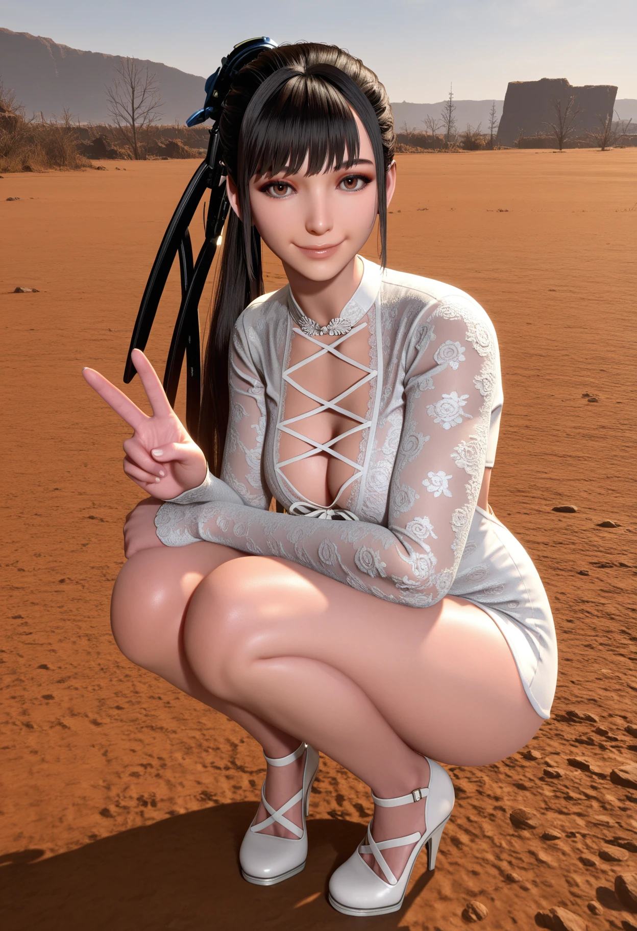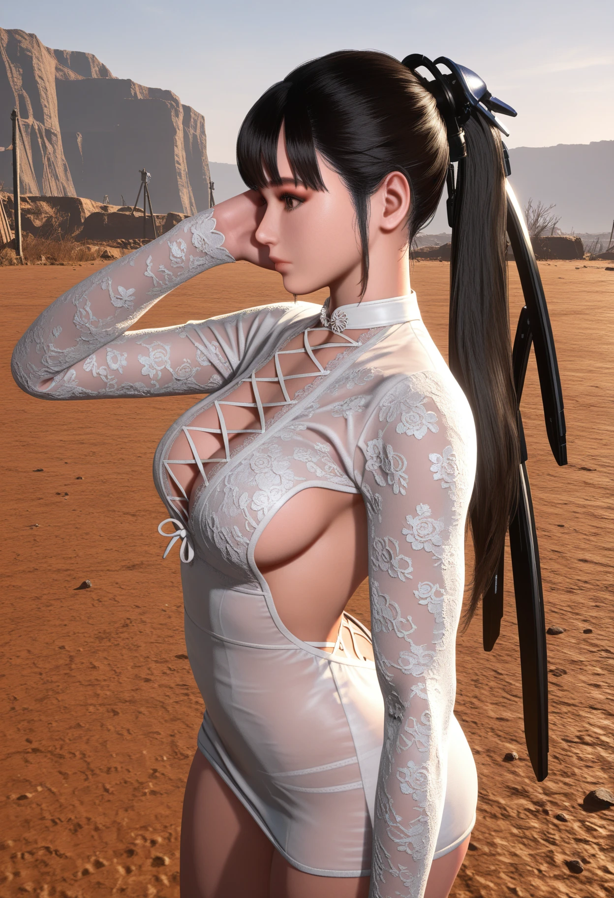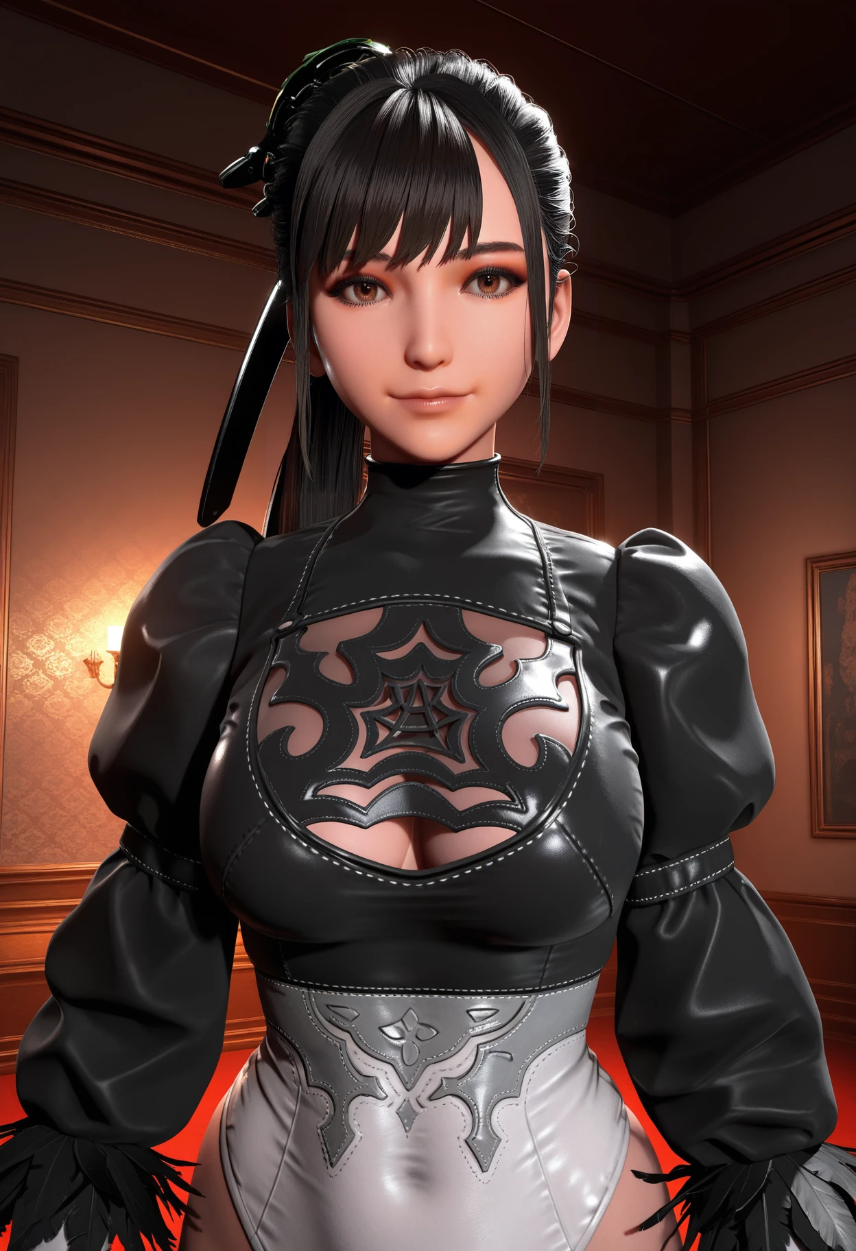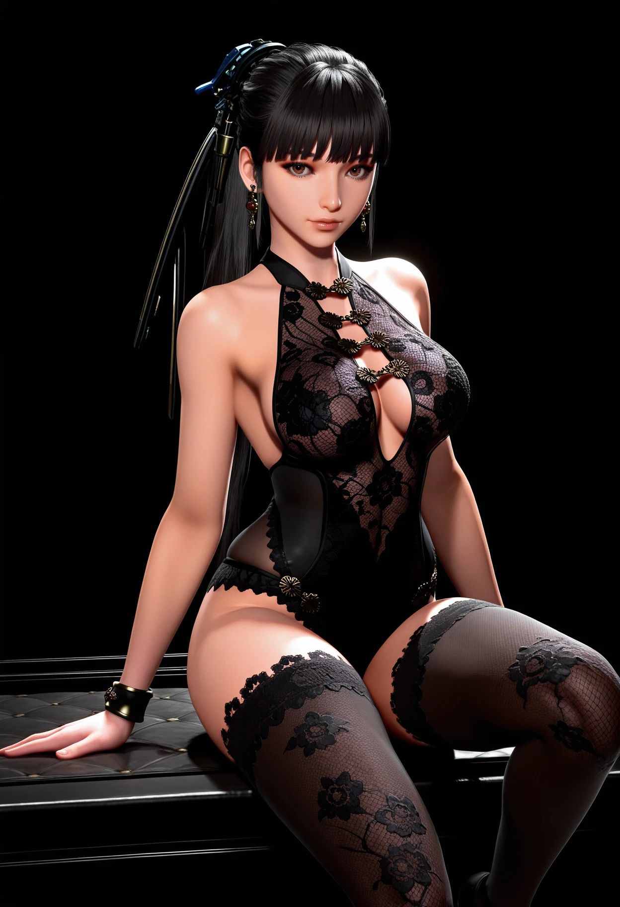 3d,realistic,mm,mature female,black hair,brown eyes,long hair,ponytail,bangs,hair ornament,large breasts