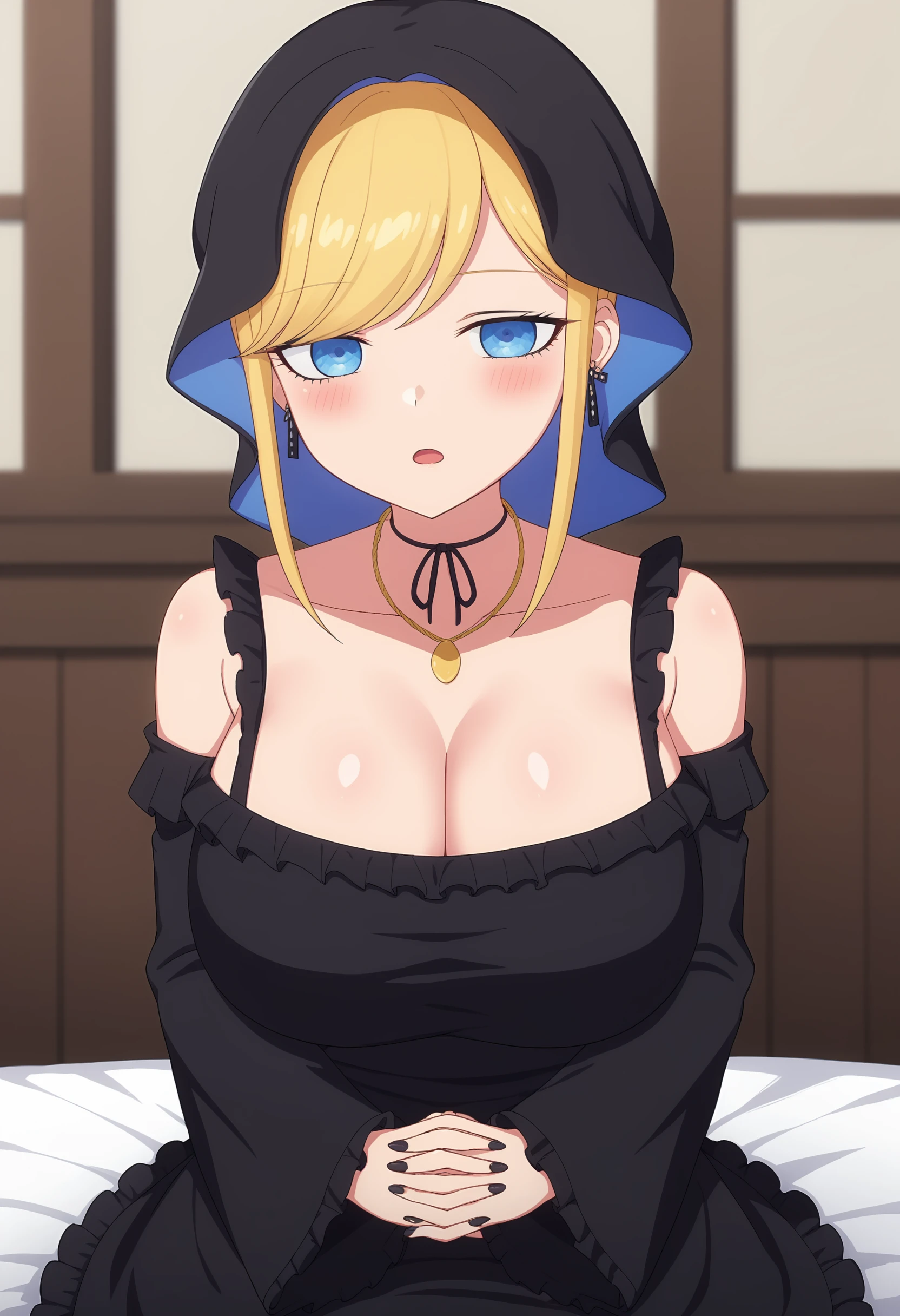 Tags for her costume: dress, cleavage, bare shoulders, jewelry, frills, detached sleeves, choker, necklace, apron, black dress, cross,