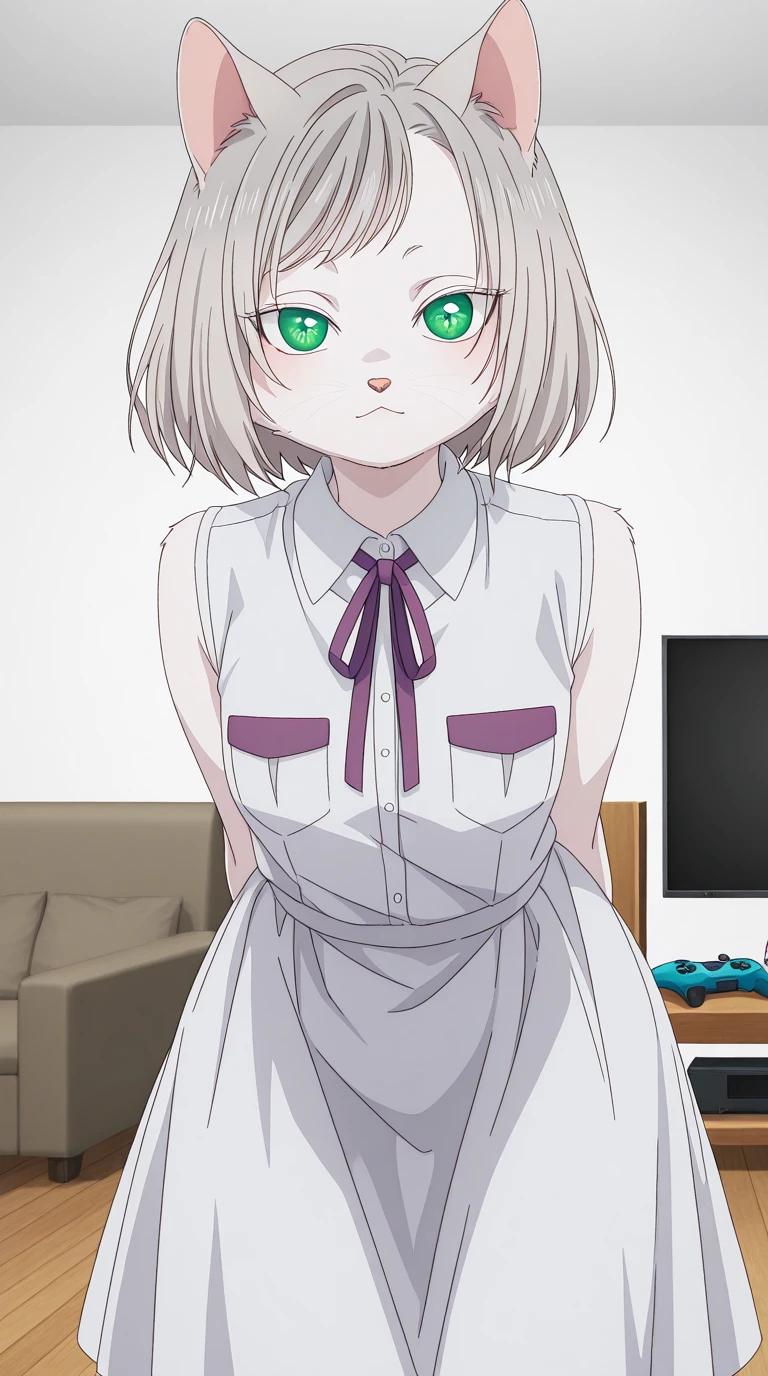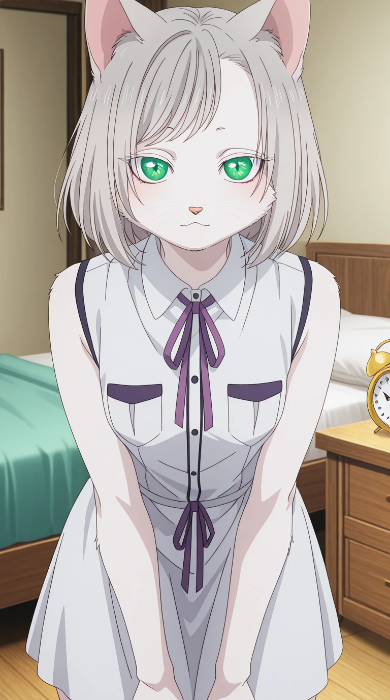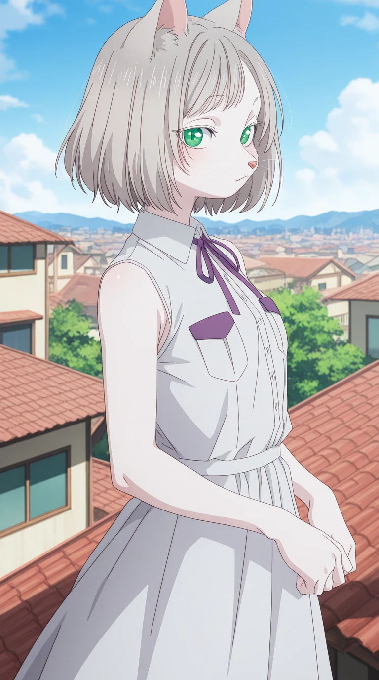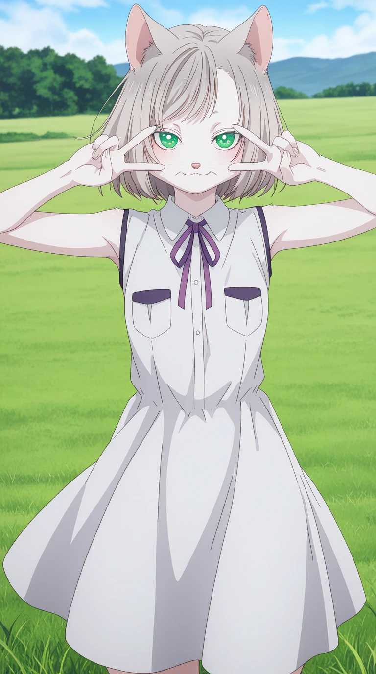 kisara, short hair, animal ears, green eyes, grey hair, cat ears, cat girl, furry, furry female, whiskers, mature female, small breasts, anime screencap
