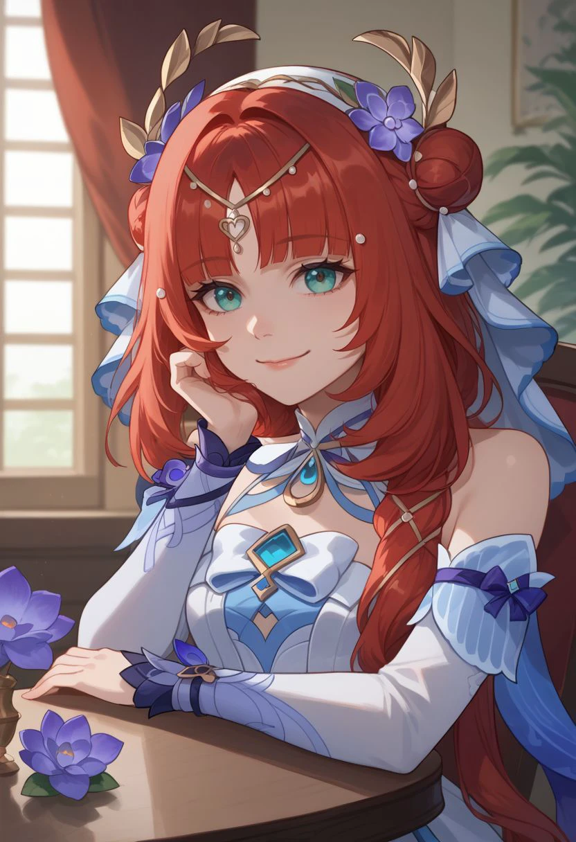 nilousabaa, red hair, long hair, aqua eyes, parted bangs, low twintails, medium breasts, hair ornament, hair flower, purple flower, hair bun,
