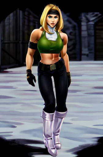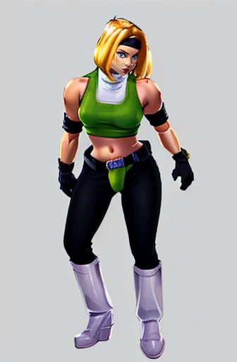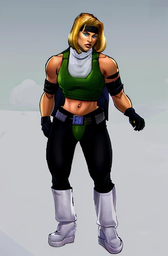 Example input: blonde hair, black pants, green cropped, white boots, black gloves, black headband, blue eyes, belt, white turtleneck, armband