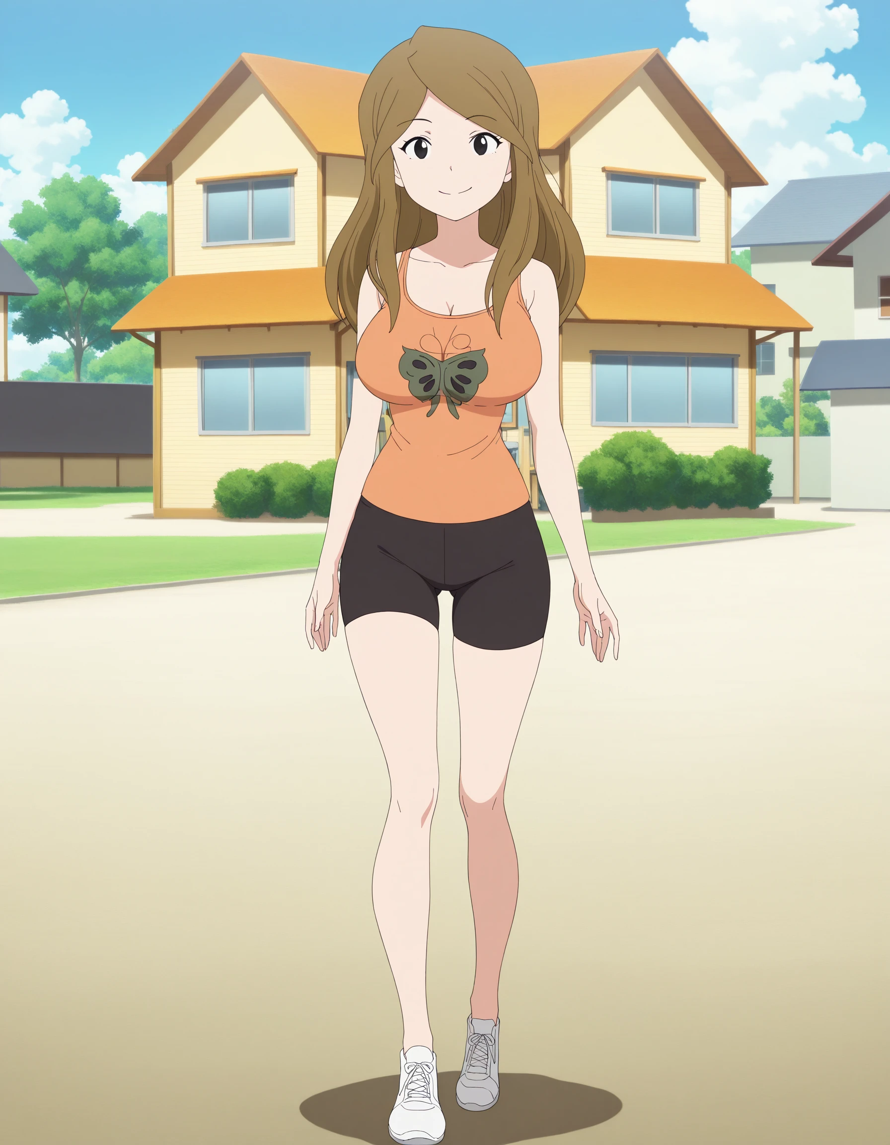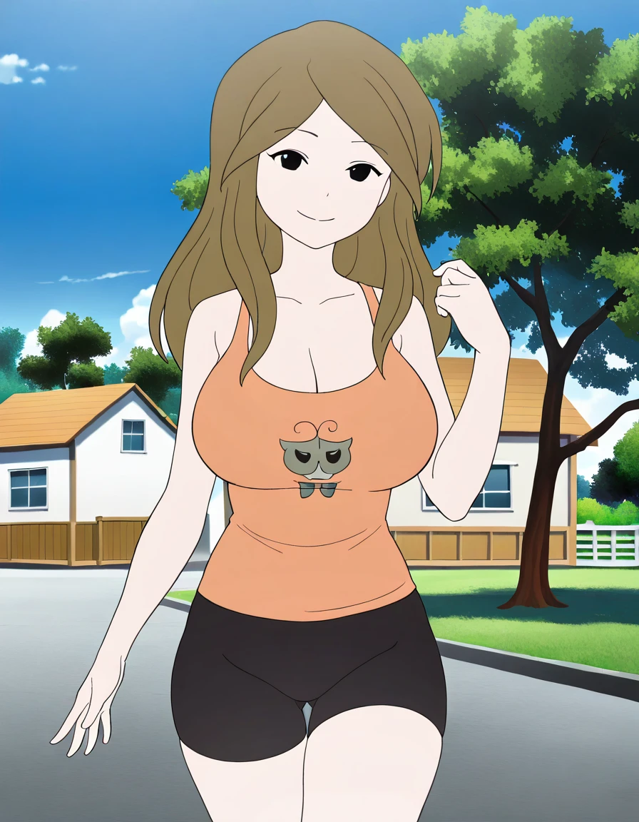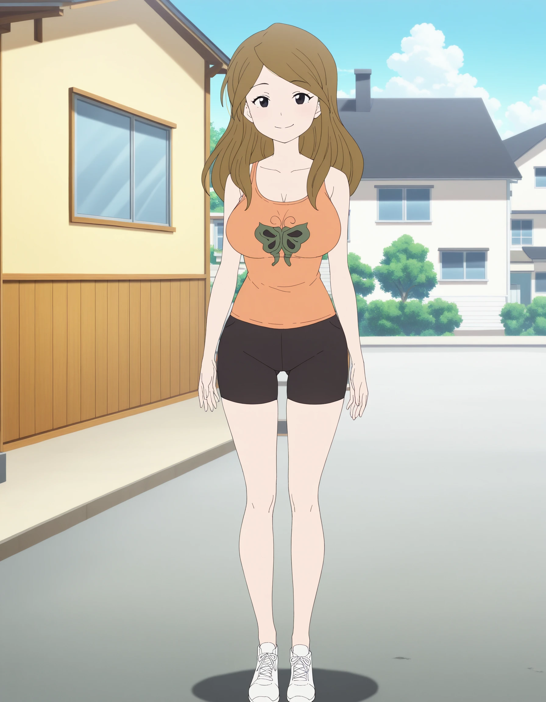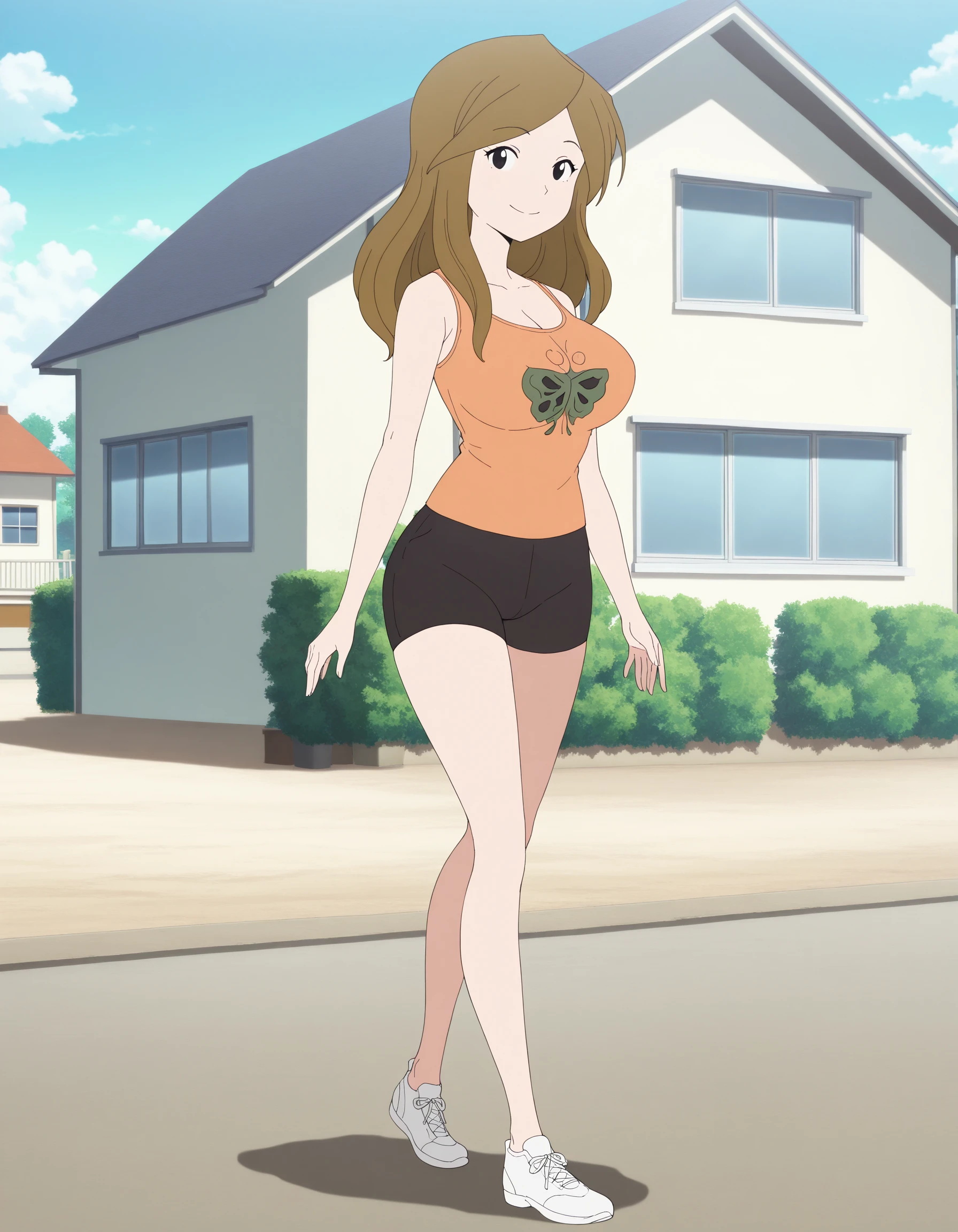 tank top, bike shorts, cleavage, white shoe, low heels,