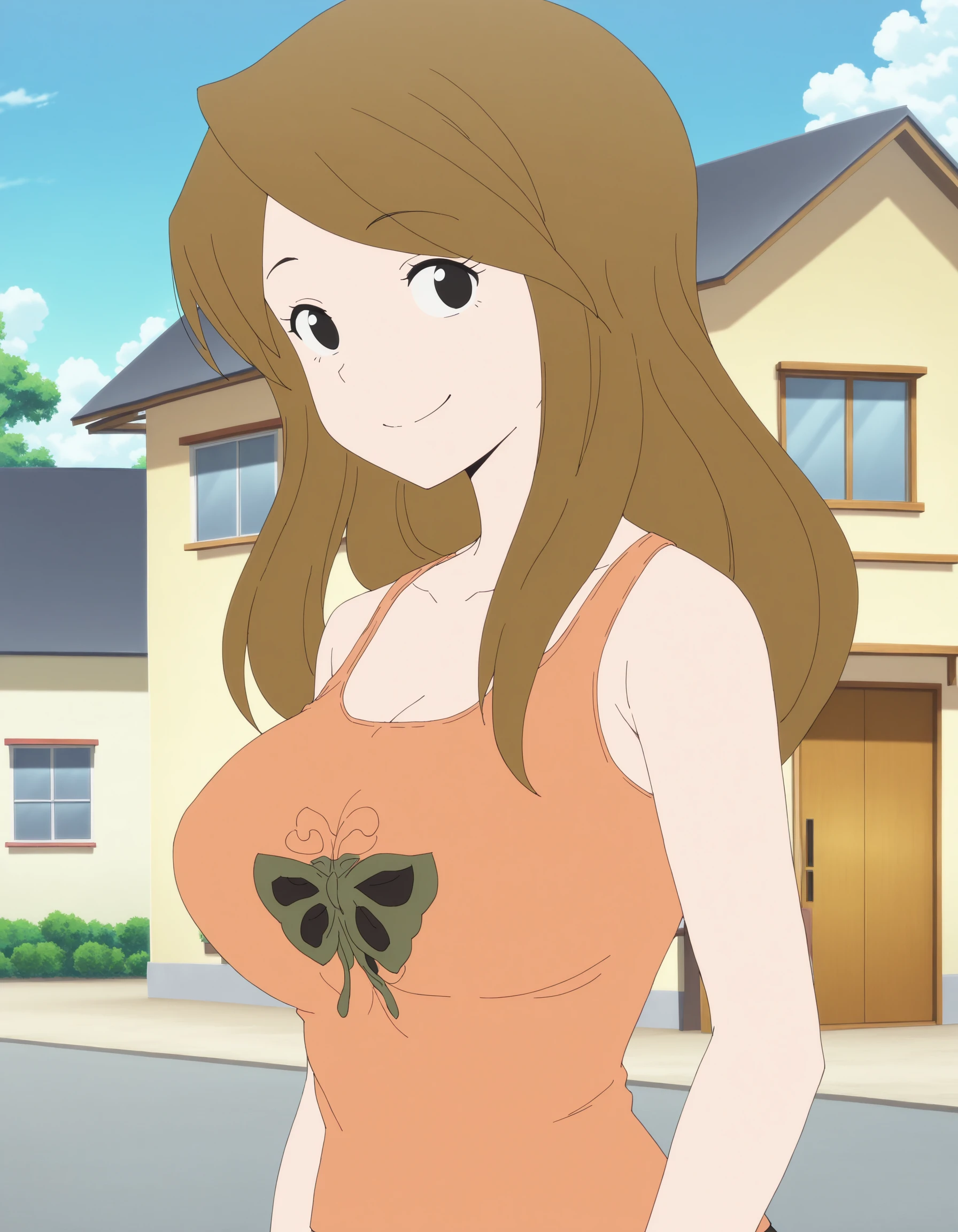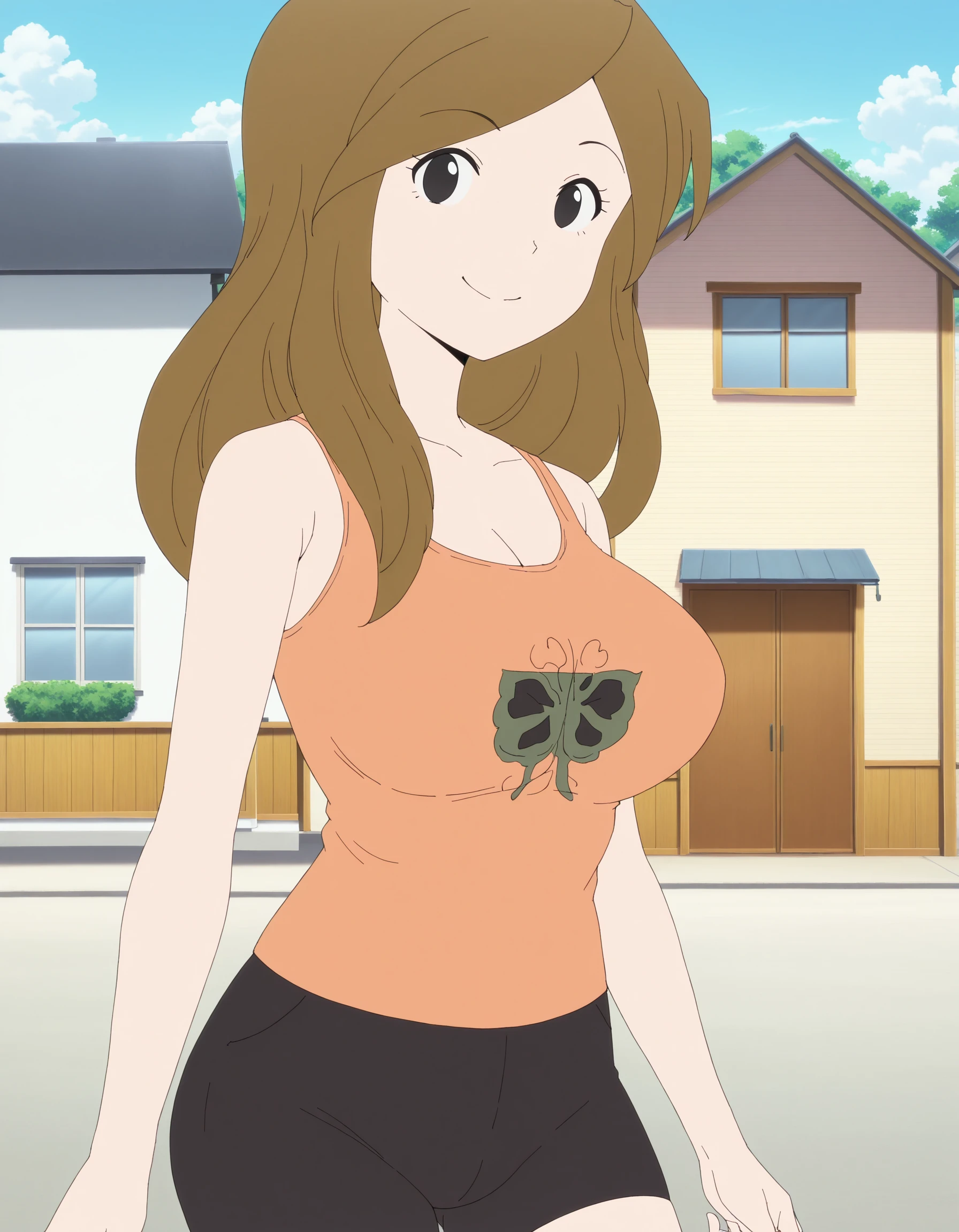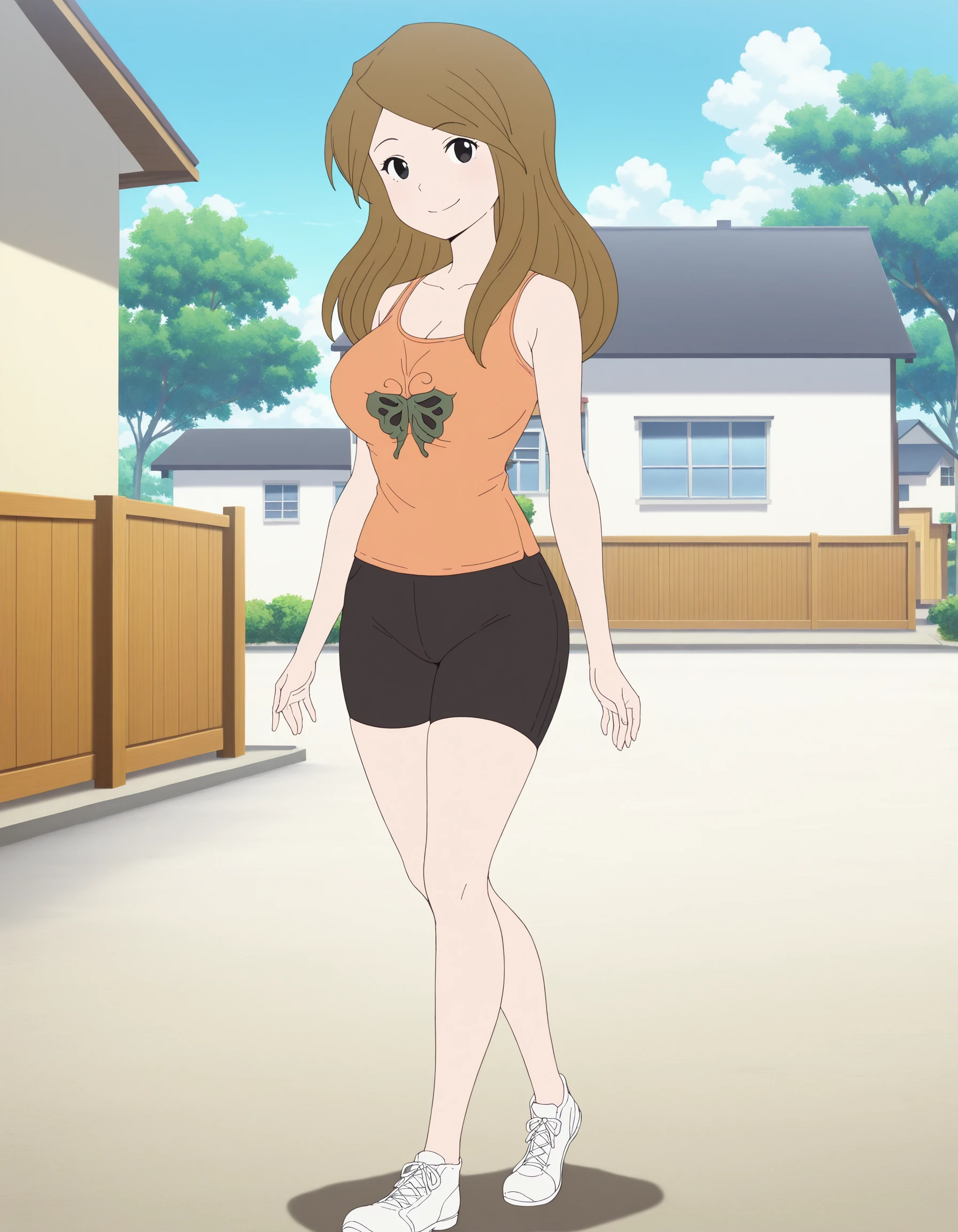 tank top, bike shorts, cleavage, white shoe, low heels,