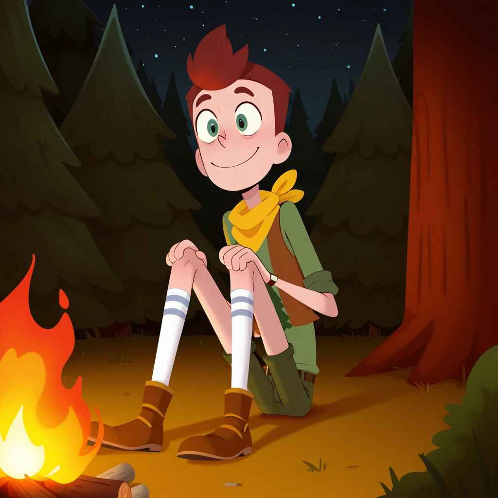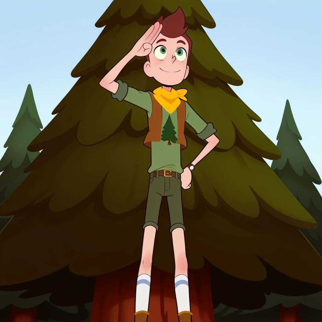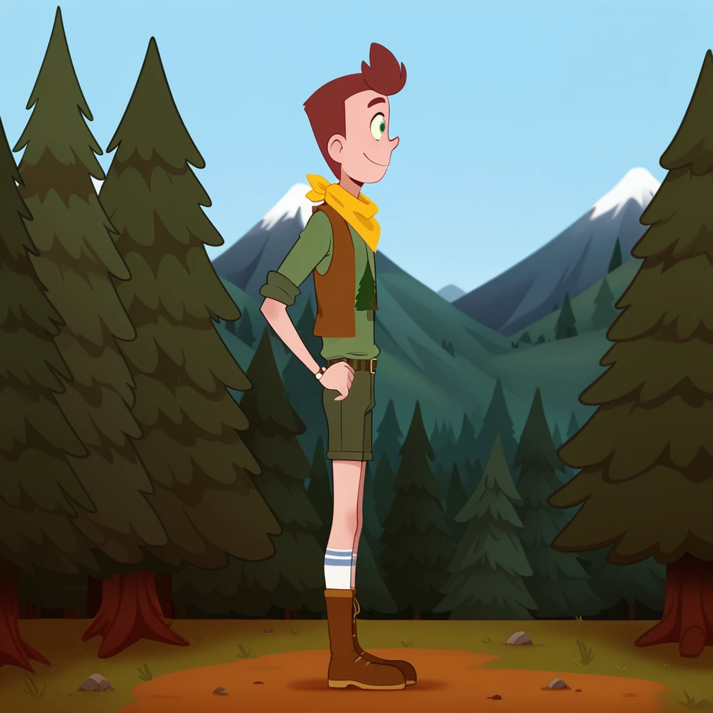 yellow neckerchief,green shirt,sleeves rolled up,pine tree print shirt,belt,wristwatch,dark green shorts,white kneehighs,brown boots