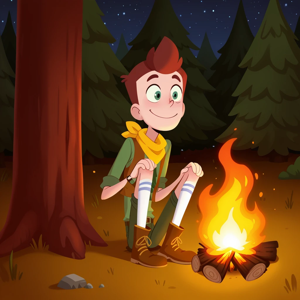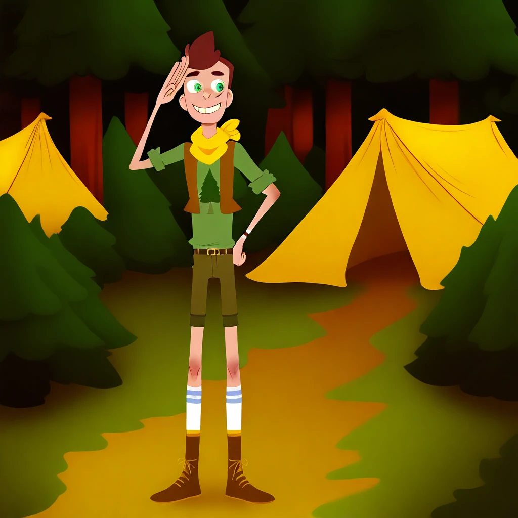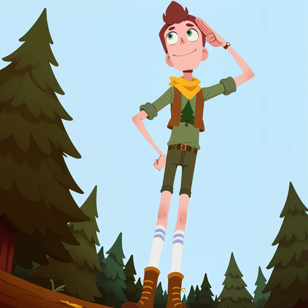 yellow neckerchief,green shirt,sleeves rolled up,pine tree print shirt,belt,wristwatch,dark green shorts,white kneehighs,brown boots