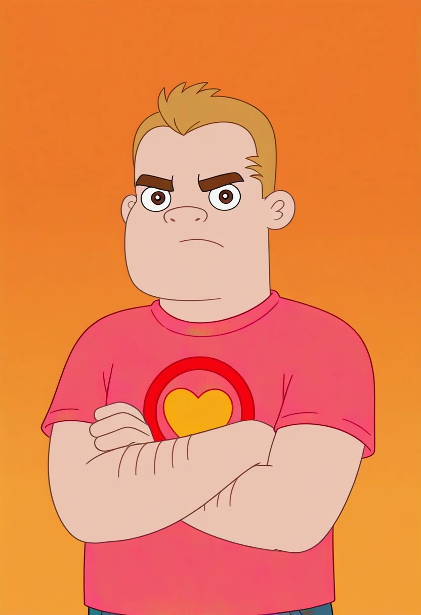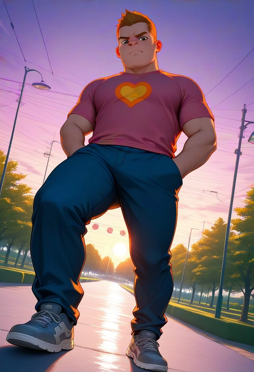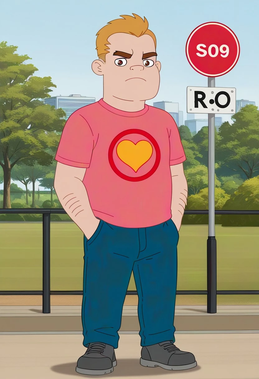 Lyle, 1boy, male, tall, stocky build, ivory skin, hairy arms, medium blond hair, brown eyebrows, dark brown eyes, round ears, light magenta shirt with a yellow heart under a red prohibition sign, blue jeans, gray shoes,