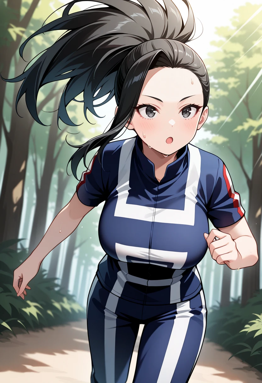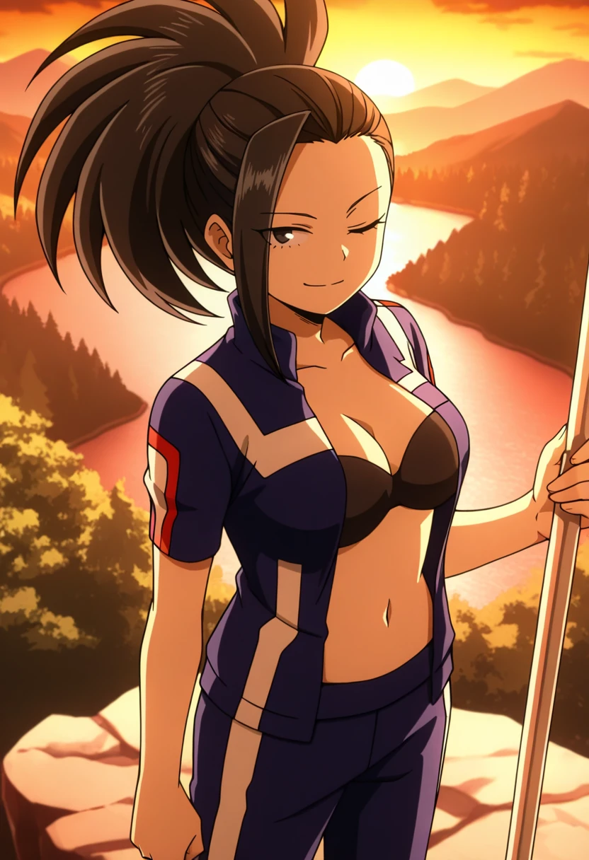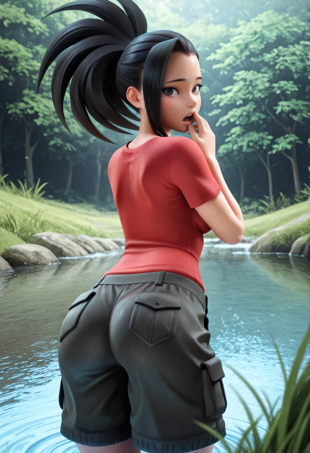 yaomomo, black hair, black eyes,wavy hair, parted bangs, hair pulled back, wide ponytail, long hairCasual Momo: