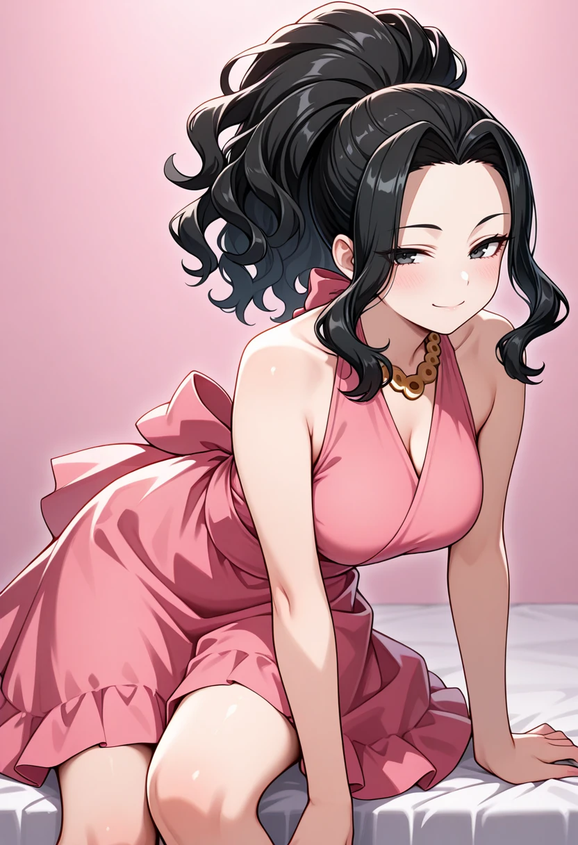 pink sleeveless dress, pink sash, pink back bow, frilled dress, gold bracelet, gold chain necklaceOk, here's my biggest mistake. I didn't realize it was a halterneck until too late. So, use this prompt and the negatives: strapless, spaghetti straps. It won't work sometimes but I'll fix it.