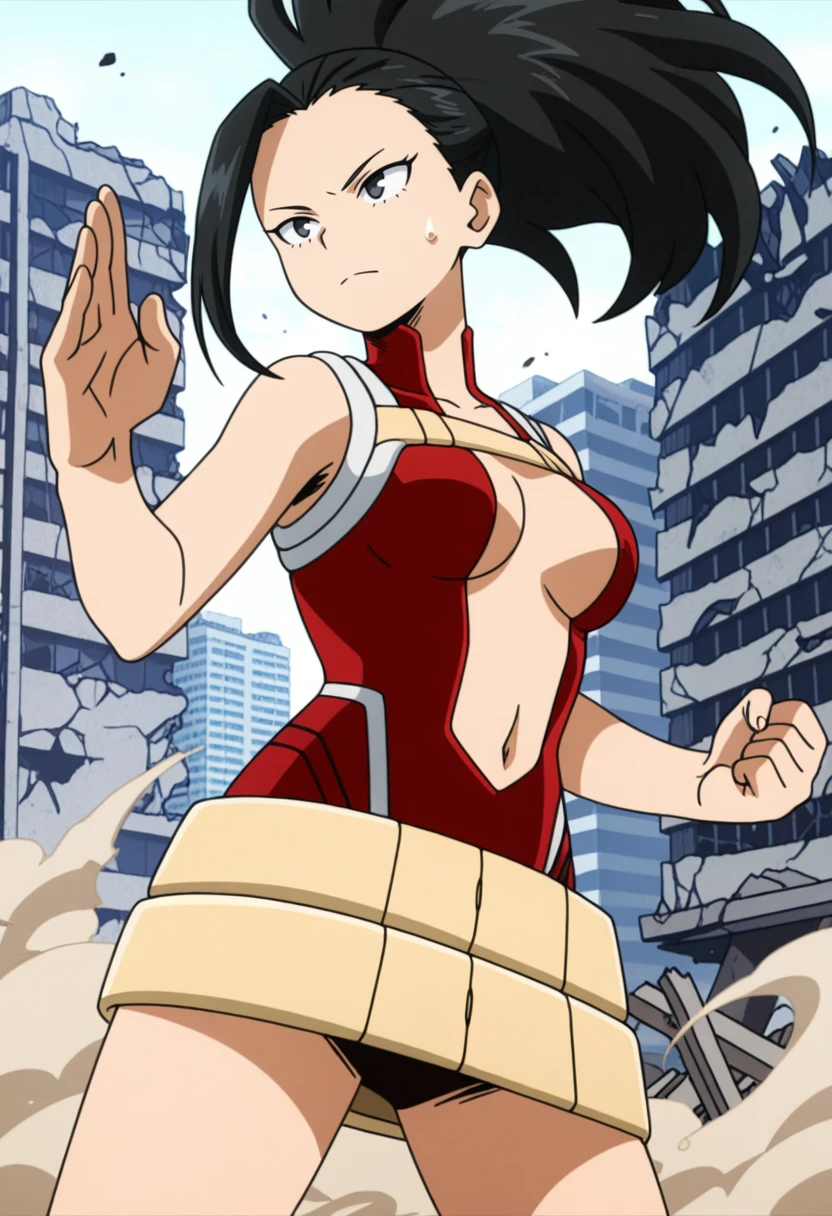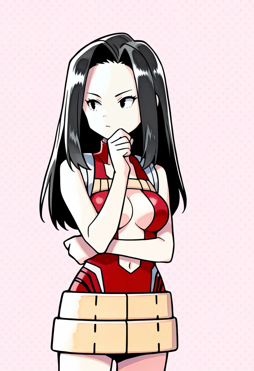 superhero, red yaotoro leotard,center opening, yaoyoro belt skirt,beige chest strap,chest harness, high collar,bare arms, red bootsThe belt needs gacha, my bad, I'll try to fix it next time, on the plus side, is very easy to remove.