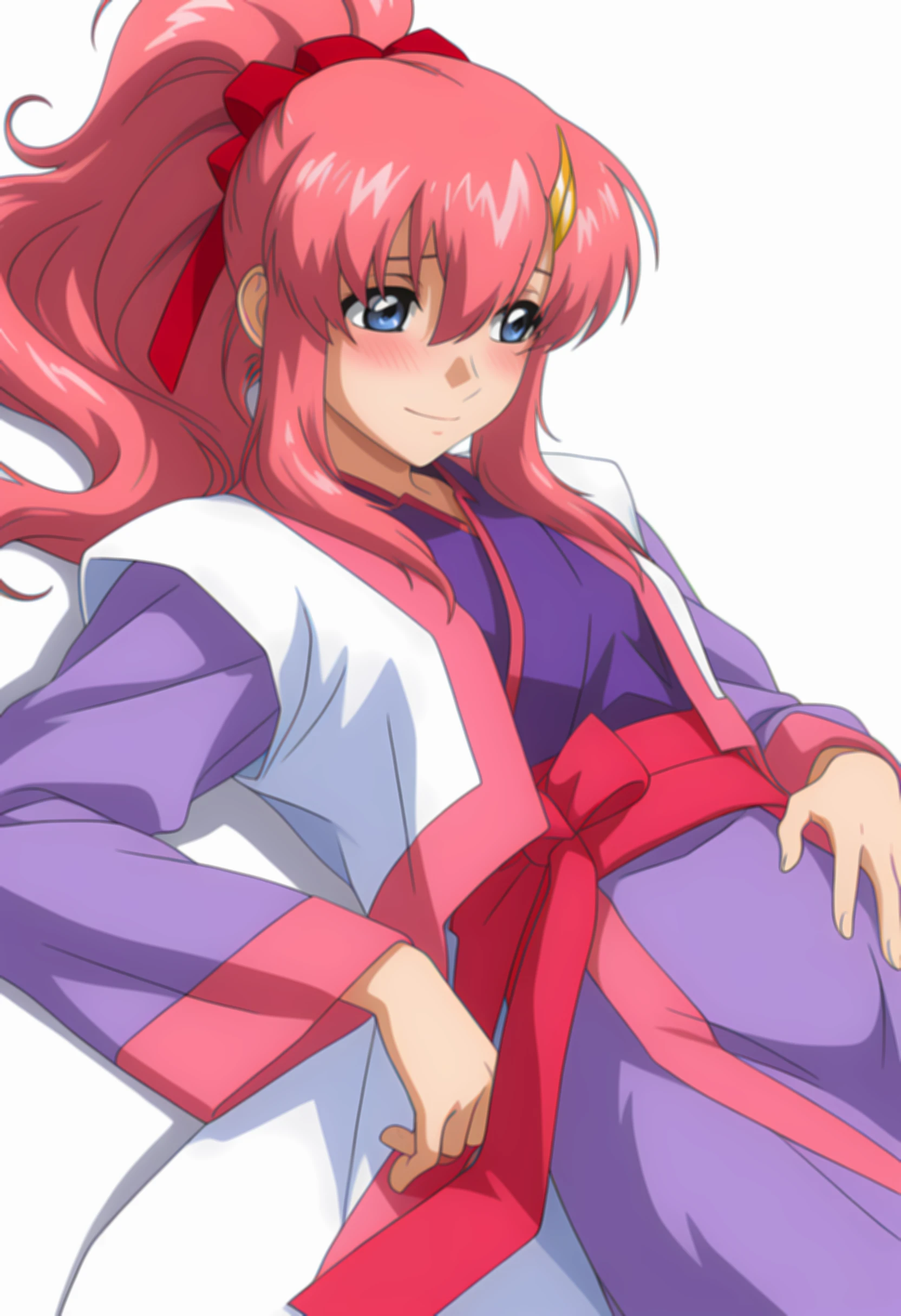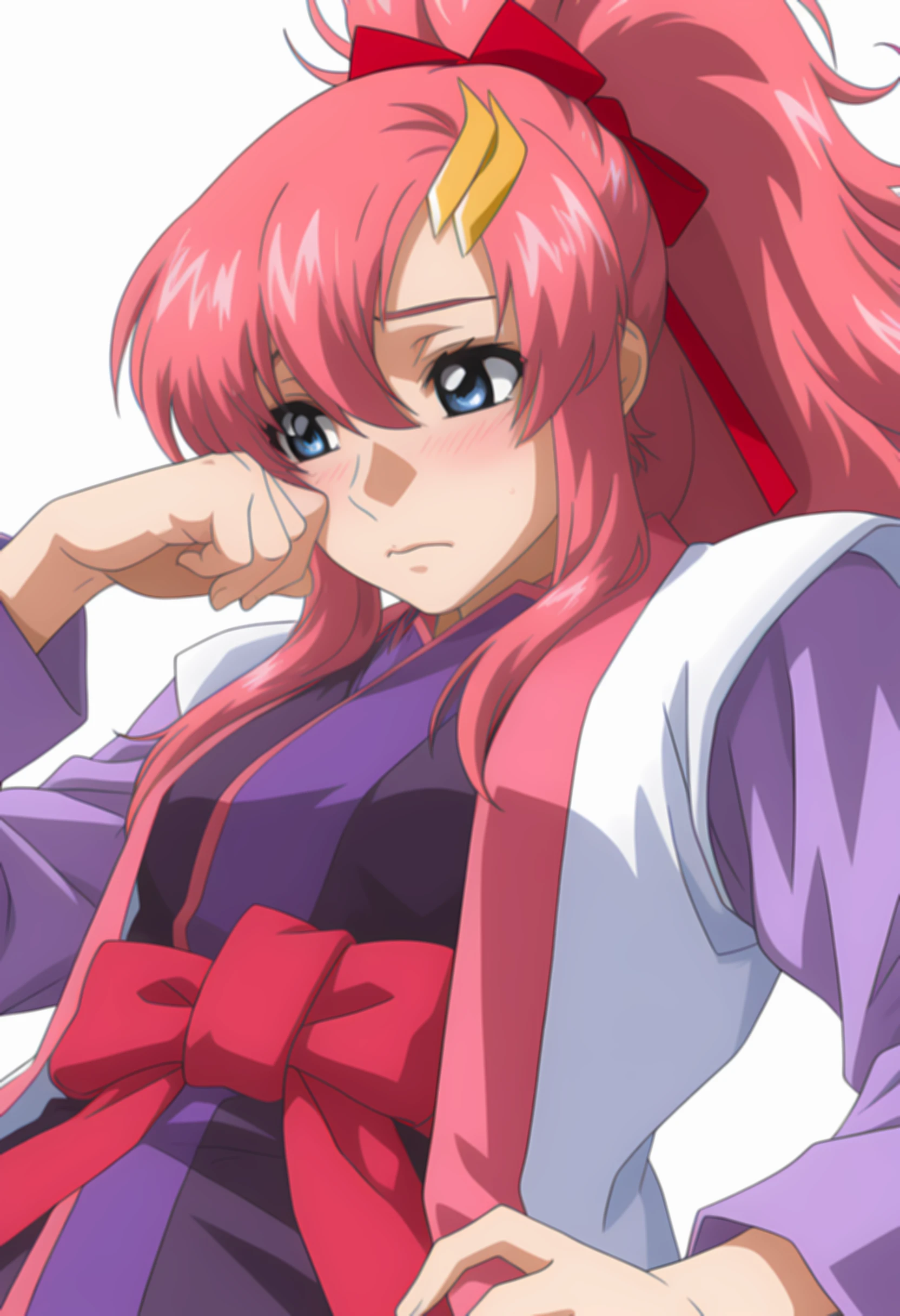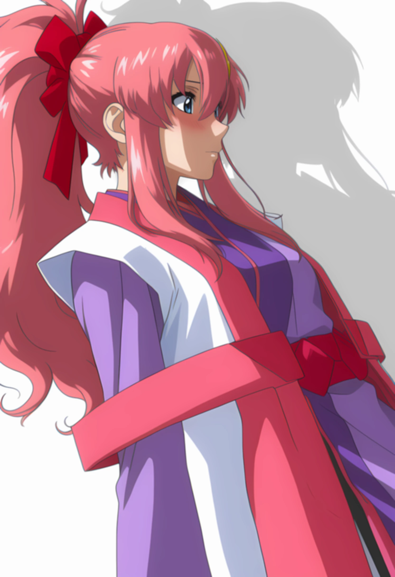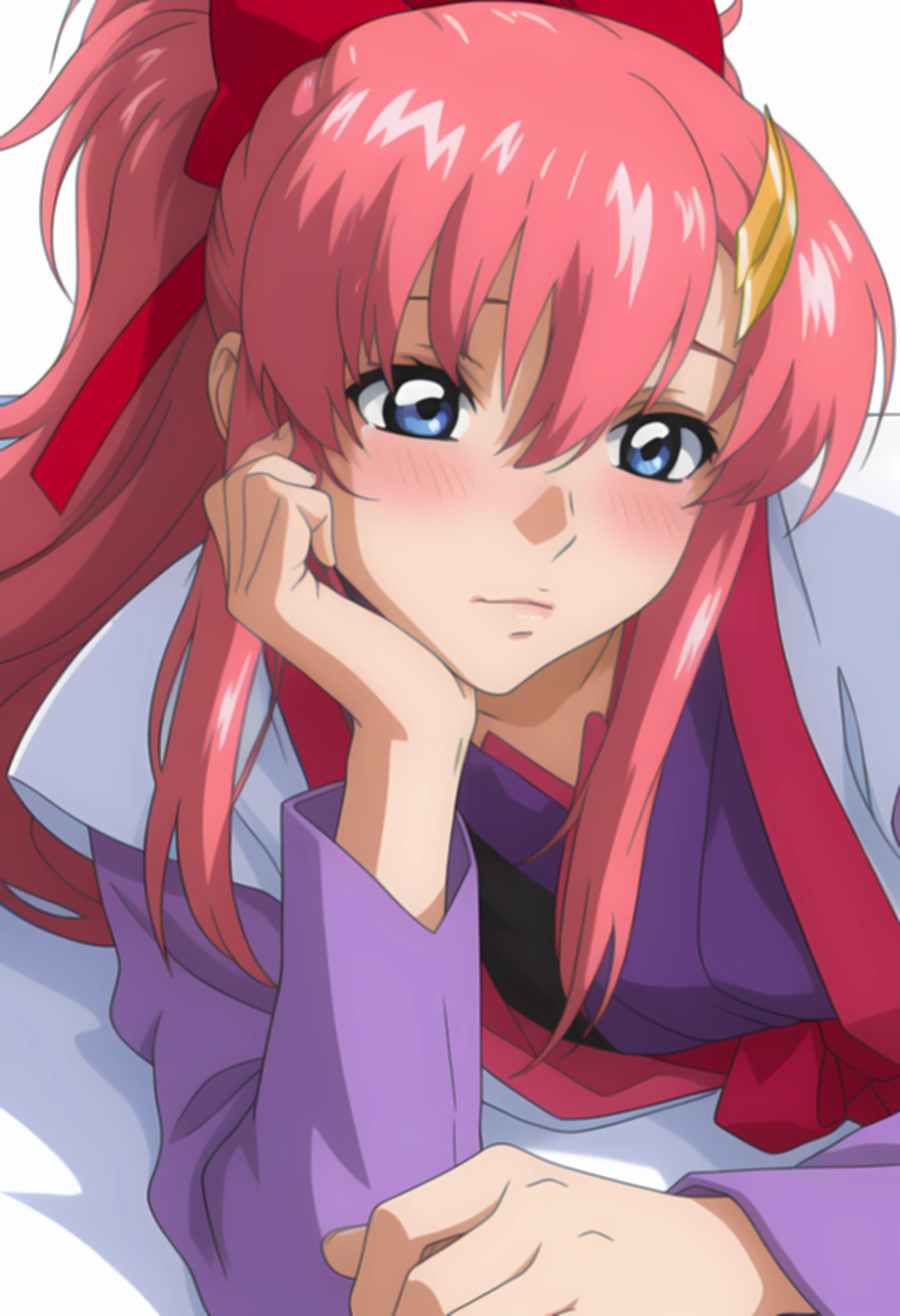 ,La6us_Cl2ne, long hair, blue eyes, pink hair, hair ornament, hair between eyes,ponytail, ribbon,