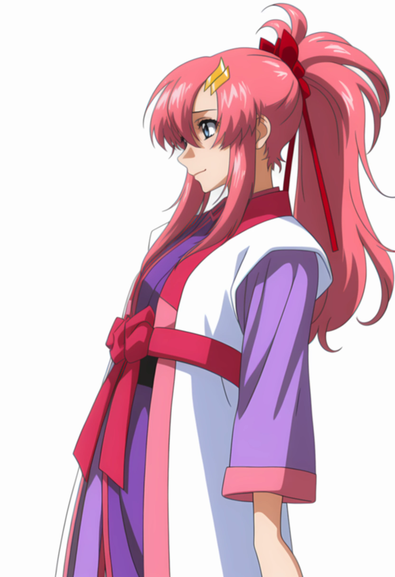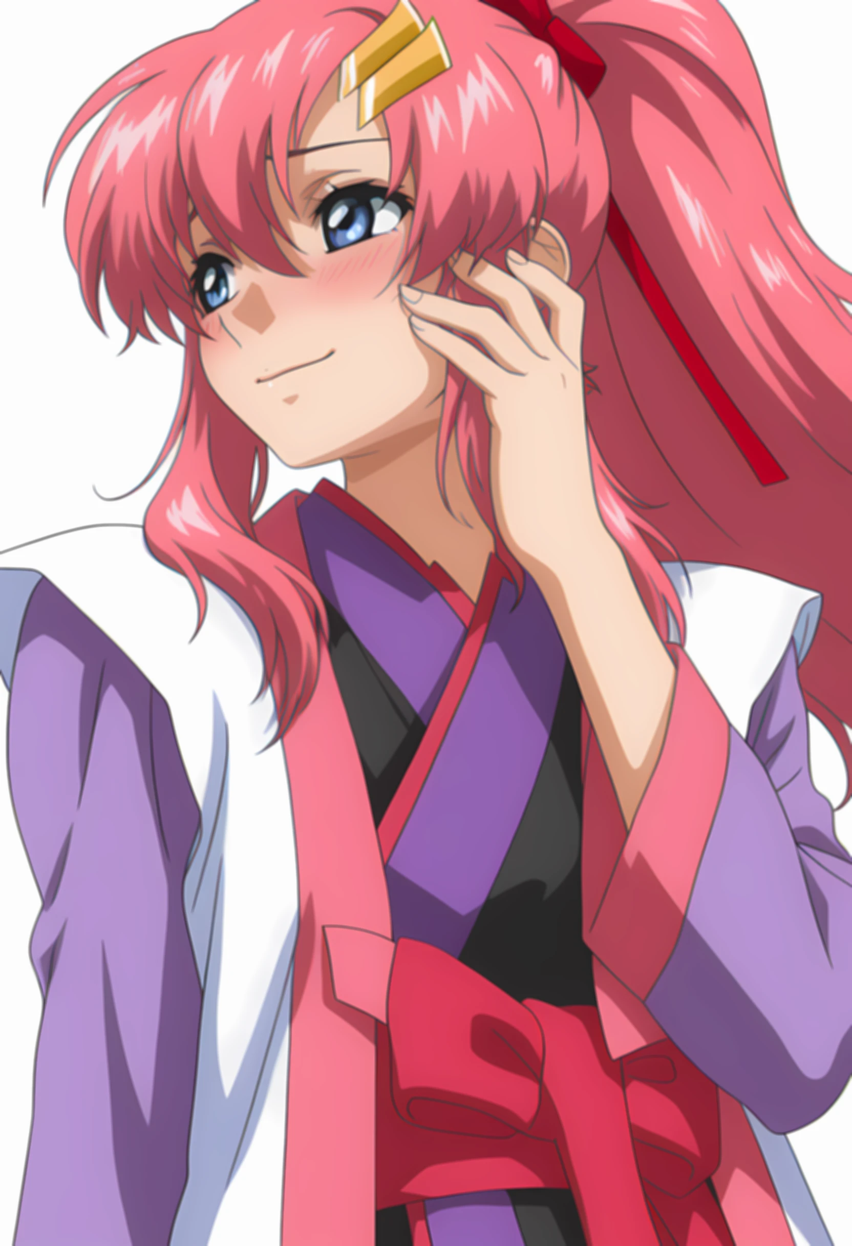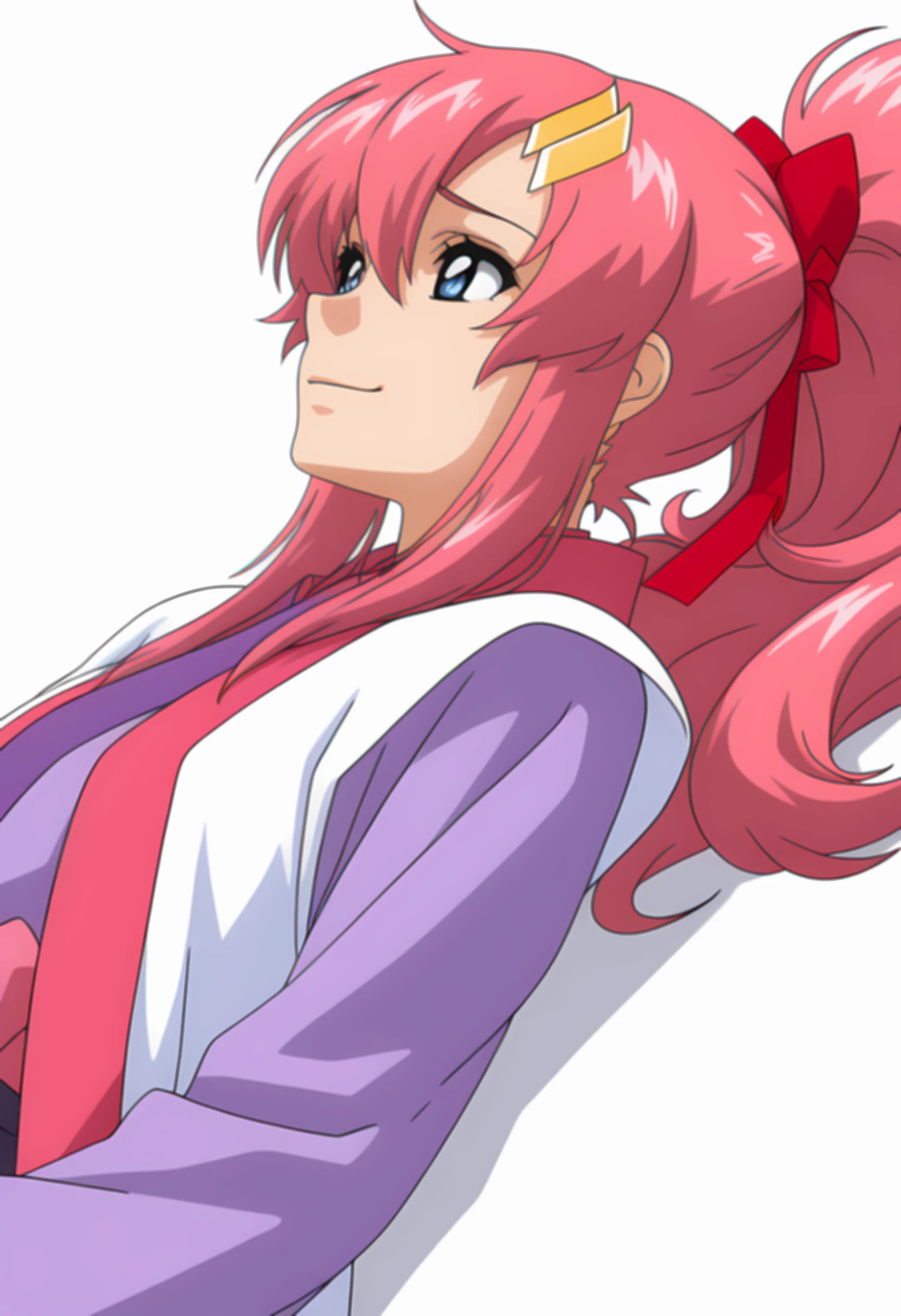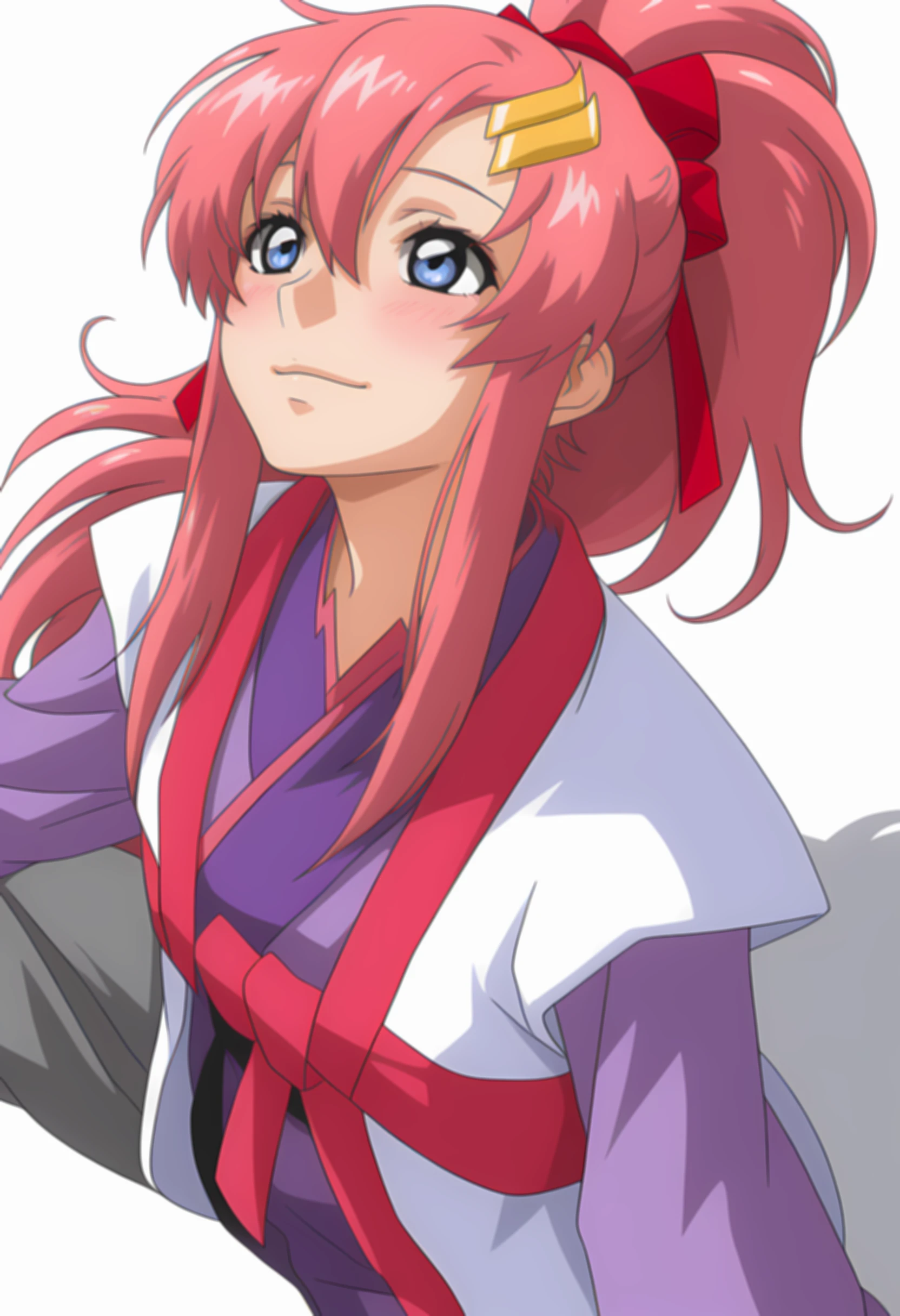,La6us_Cl2ne, long hair, blue eyes, pink hair, hair ornament, hair between eyes,ponytail, ribbon,