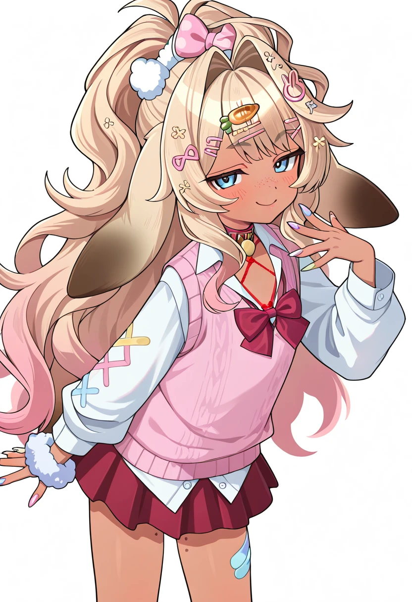 1girl, shibi cottonbum, rabbit girl, lop rabbit ears, dark-skinned female, blue eyes, multicolored hair, blonde hair, wide ponytail, hairbow, hair ornament, hairclip,