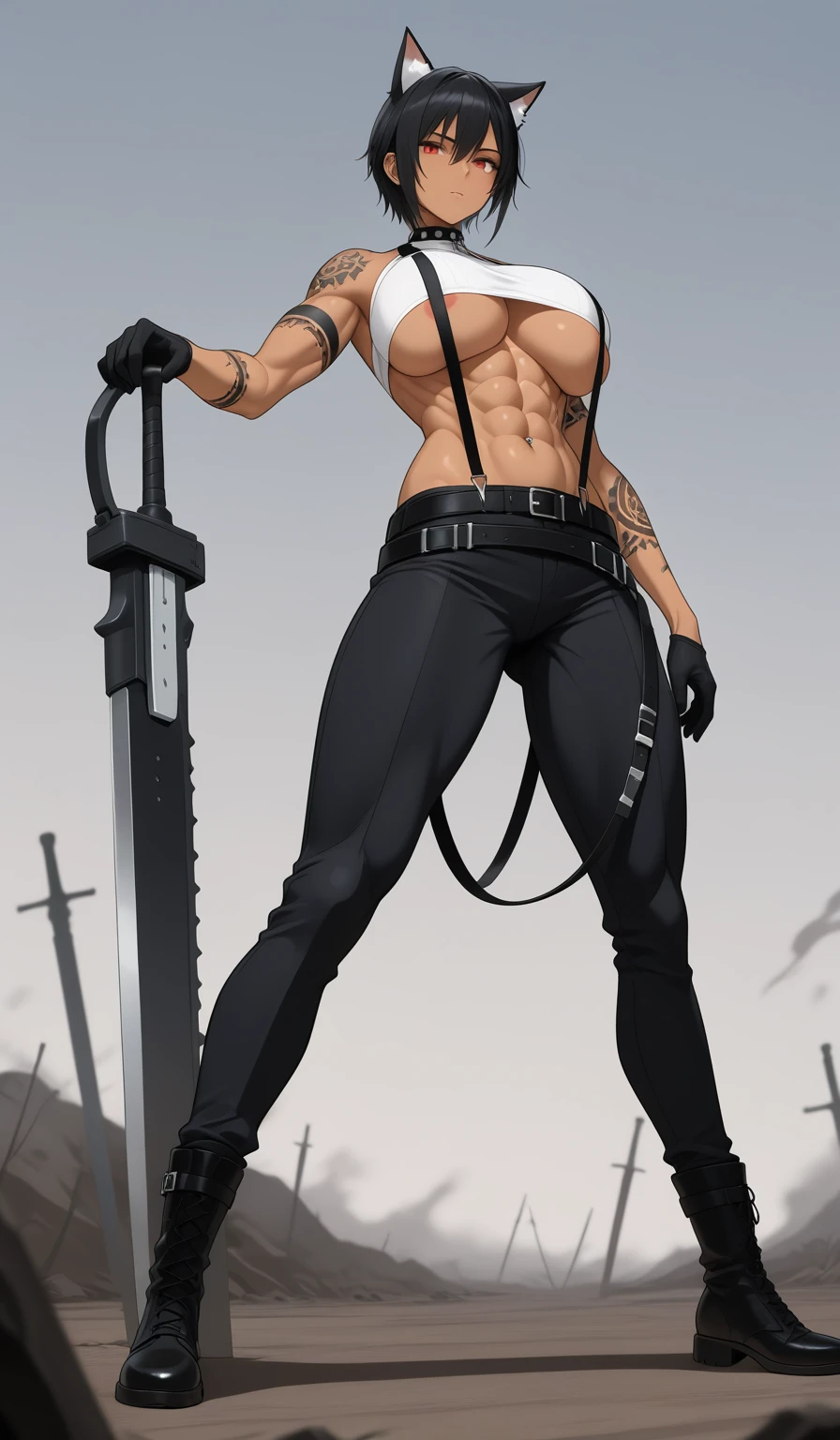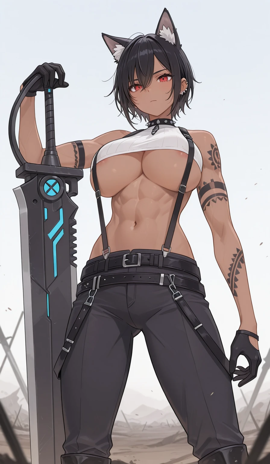 Additional prompts to specify character's appearance if necessery: black hair, wolf ears, red eyes, white crop top, areola slip, black gloves, black boots, dark-skinned female, toned, black pants, underboob, abs, suspenders, belt, midriff, arm tattoo, ear piercing