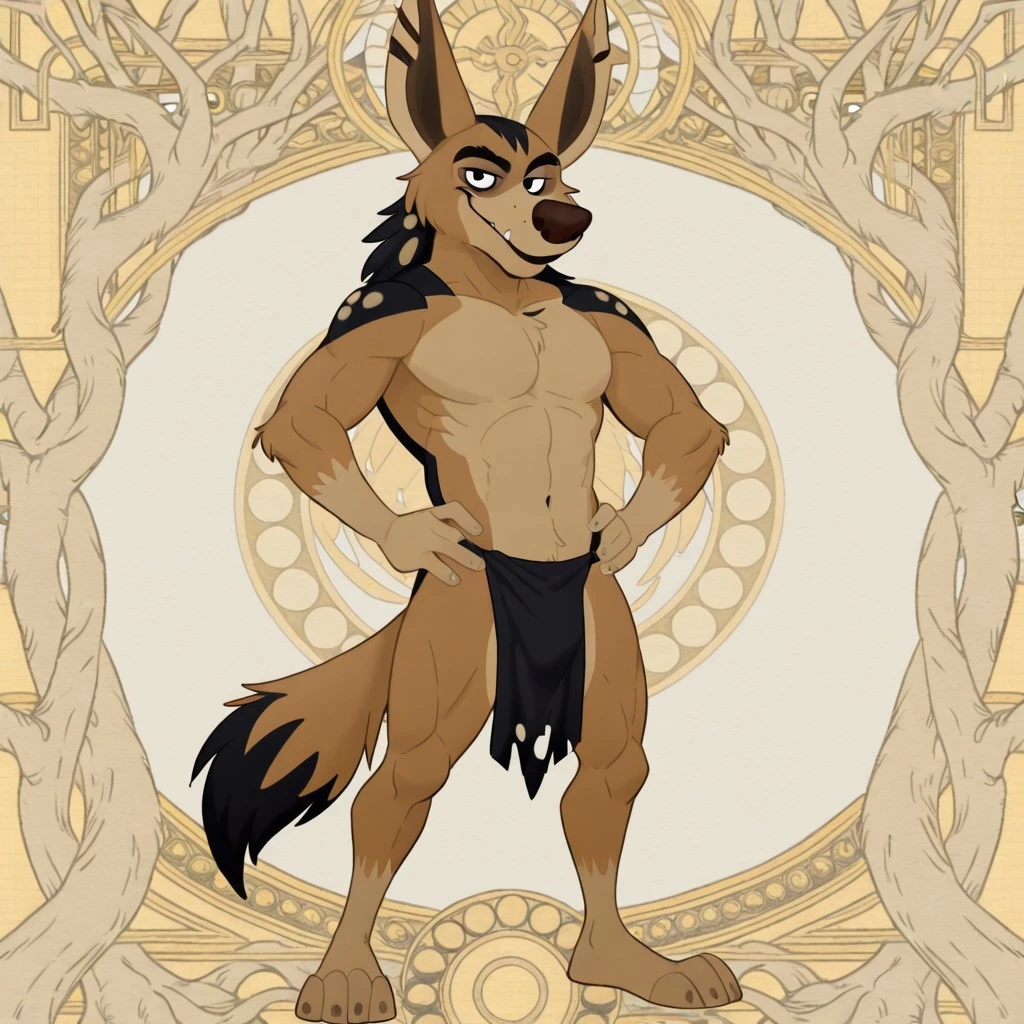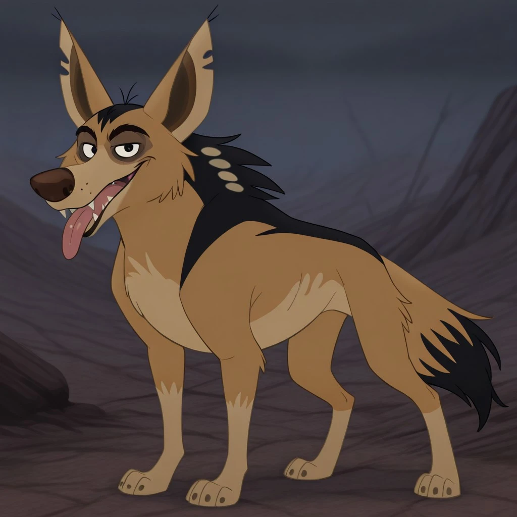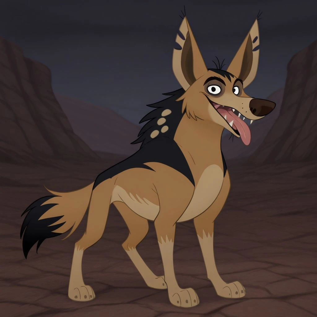 jackal, brown and black fur, Tan snout, tan belly, tan paws, dark brown nose, black eyes, fangs,