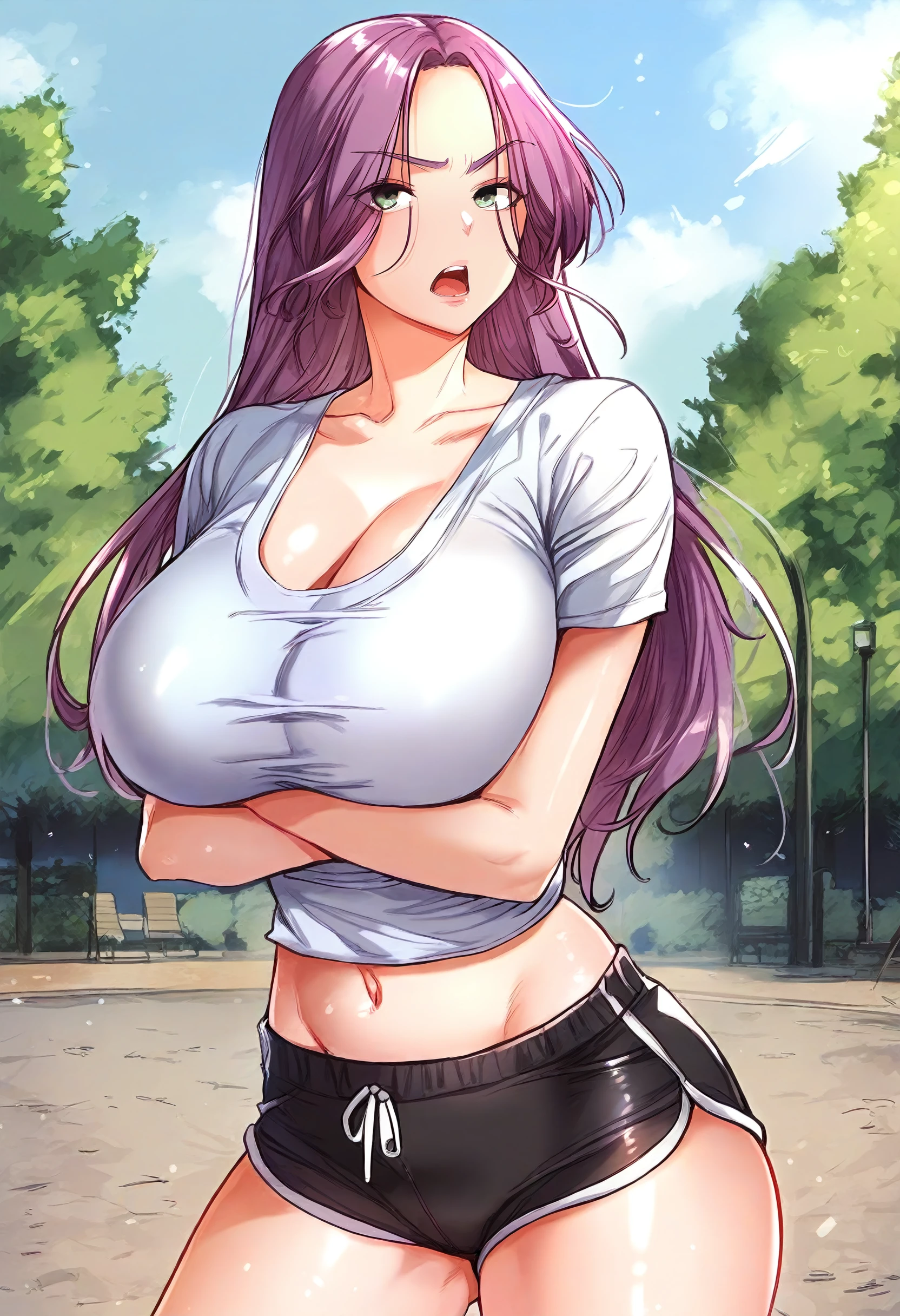 white shirt, t-shirt, cleavage, collarbone, short sleeves, midriff, navel, black shorts, dolphin shorts, short shorts