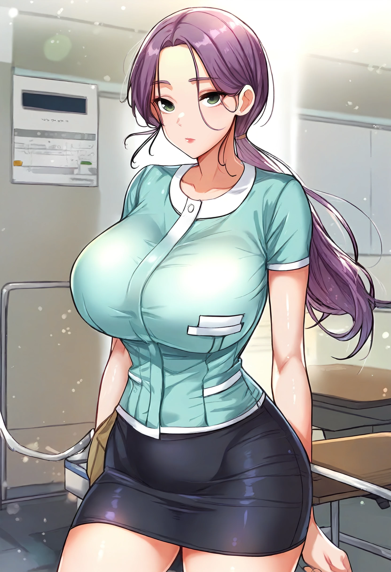 low ponytail, office lady, aqua shirt, collarbone, pocket, short sleeves, black skirt, pencil skirt, miniskirt