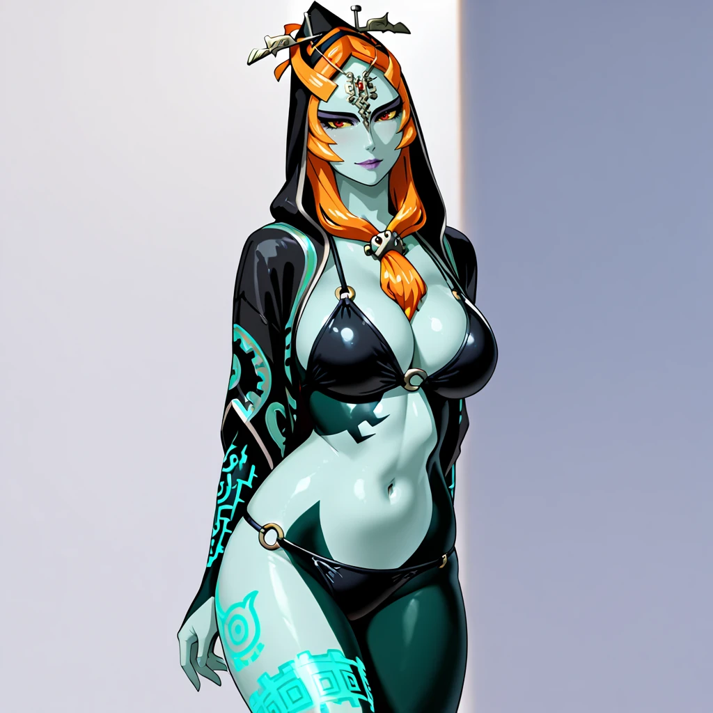 Trigger with bikini: midnabikini, 1girl, midna, large breasts, swimsuit, front ponytail, colored skin, black bikini, o-ring bikini, purple lips, long hair, red eyes, orange hair, cleavage, navel, o-ring bottom, yellow sclera, makeup, lipstick, o-ring top, hair ornament, scrunchie, hood, two-tone skin