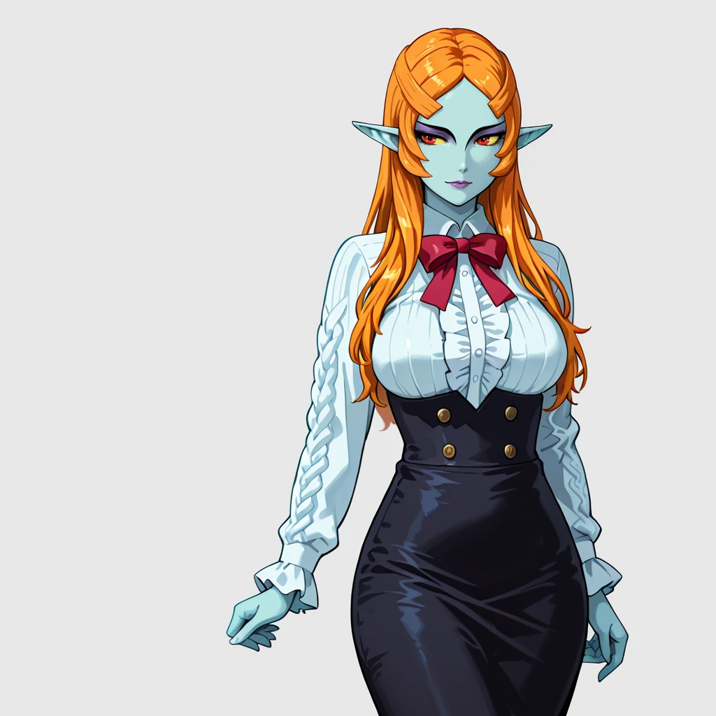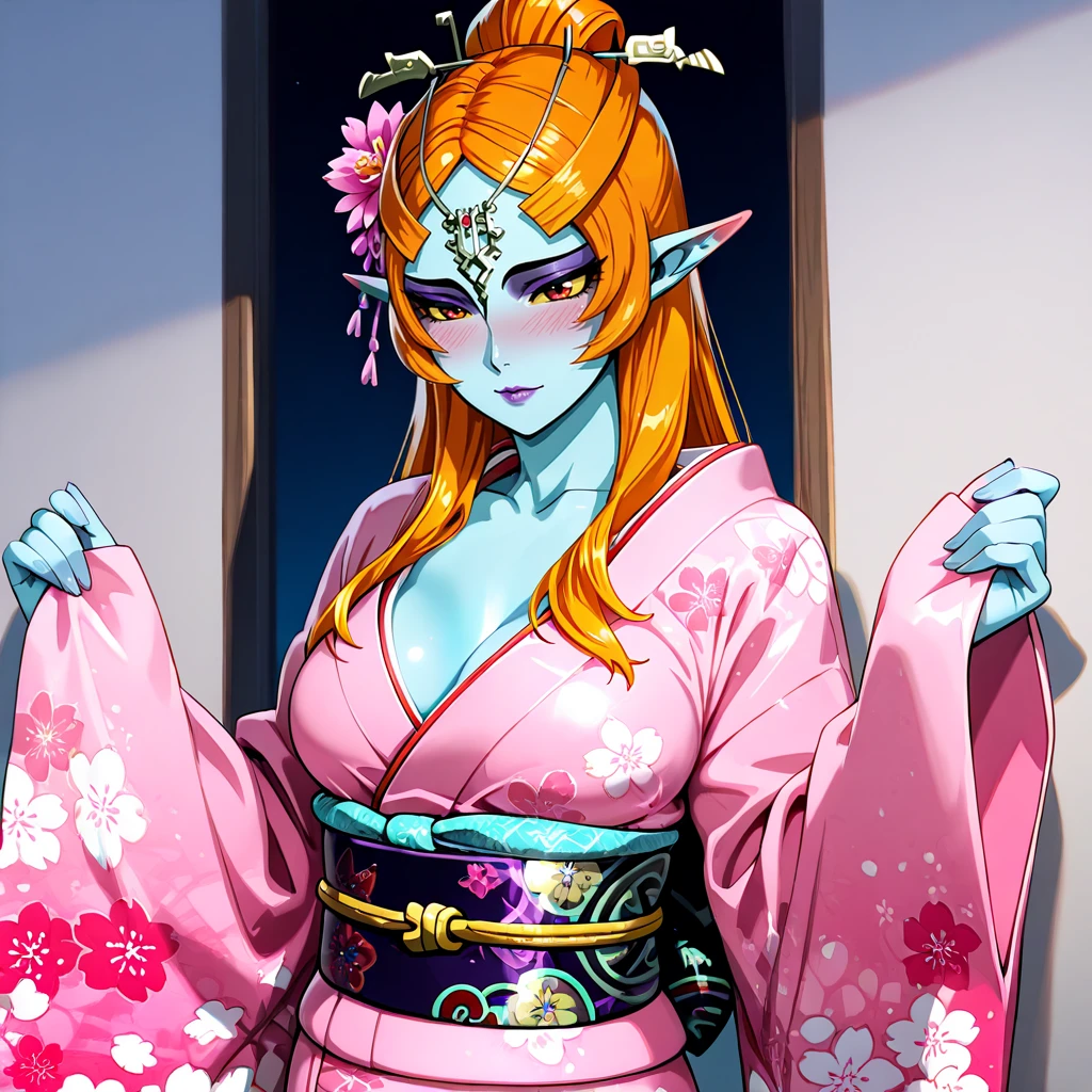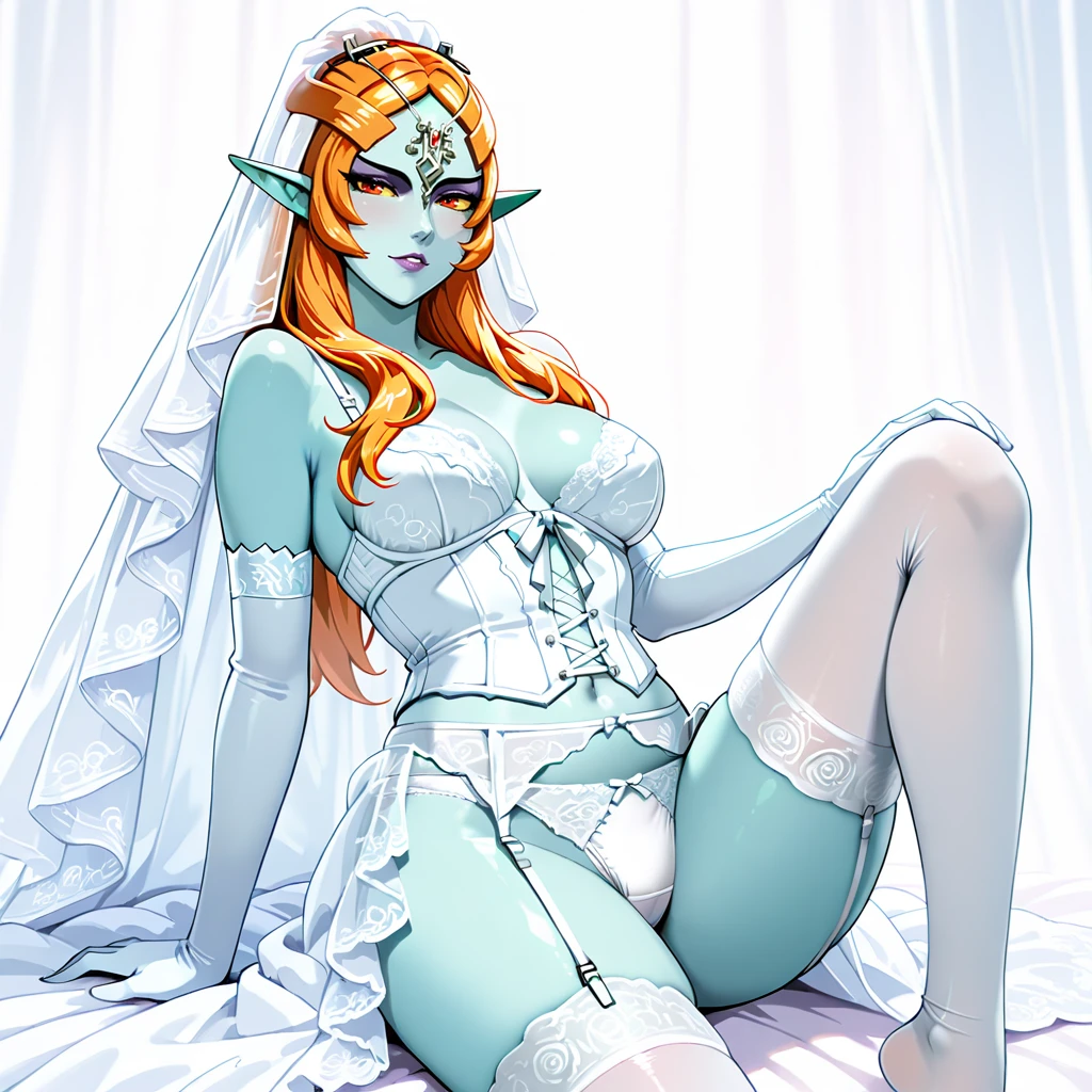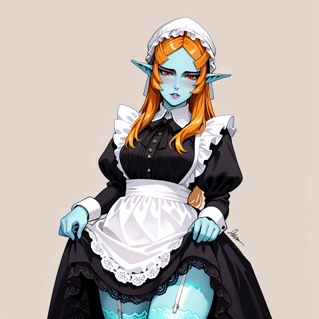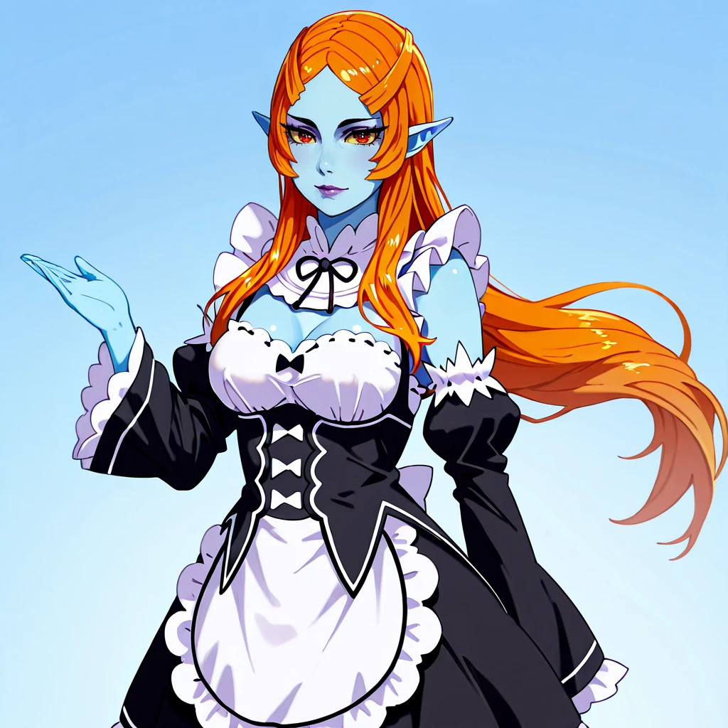 Trigger :midna, 1girl, blue skin, front ponytail, yellow sclera, navel, orange hair, medium breasts, red eyes, two-tone skin, long hair, hood up, purple lips, pelvic curtain, pointy ears, stomach, bridal gauntlets