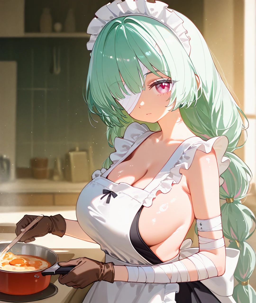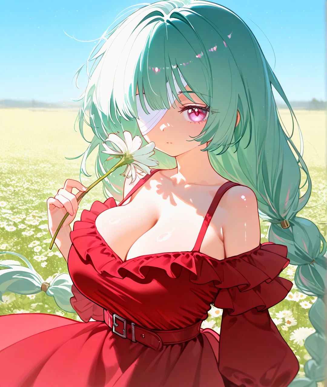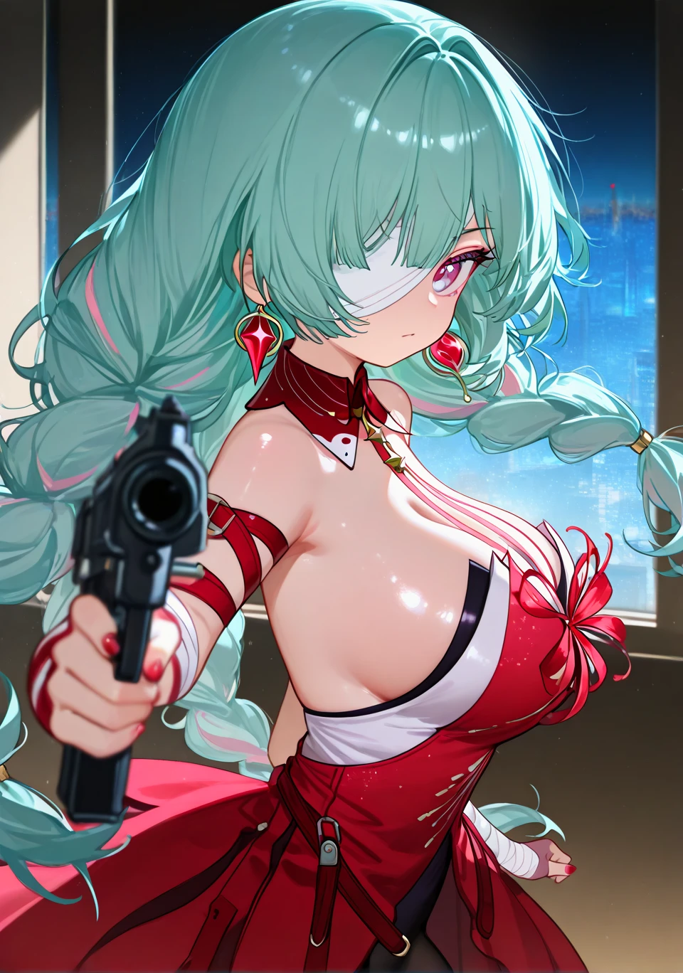 phrolova \(wuthering waves\), official outfit, bandage over one eye, bandaged arm, low twin braids, cyan hair, earrings, jewelry, bare shoulders, assymetrical legwear, red nails, detached collar, red dress, halter dress, red halterneck, black pantyhose, red ribbon,