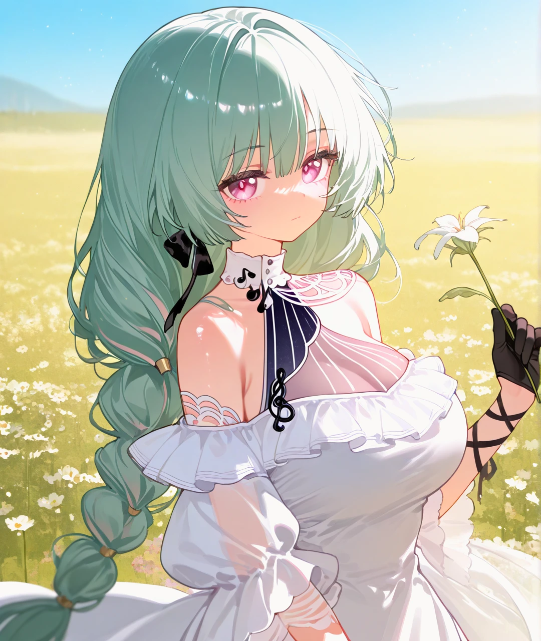 phrolova \(wuthering waves\), lost beyond, white dress, bare shoulders, black gloves, wrist ribbon, black ribbon, half gloves, detached sleeves, musical note ornament, white neckwear