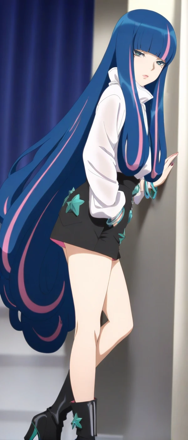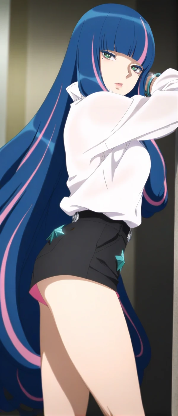 shorts, high heels, jewelry, bracelet, long sleeves, shirt, streaked hair, anime coloring