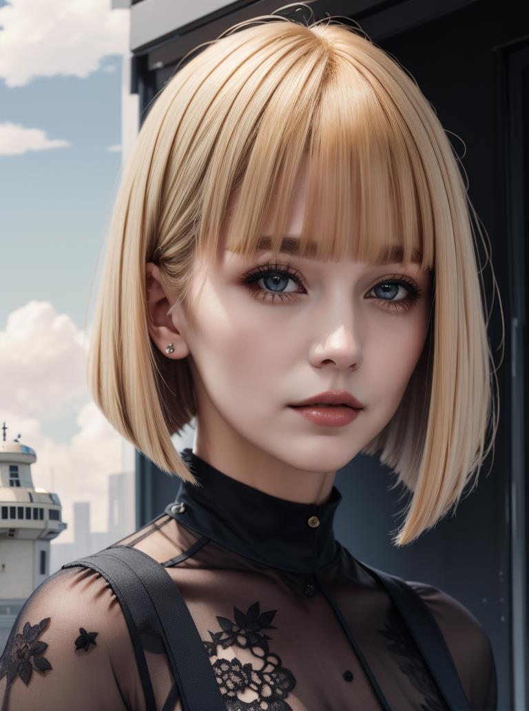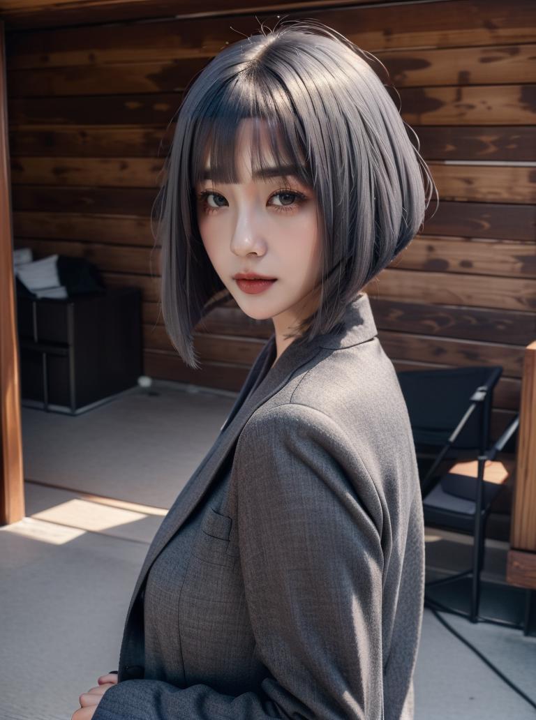 A model for producing variations of the bob hairstyle with blunted bangs and a very sharp cut around the shoulders.
