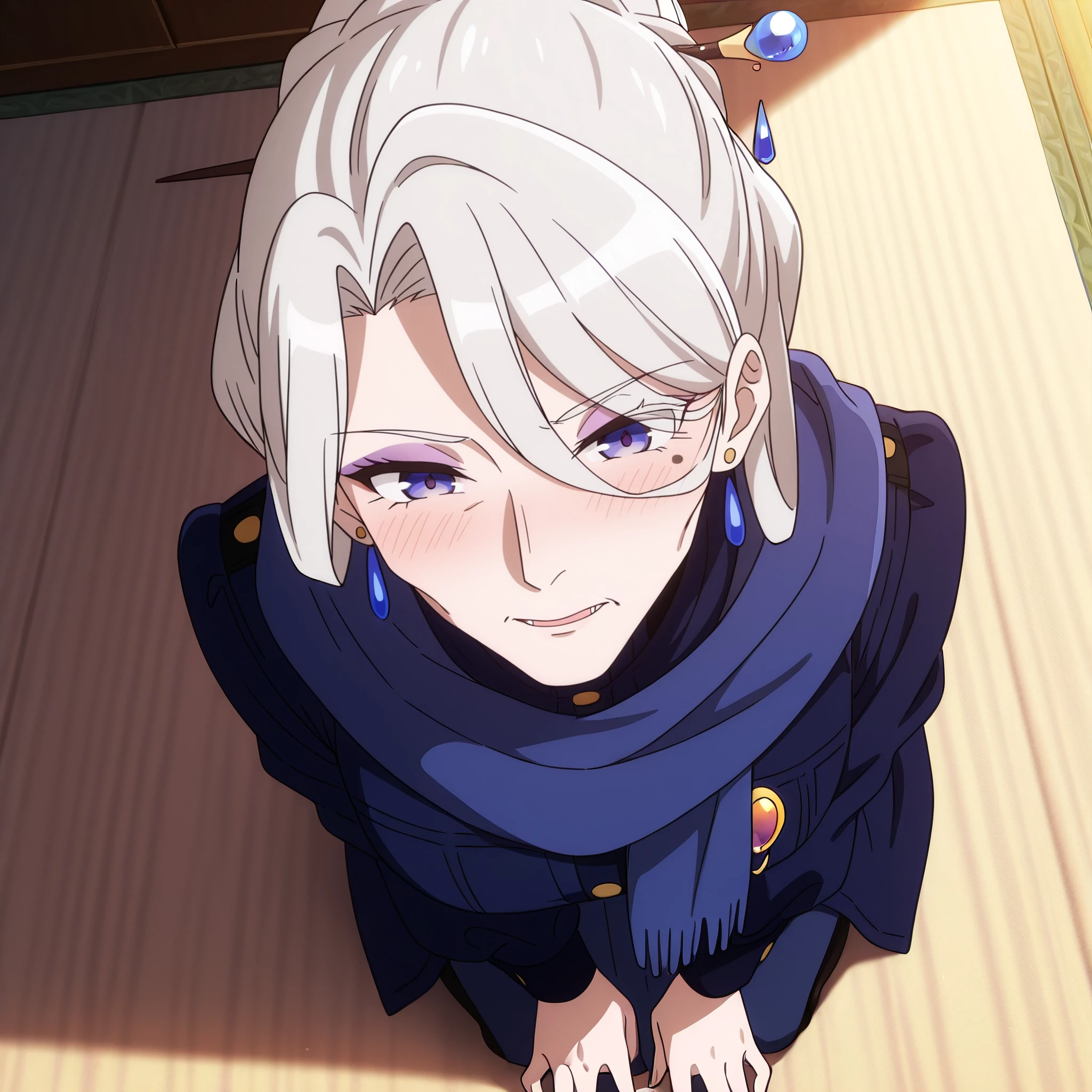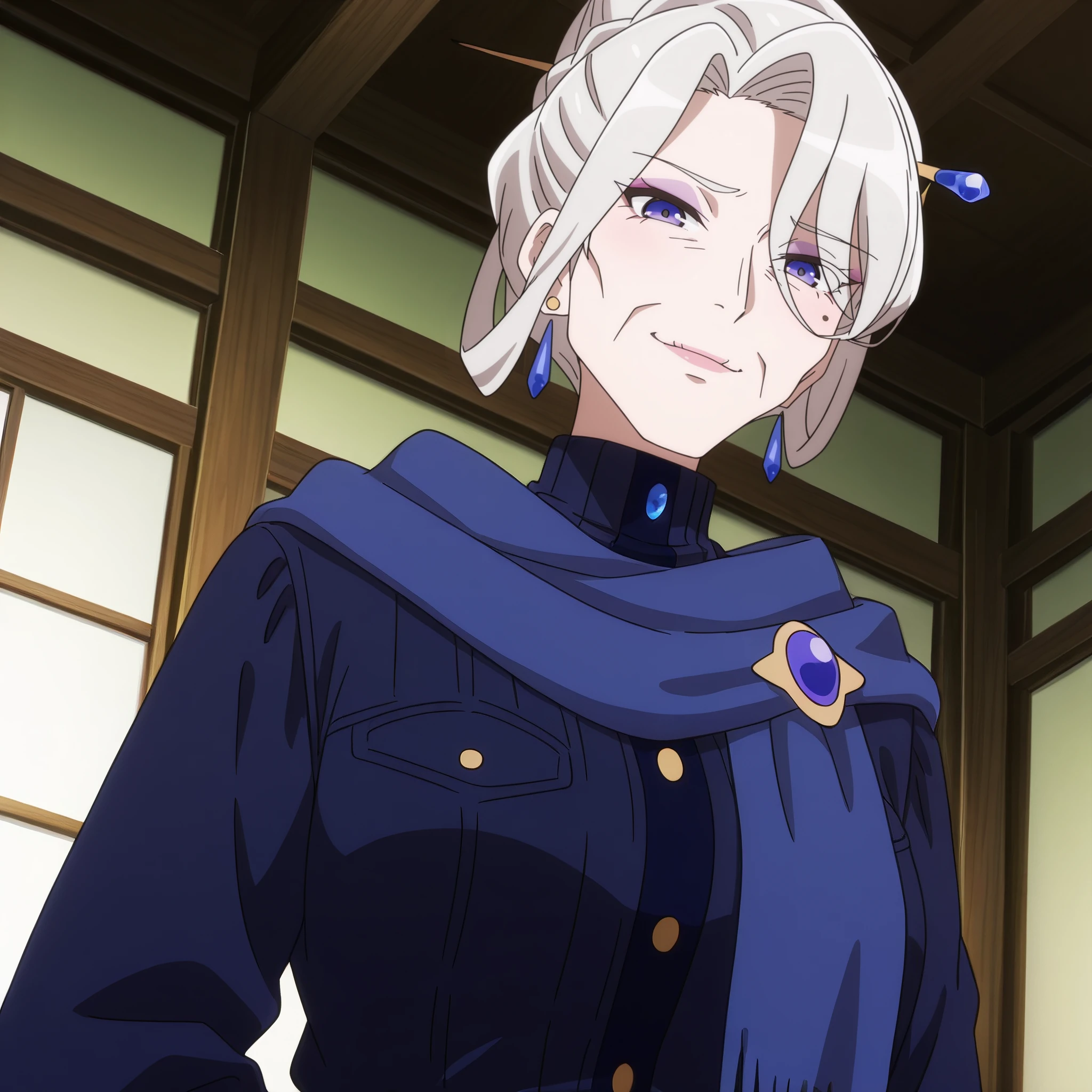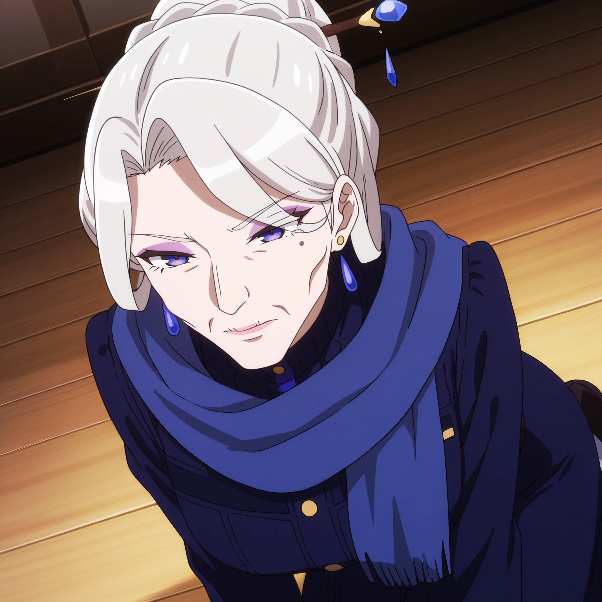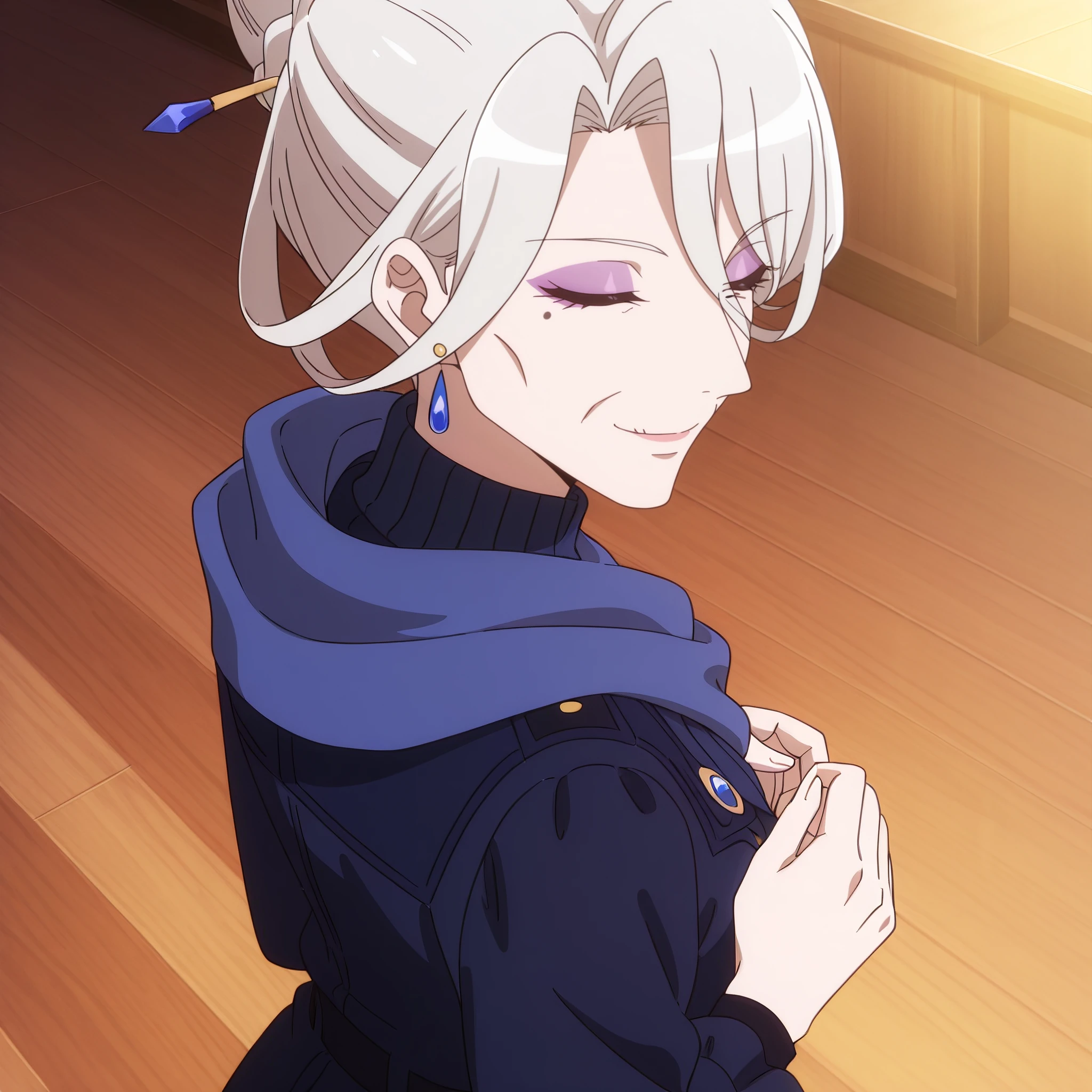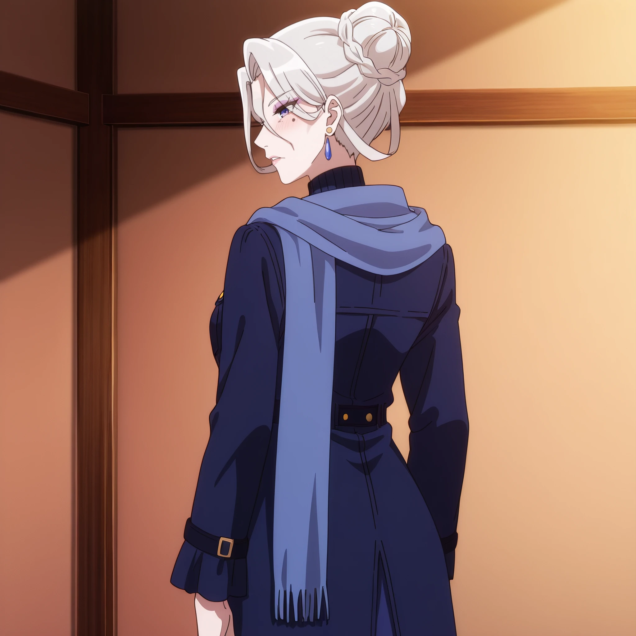 earrings, jewelry, hair ornament, scarf, turtleneck, blue scarf, makeup, high collar, dress, coat, long sleeves, crystal earrings,