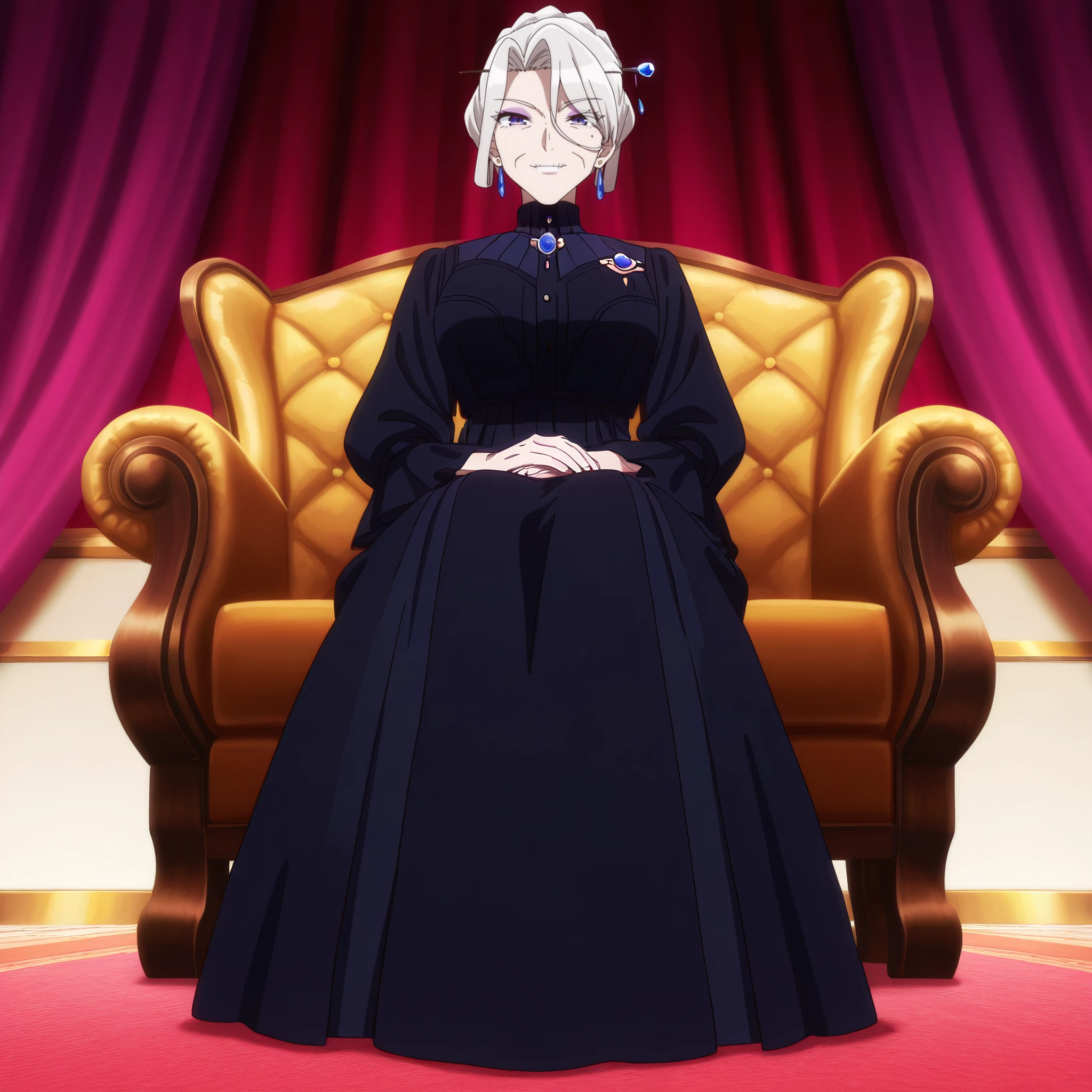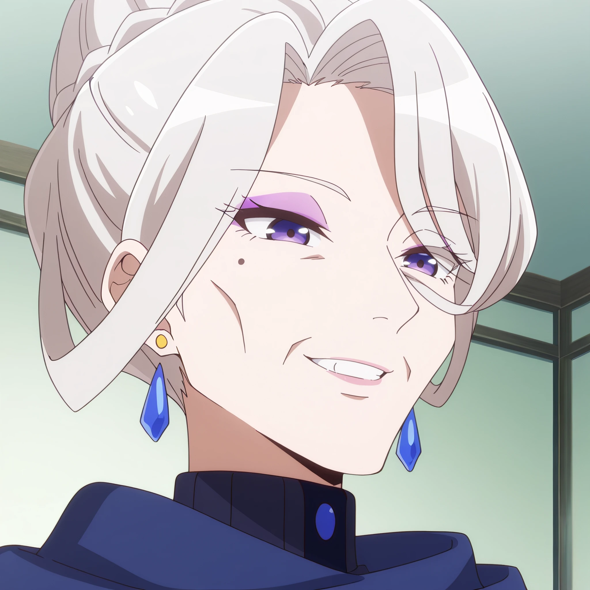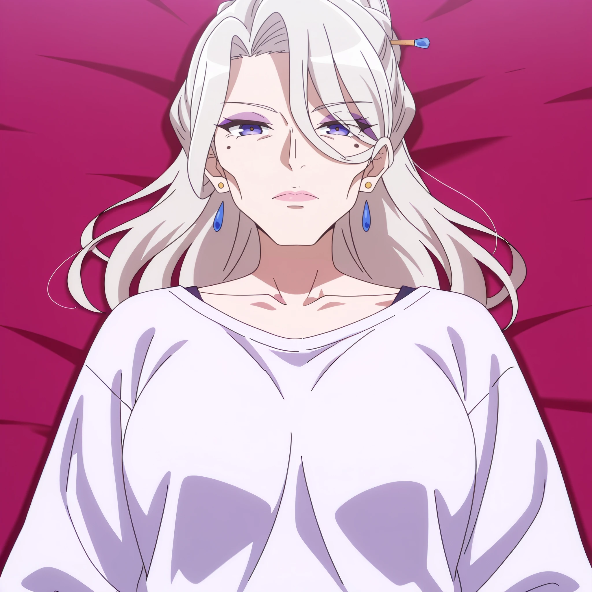 AMGFaust, mole, purple eyes, bangs, long hair, eyebrows visible through hair, white hair, hair bun, braid, hair between eyes,