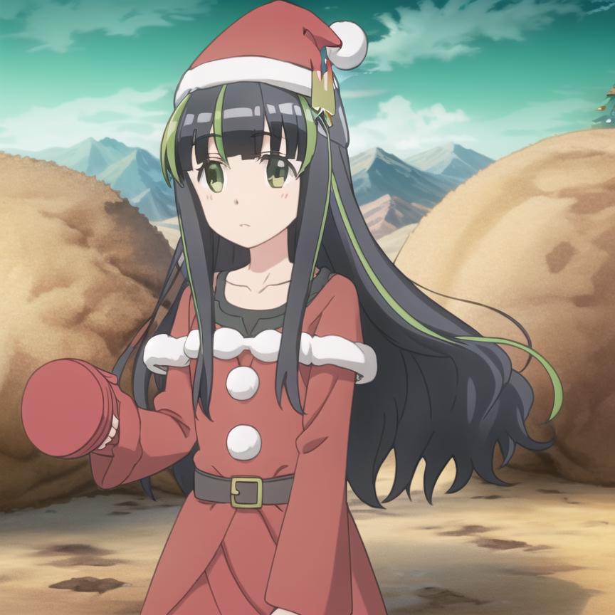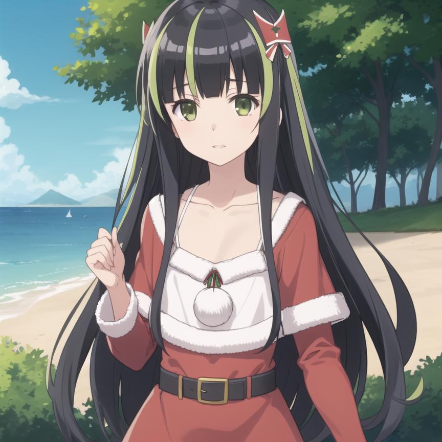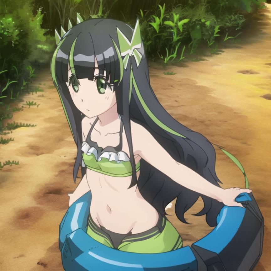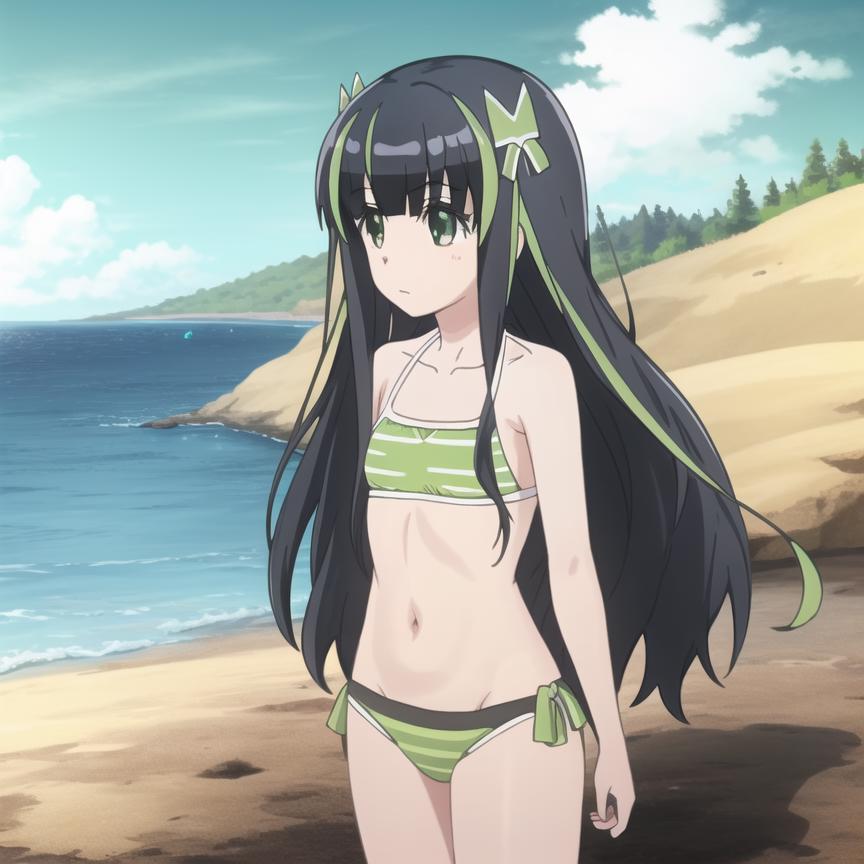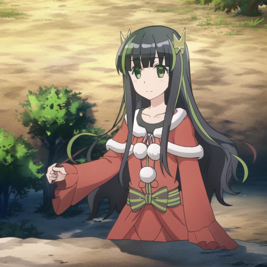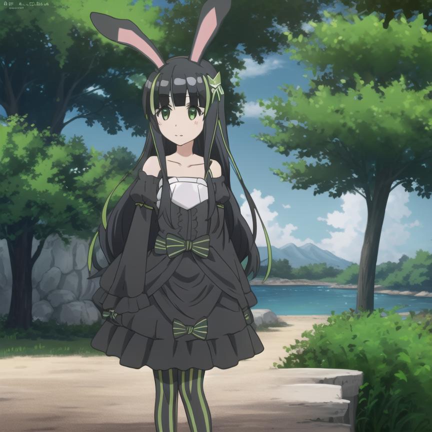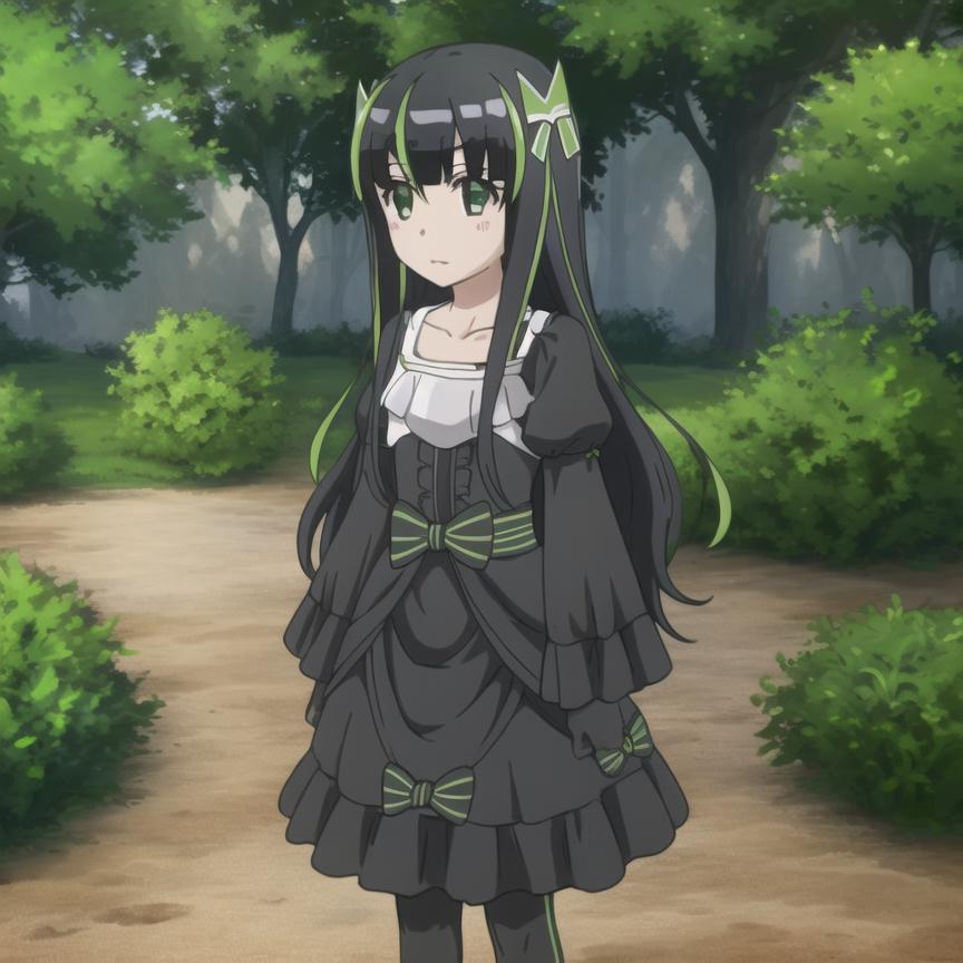 Trigger Word: bofuri-may, black dress, black pantyhose, vertical stripes, green stripes, black hair, two-tone hair, multicolored hair