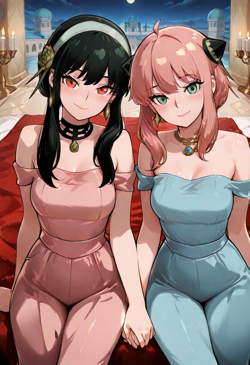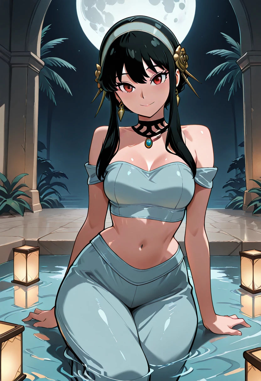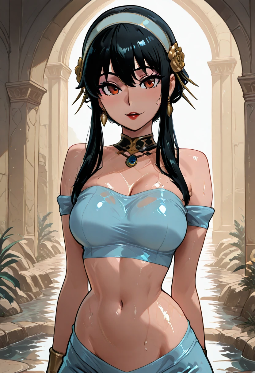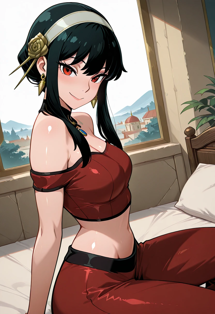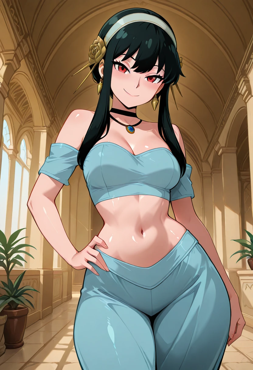 zzYor, red eyes, black hair, short hair with long locks, sidelocks, necklace, earrings, hairband, off-shoulder shirt, blue shirt, midriff, sleeveless, blue pants, arabian clothes,