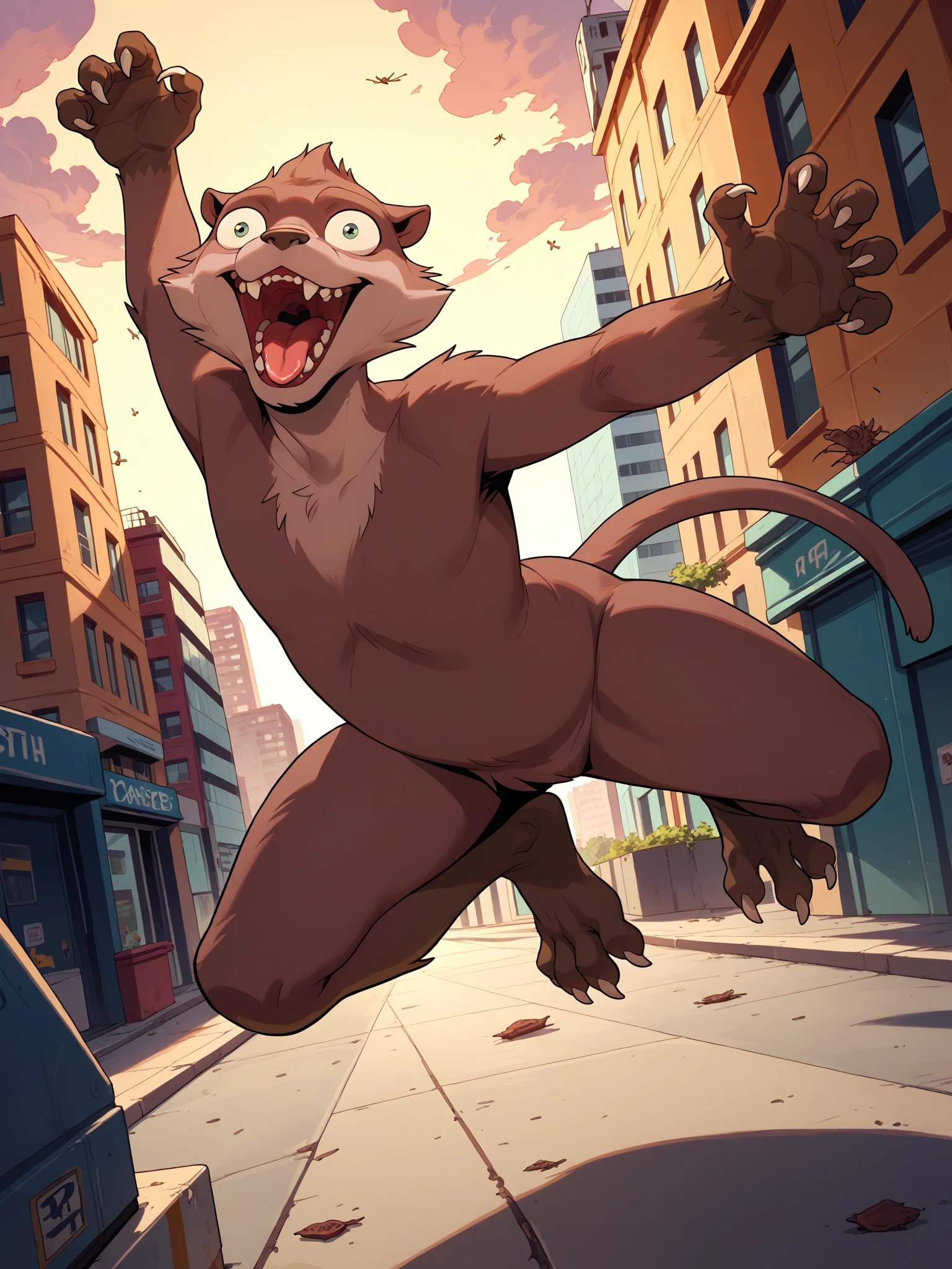 Add-ons: 1boy, solo, furry male, brown fur, tail, claws, bug-eyed, teeth, (???? or shirt)