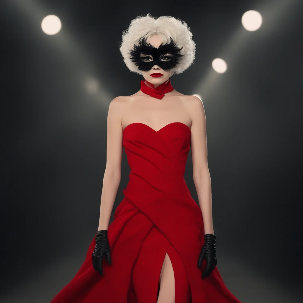 emstne, half black white hair, cruella, two-tone hair, red dress, mask,