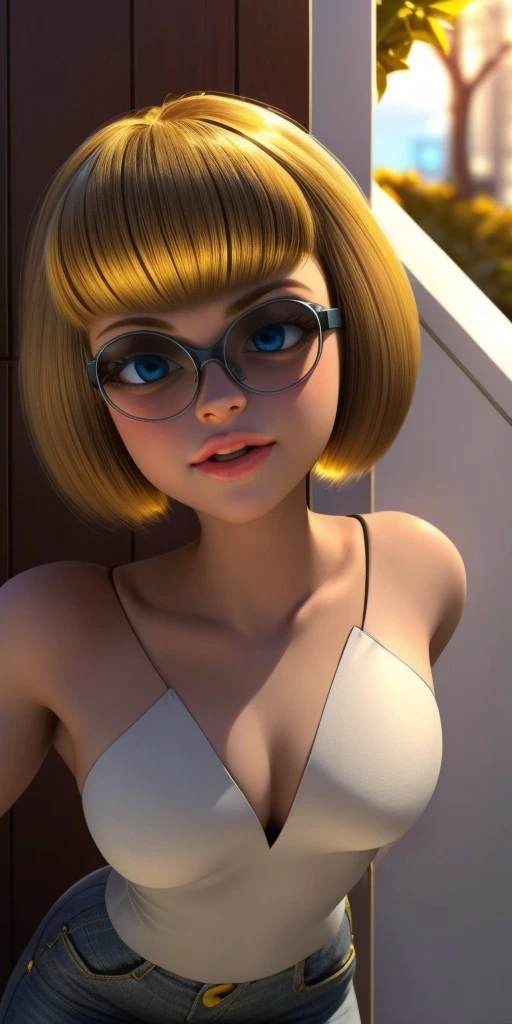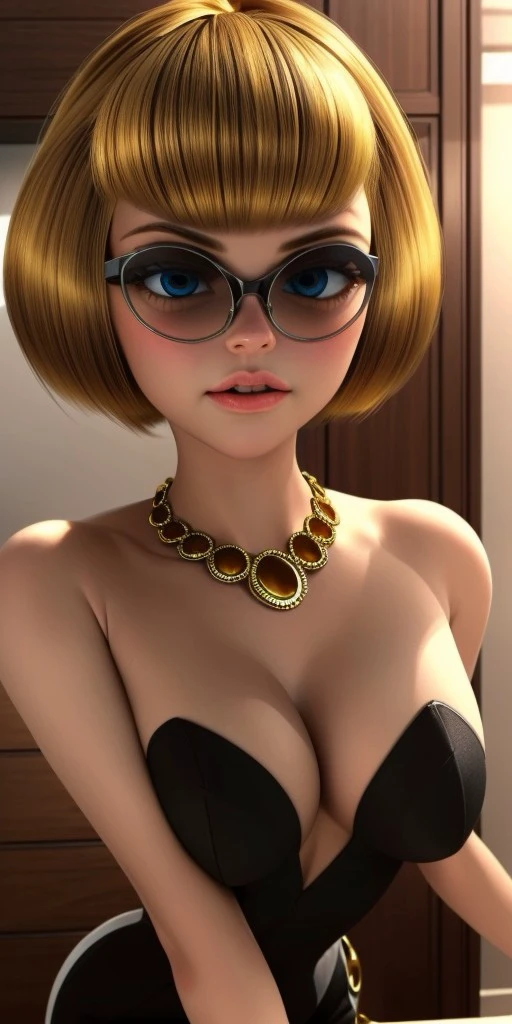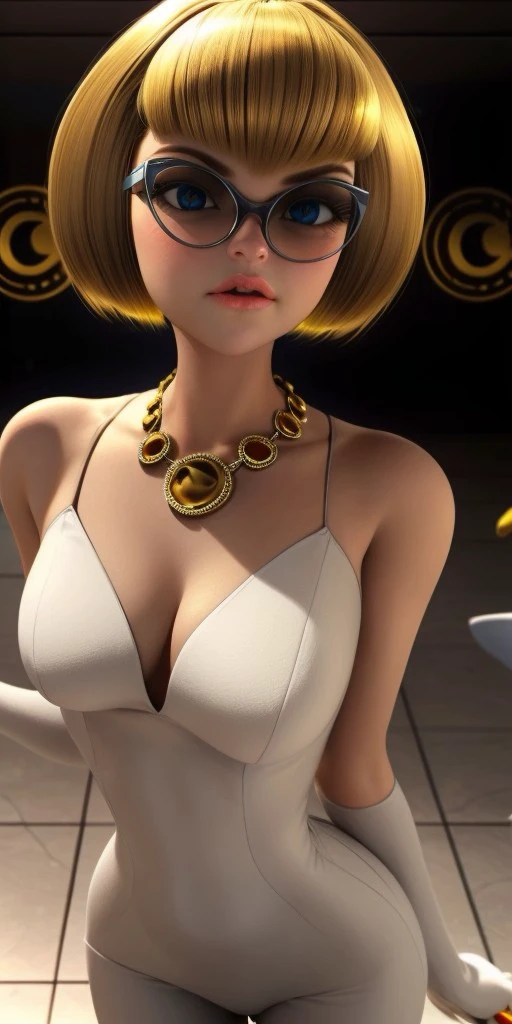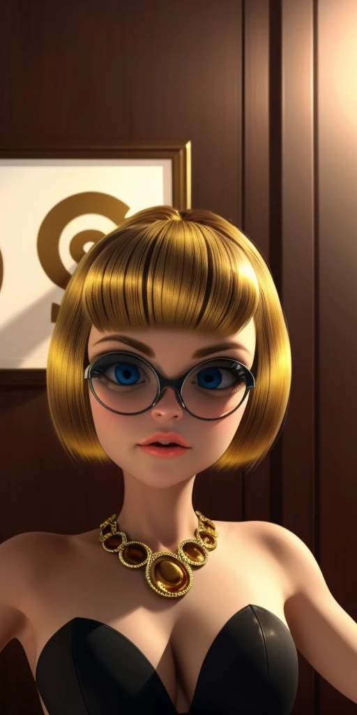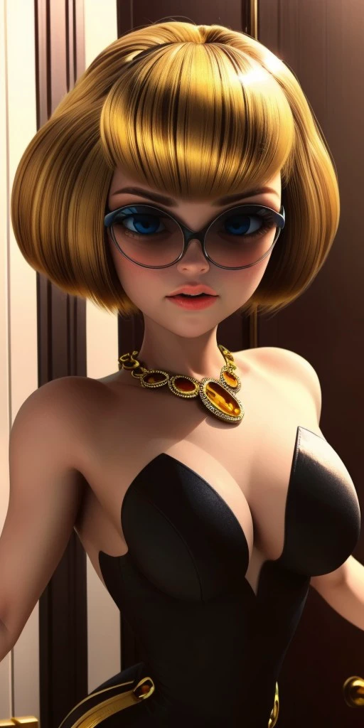 golden-blonde hair that is cut into a sharp bob with short bangs that frame her face