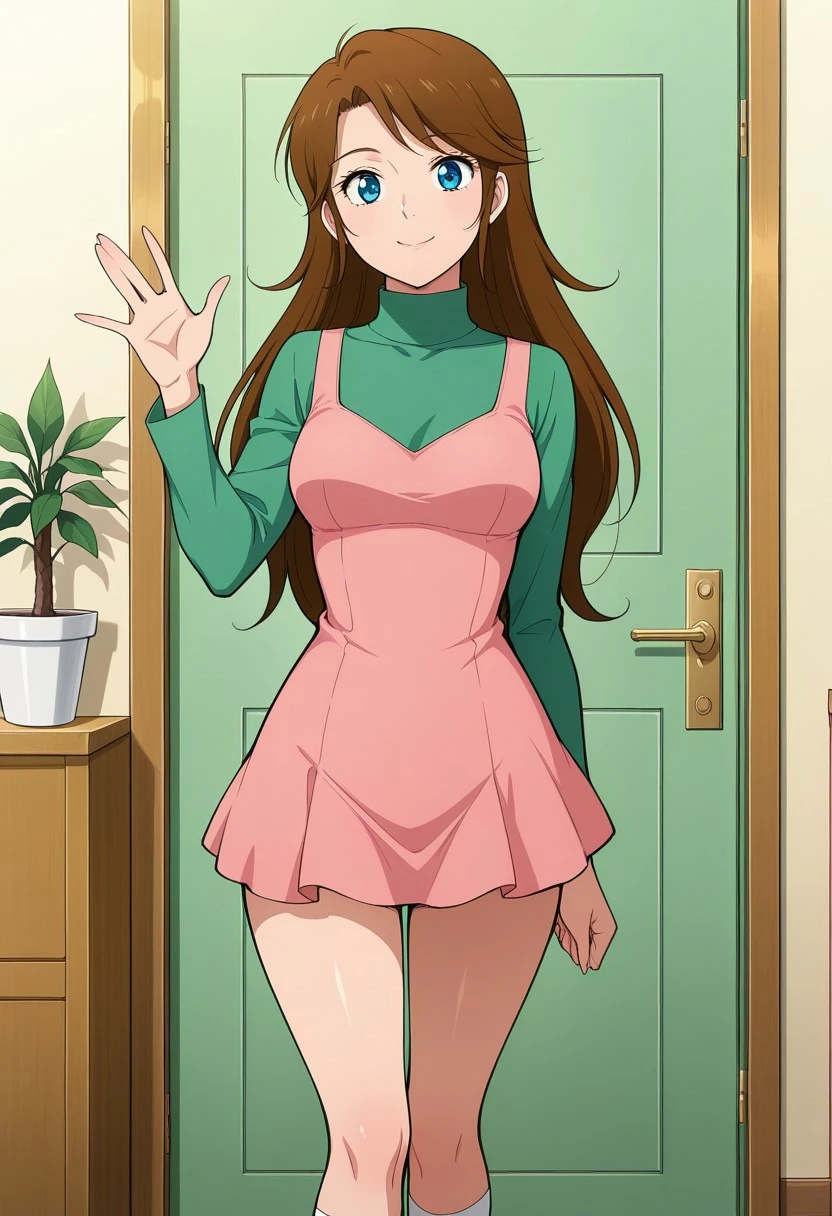CLOTHES 2: turtleneck,green shirt,pink one-piece dress,long sleeves,brown boots,