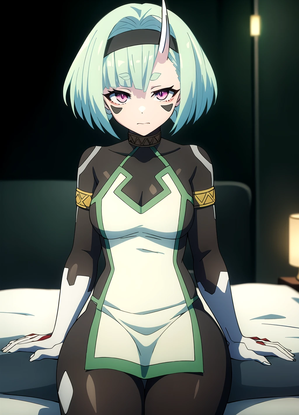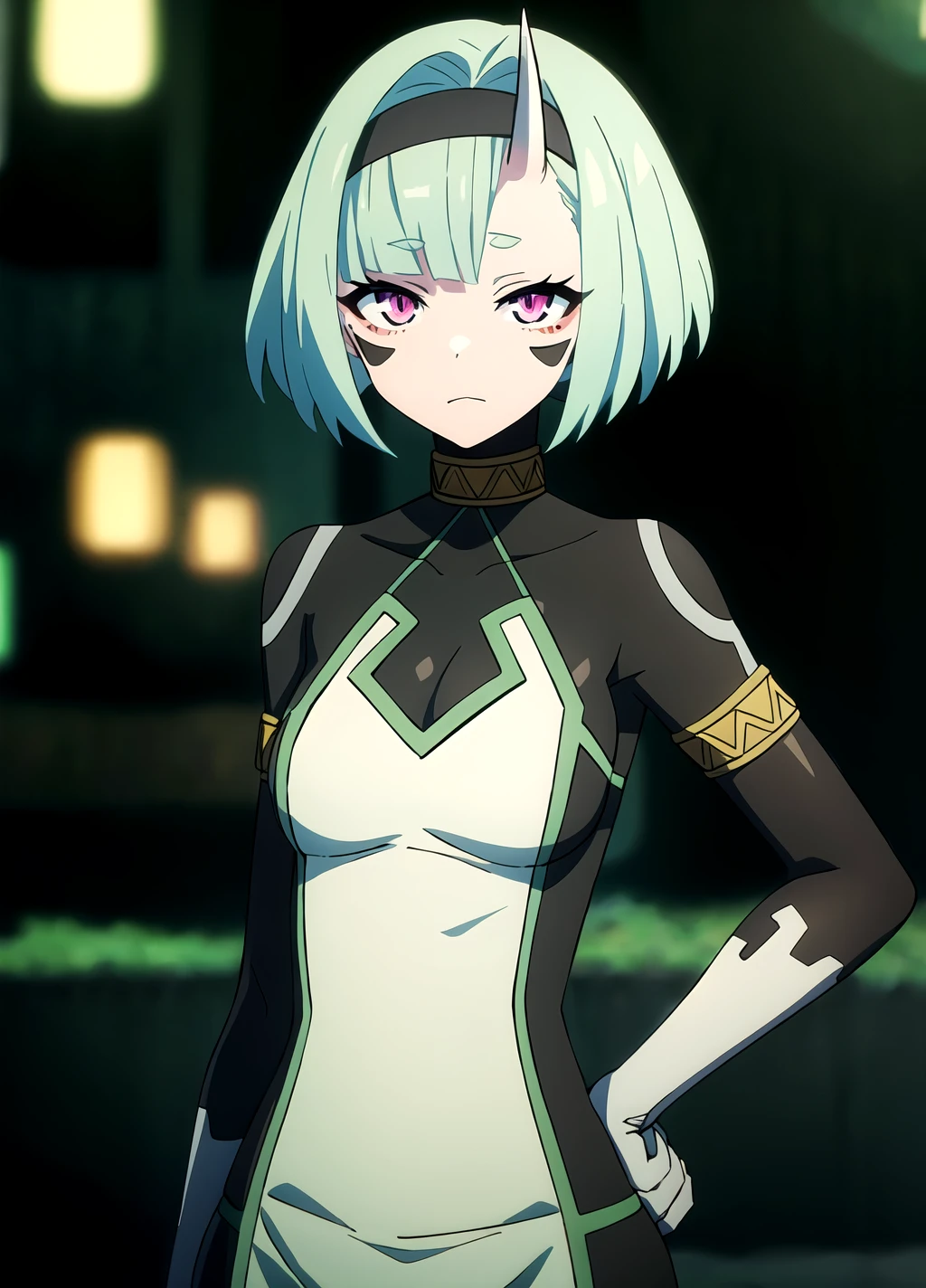 Trigger Words: Koko Zenibako, black skin color, 1girl, solo, horns, short hair, dress, breasts, hairband, facial mark, green hair, pink eyes, colored skin