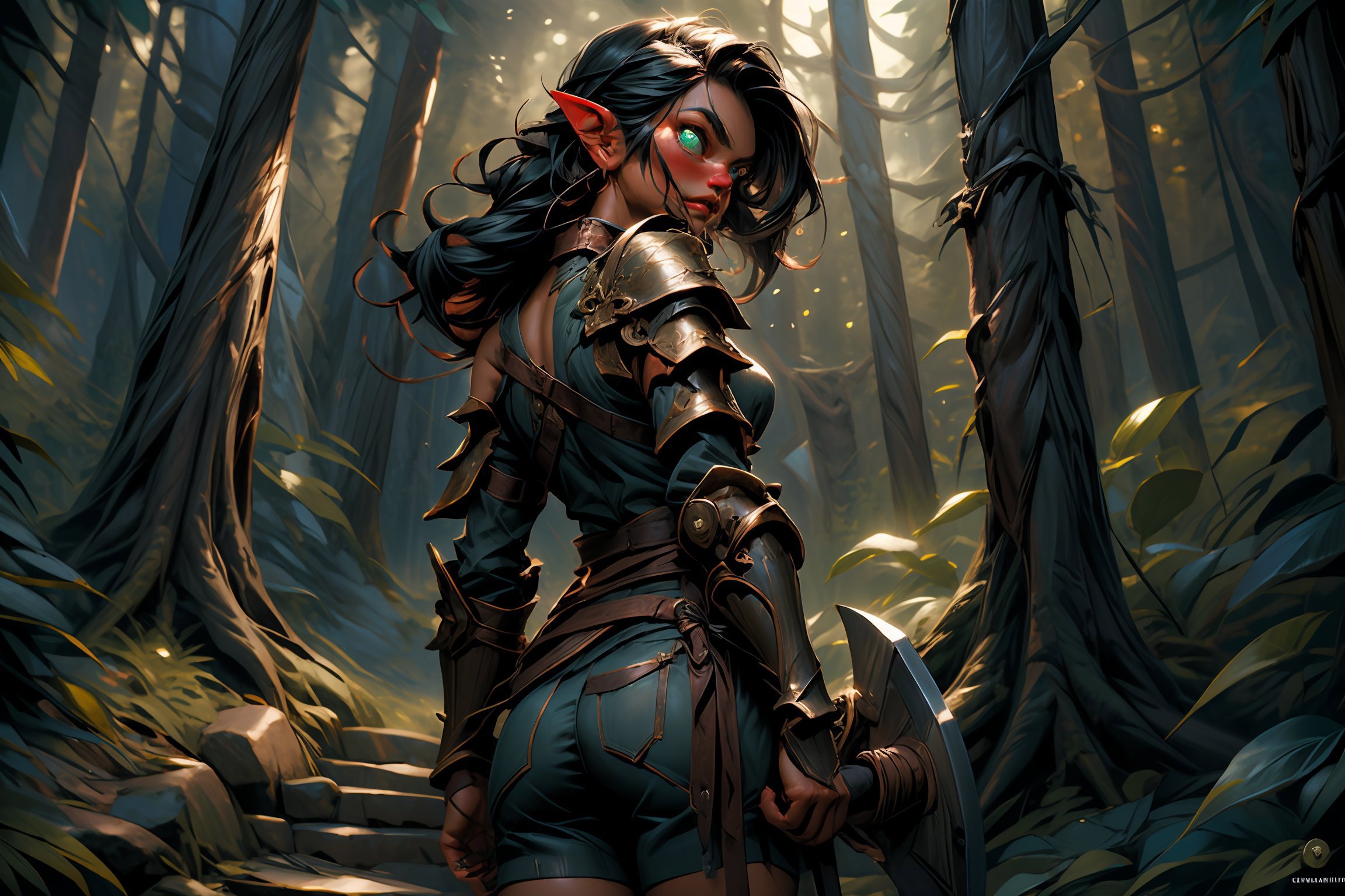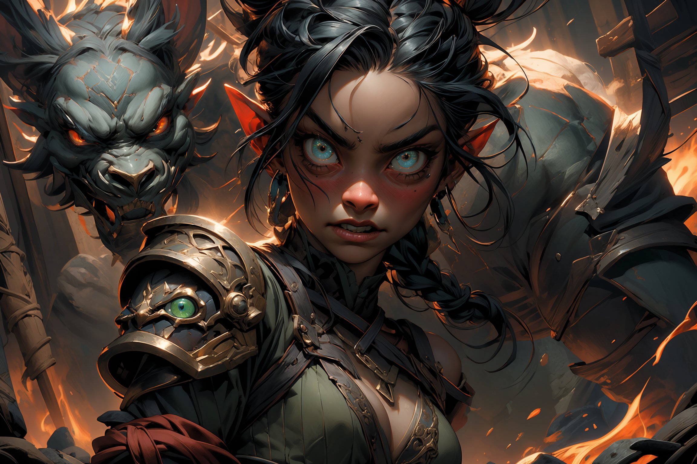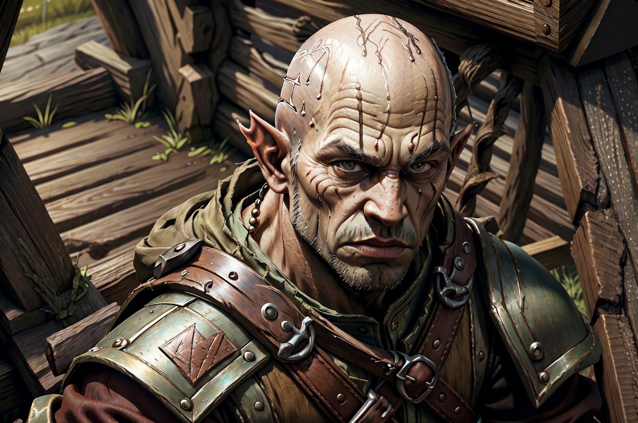 1boy, 1girl, alcohol, armor, bald, beard, beer, belt, black hair, blood, blue eyes, blurry, blurry background, braid, breastplate, breasts, brown eyes, brown hair, candle, cape, chainmail, cleavage, closed mouth, colored skin, cup, elf, facial hair, fur trim, gloves, glowing, glowing eyes, green eyes, grey hair, holding, holding cup, holding sword, holding weapon, indoors, jewelry, lips, long hair, looking at viewer, male focus, manly, mug, muscular, necklace, old, old man, one eye closed, orc, outdoors, pauldrons, pointy ears, pouch, rain, realistic, red eyes, red hair, ring, scar, scar on face, shoulder armor, sitting, solo, solo focus, statue, sword, table, twin braids, upper body, weapon, white hair, wrinkled skin, yellow eyesDescription
