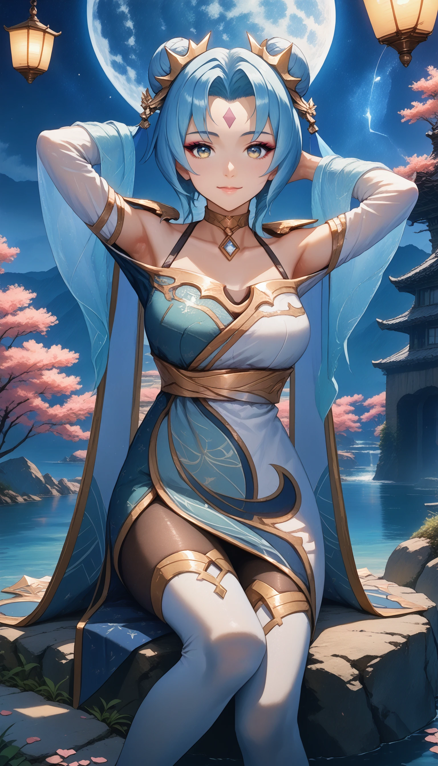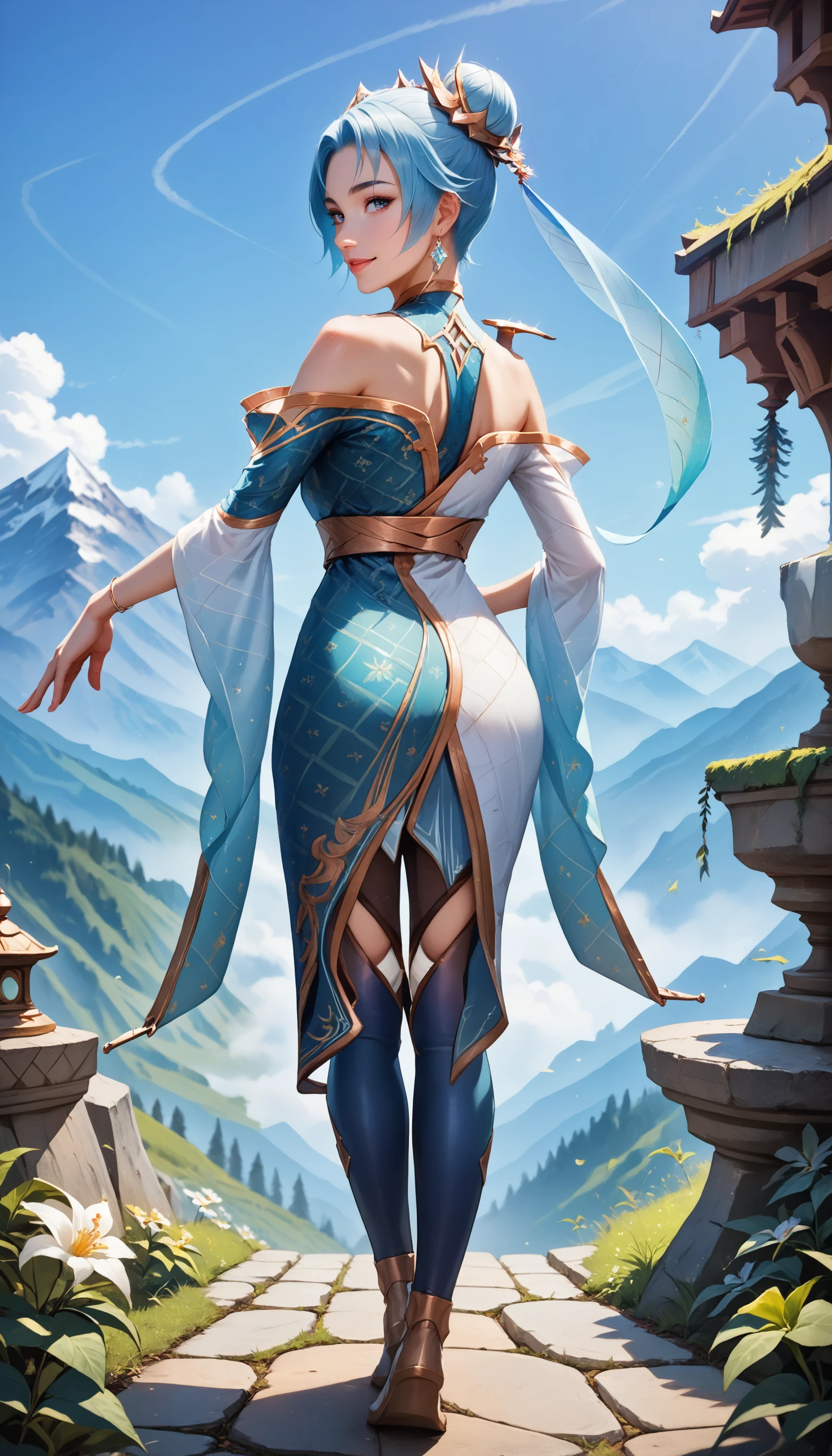 prestige immortal journey sona, score_9, 1girl, short blue hair, hair ornament, bangs, hair bun, pantyhose, light blue thigh boots, long wide sleeves, multicolored chinese dress, bare shoulders, collarbone, forehead mark, yellow eyes, makeup, choker, long hair ribbons, cape,