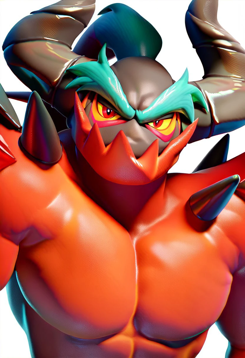yellow sclera, red eyes, horns, shoulder spikes,