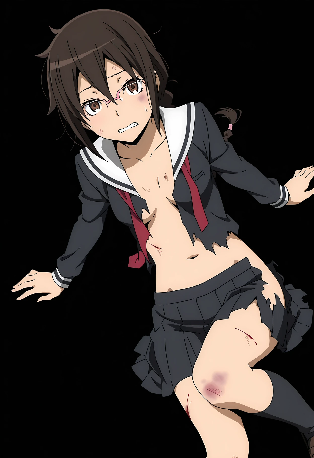 red necktie, school uniform, black serafuku, white sailor collar, long sleeves, black skirt, pleated skirt, black socks, kneehighs, loafers