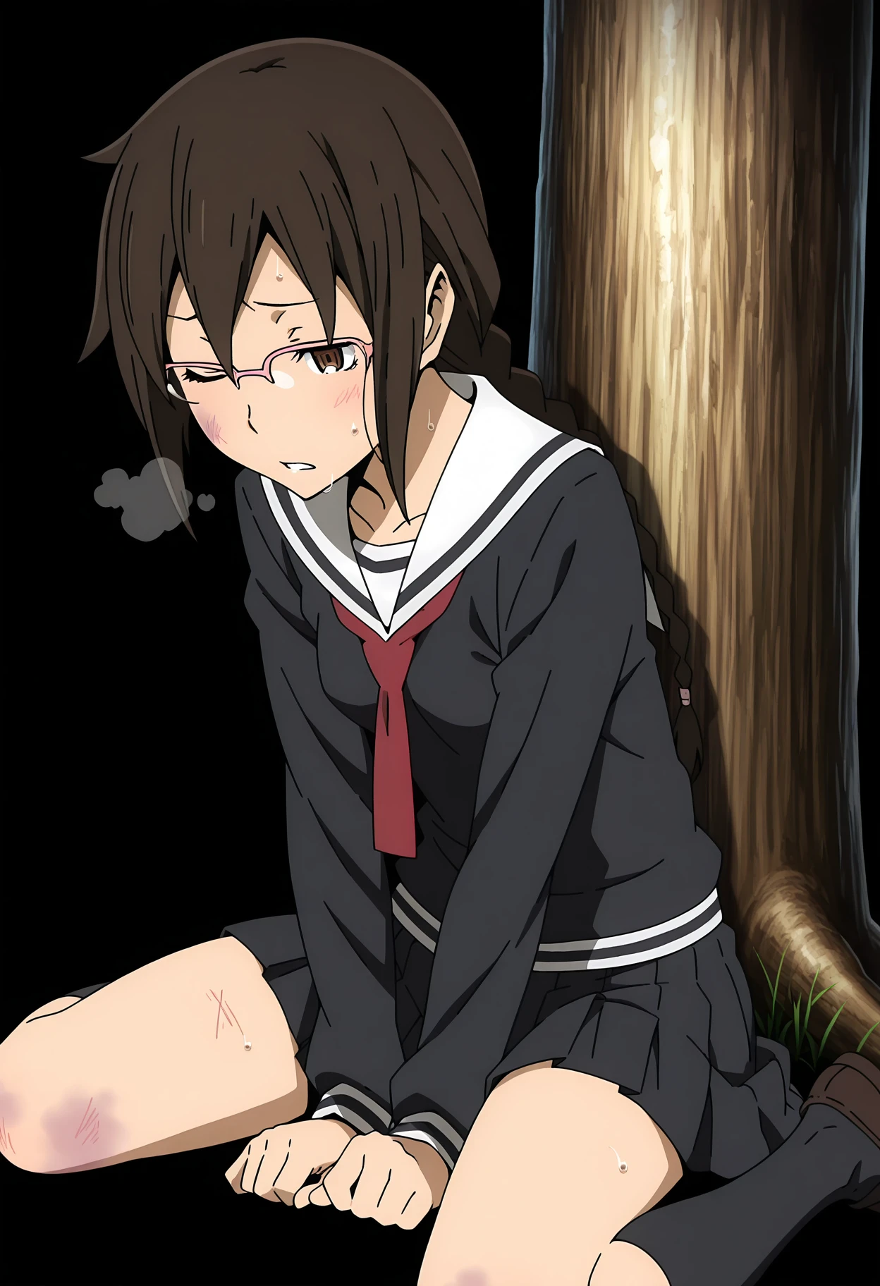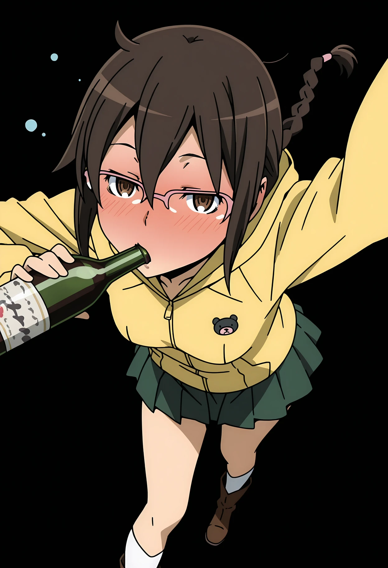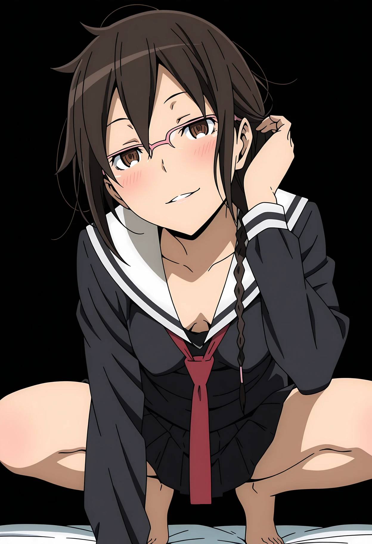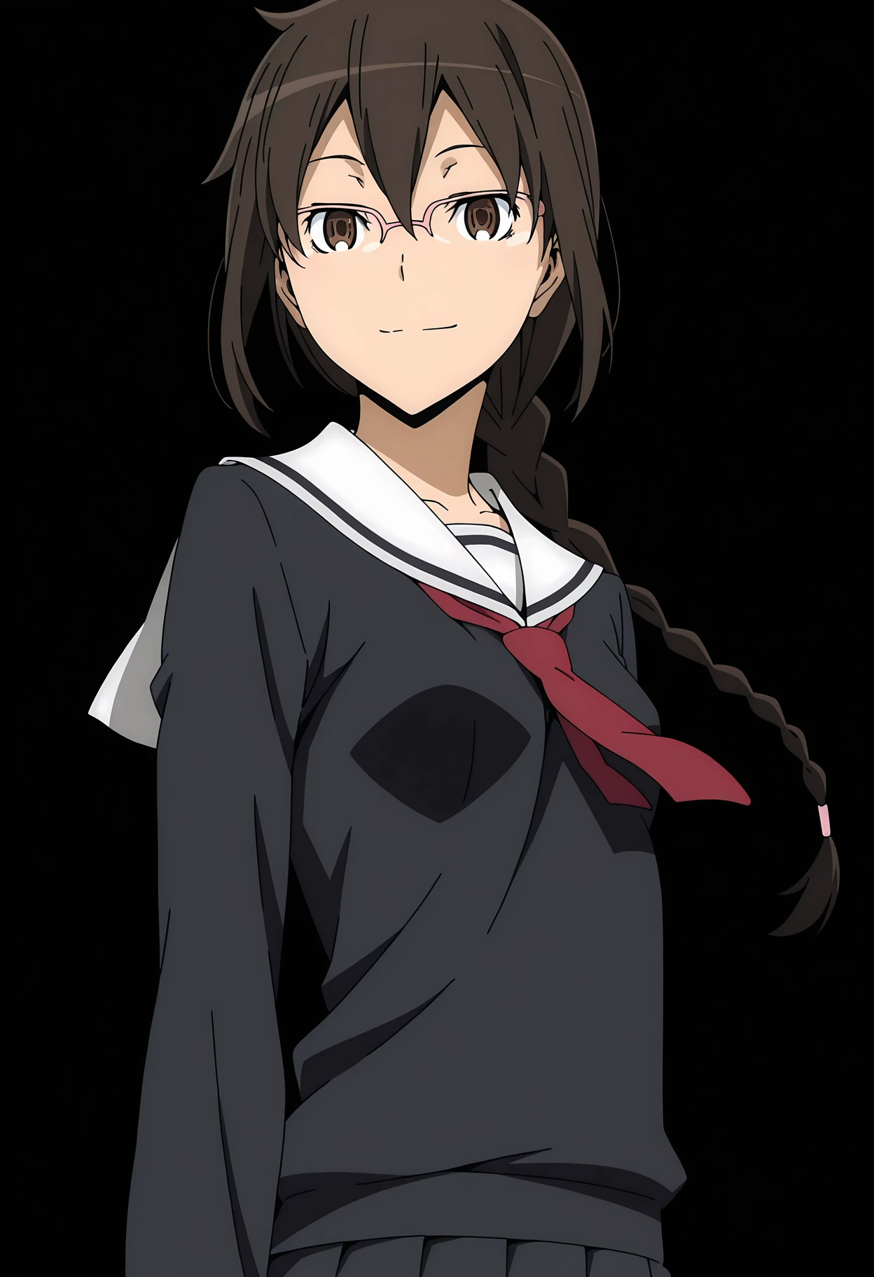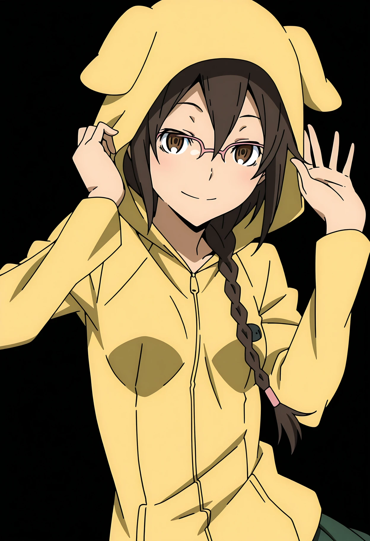 1girl, orihara mairu, brown hair, long hair, braid, brown eyes, glasses, semi-rimless eyewear, pink-framed eyewear, small