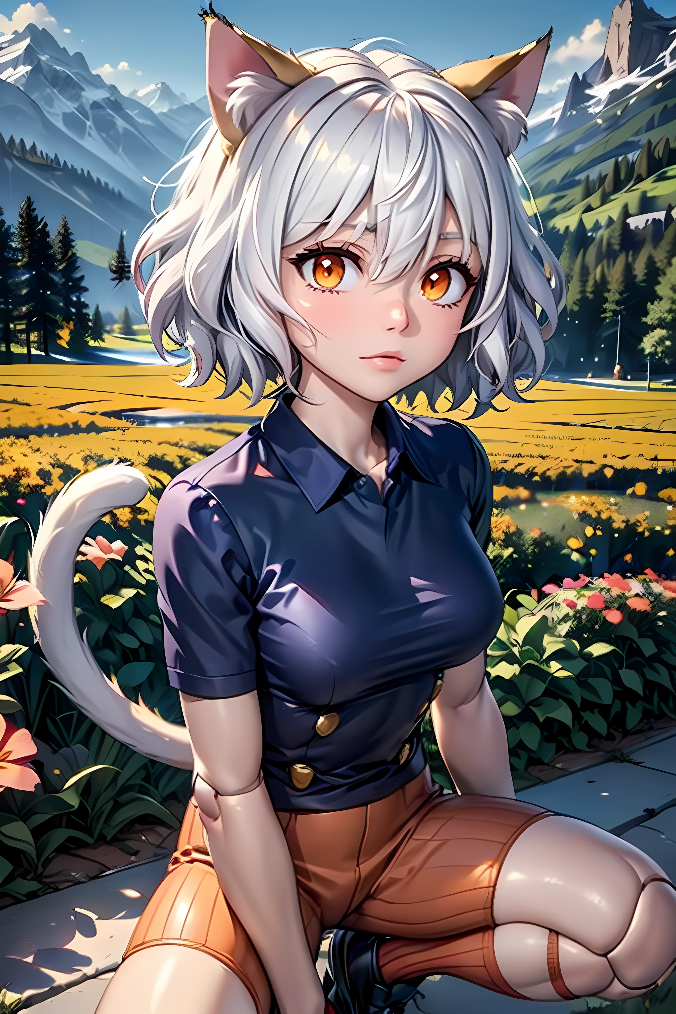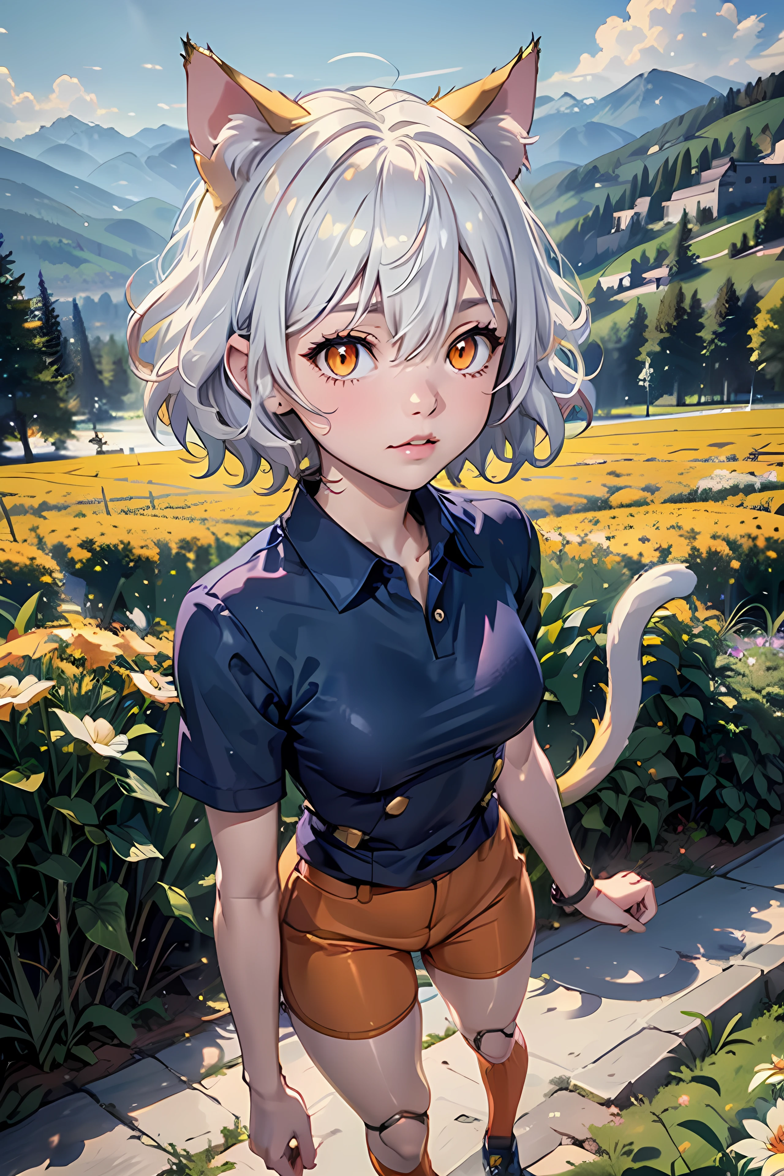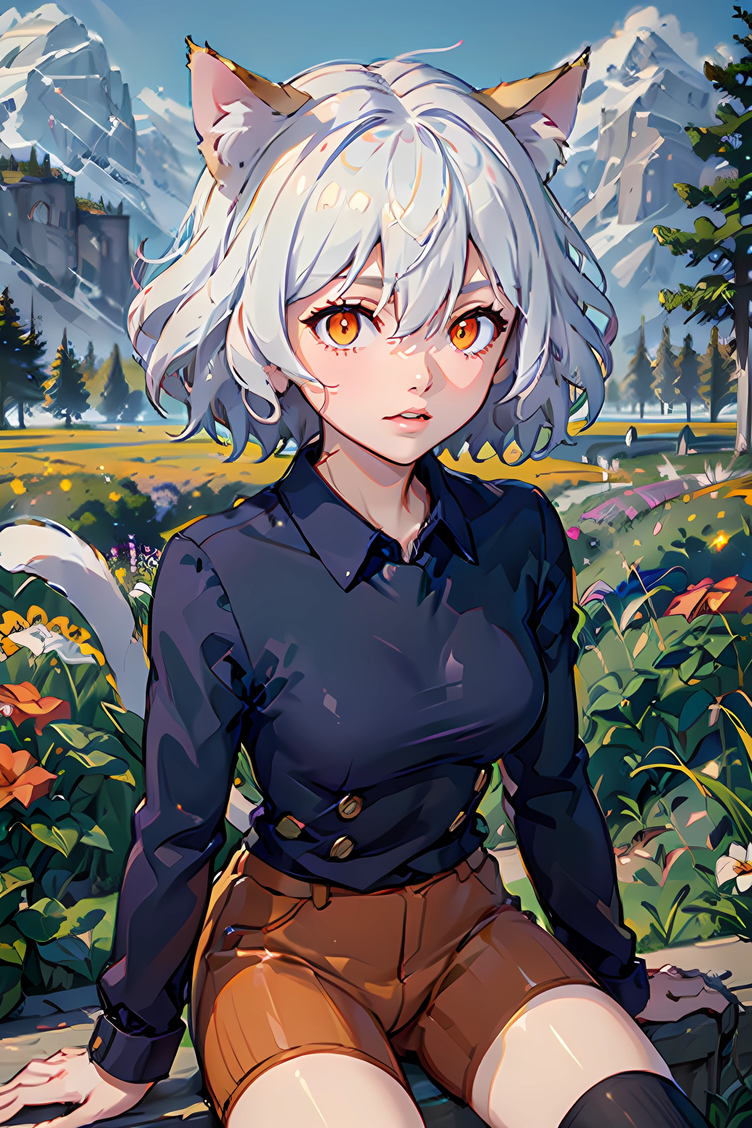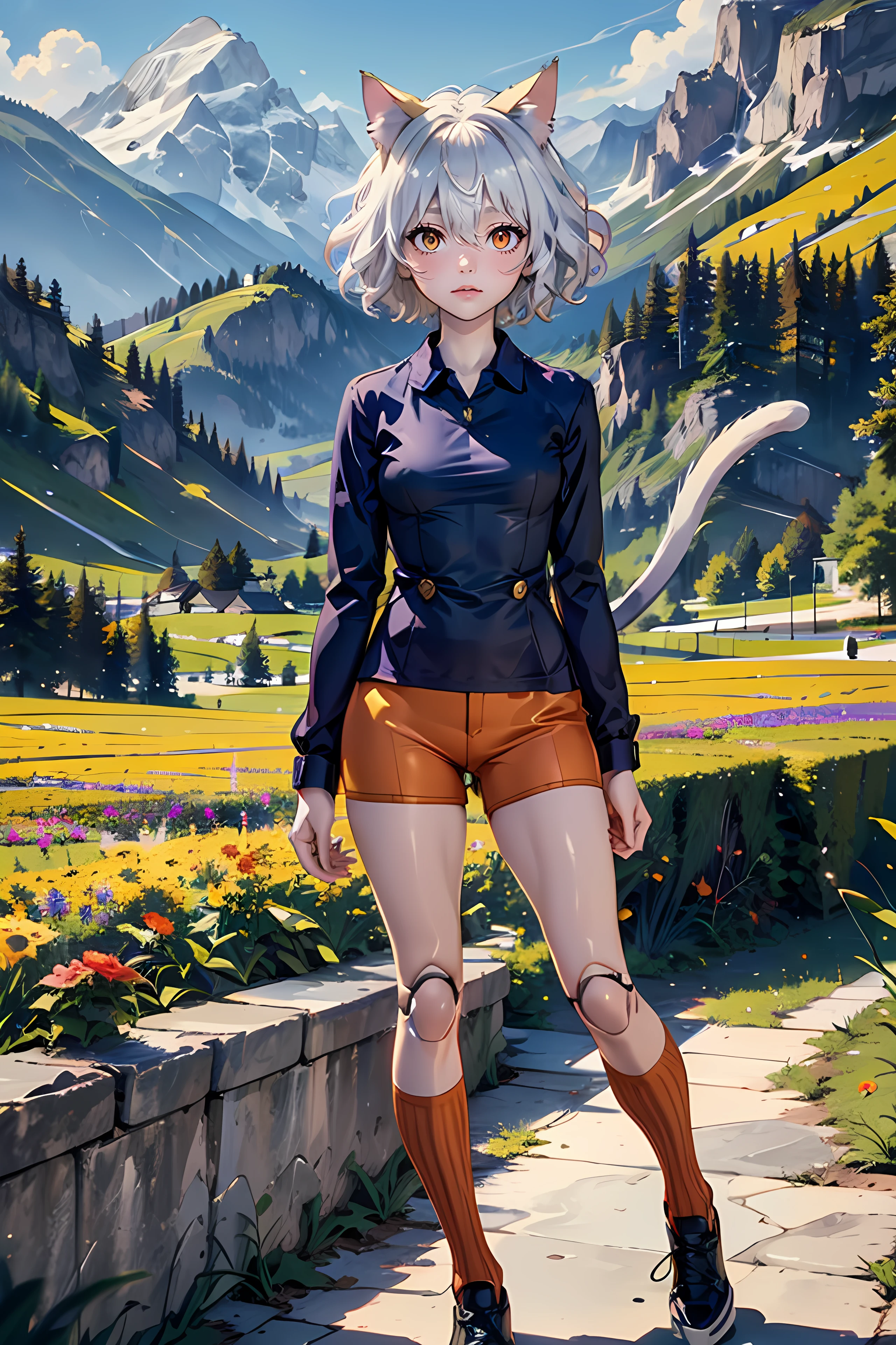1girl,solo,short hair,animal ears,cat ears,orange eyes,shirt,cat girl,medium breasts,hair between eyes, white hair,shorts,socks,shoes,joints,doll joints,tail,cat tail,blue shirt, orange shorts,kneehighs,slit pupils,black footwear,collared shirt, buttons