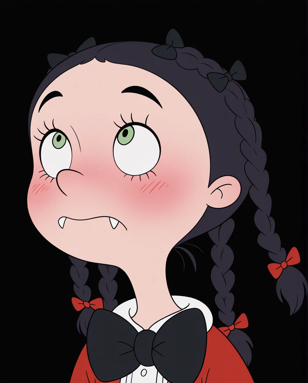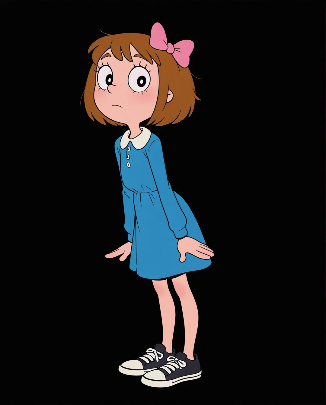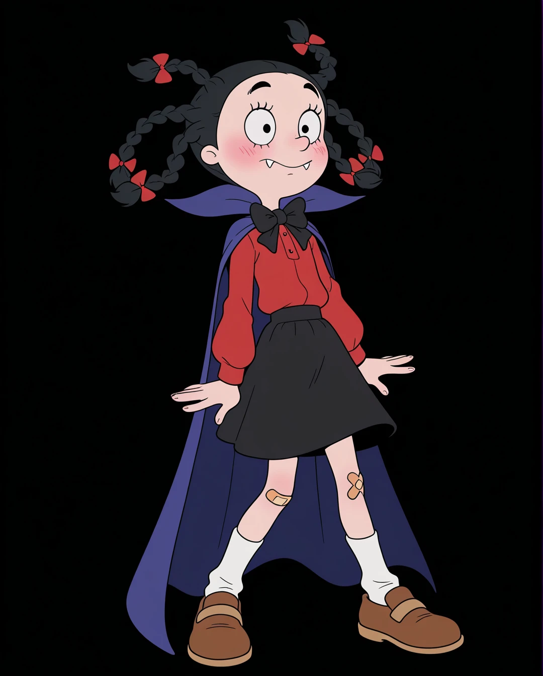 This LoRA faithfully recreates Mona Parker (also known as Mona the Vampire), the imaginative, fearless, and endlessly adventurous protagonist of the Canadian animated series Mona the Vampire (1999–2006, based on the books by Sonia Holleyman & Hiawyn Oram, voiced by Emma Taylor-Isherwood). Mona sees the world as a supernatural battleground filled with monsters, vampires, and mysteries — transforming everyday situations into epic quests with her best friends Charley and Lily. She wears a cape, wields a “vampire-fang”, and speaks in dramatic, theatrical narration. The model locks her classic series design: cape, dress, fangs, and perpetual “the night is young!” heroic pose.