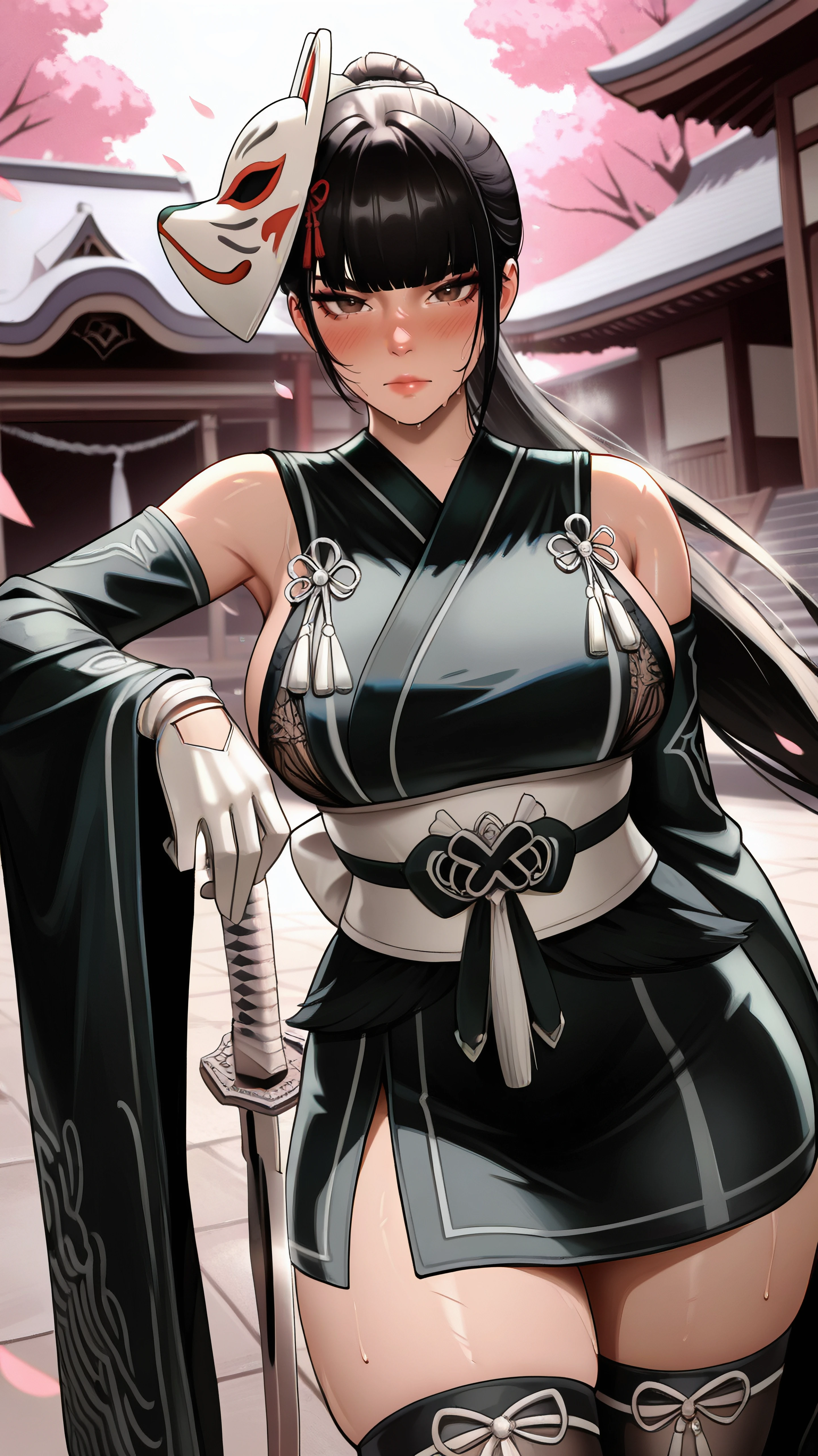 evesb, brown eyes, black hair, ponytail, blunt bangs, multicolored clothes, impossible clothes, latex, multicolored bodysuit, white bodysuit, sleeveless bodysuit, skin tight, black necktie, white gloves, fingerless gloves, clothes writing, choker,