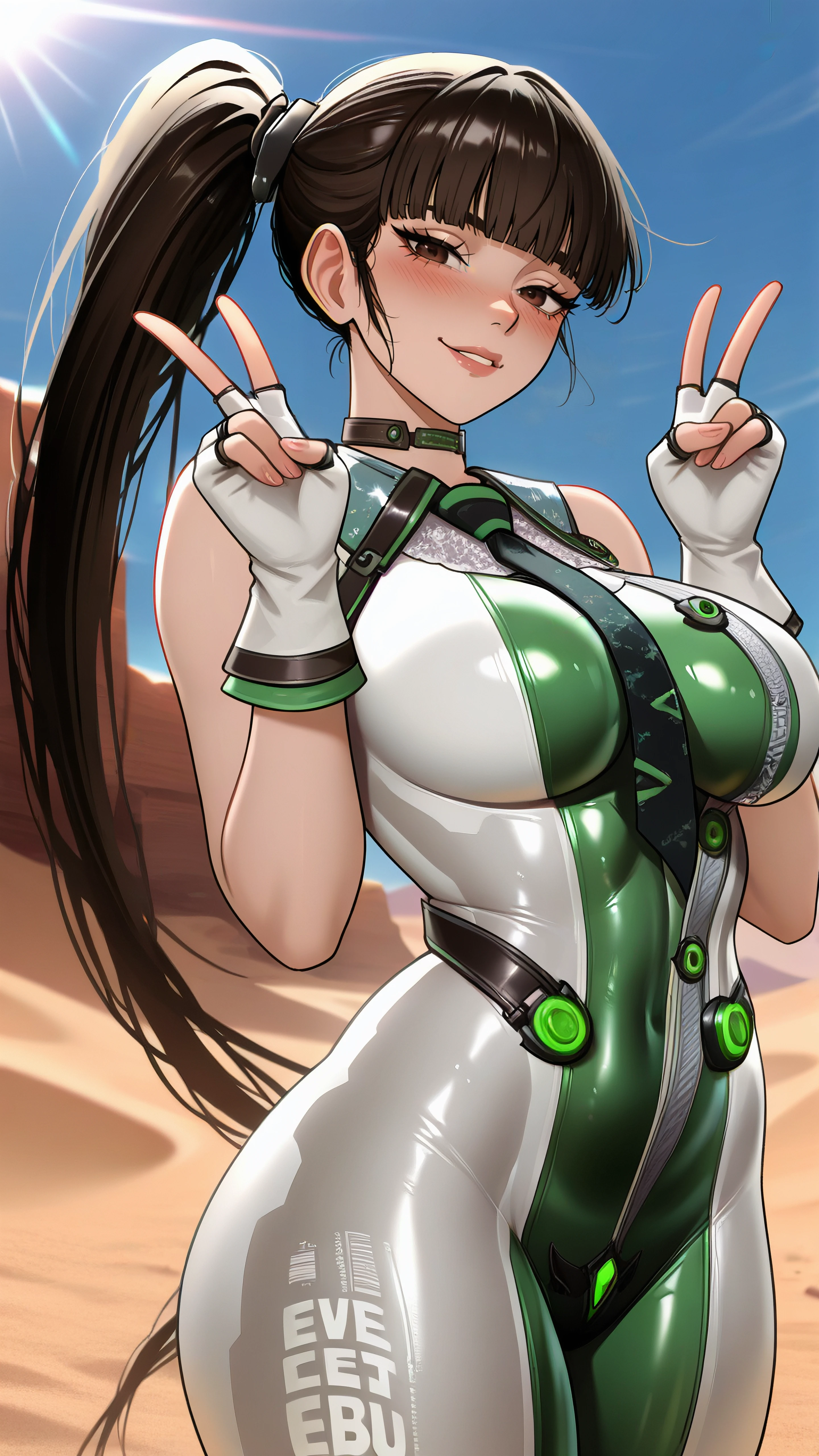evesb, brown eyes, black hair, ponytail, blunt bangs, multicolored clothes, impossible clothes, latex, multicolored bodysuit, white bodysuit, sleeveless bodysuit, skin tight, black necktie, white gloves, fingerless gloves, clothes writing, choker, Description