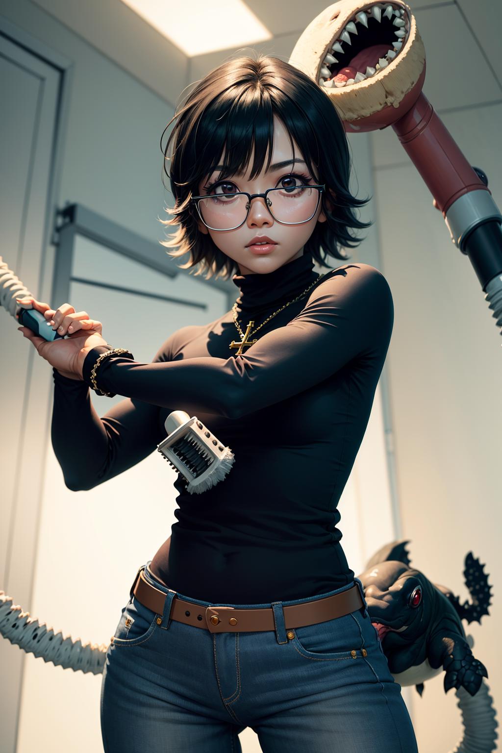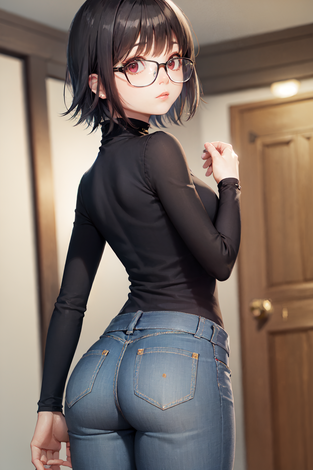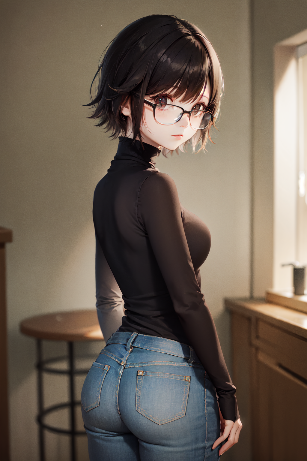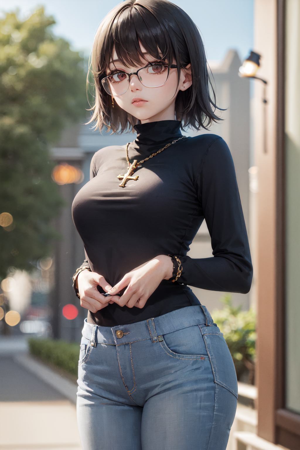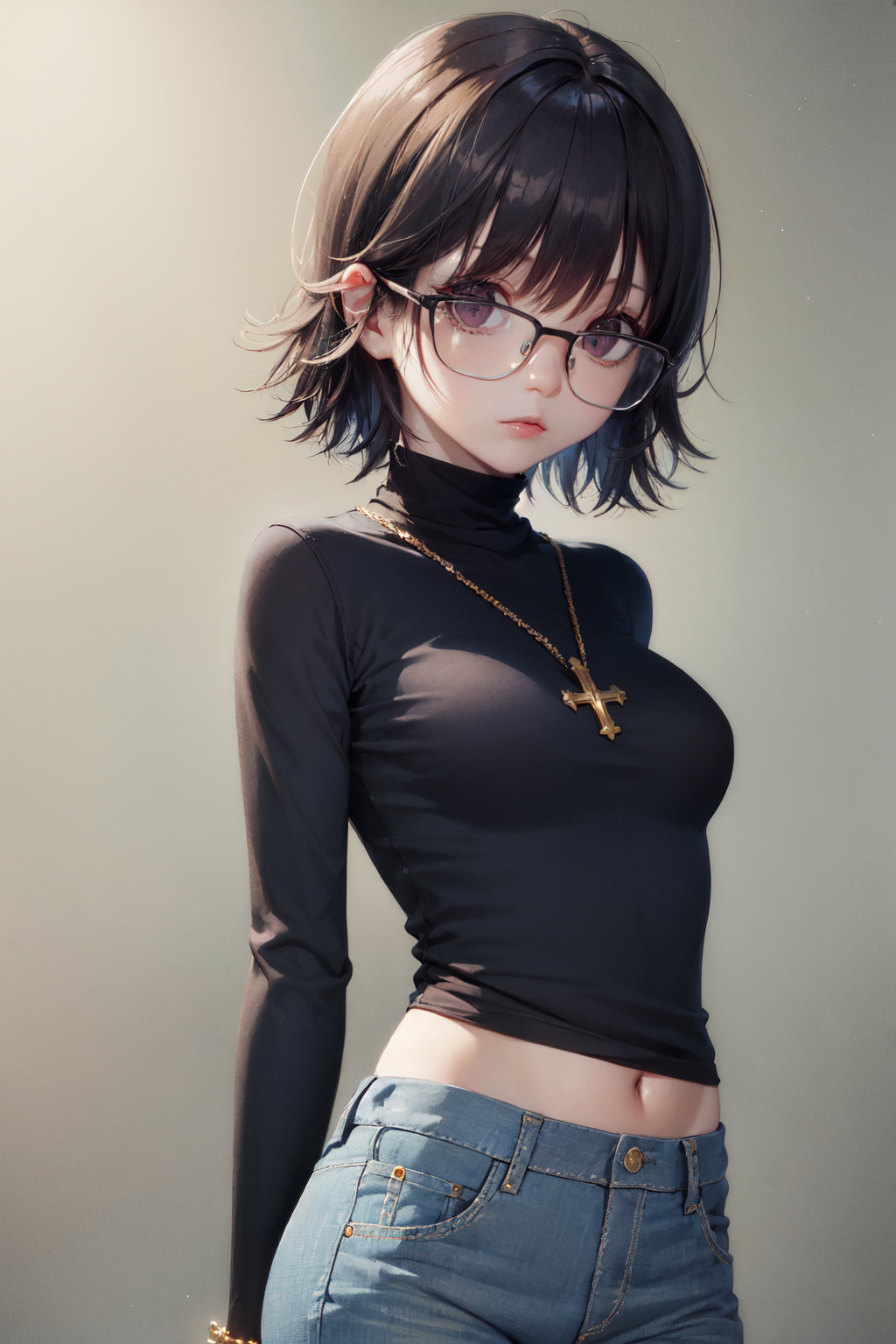 Shizuku's Outfit: glasses, black turtleneck, long sleeves, jeans, cross necklace