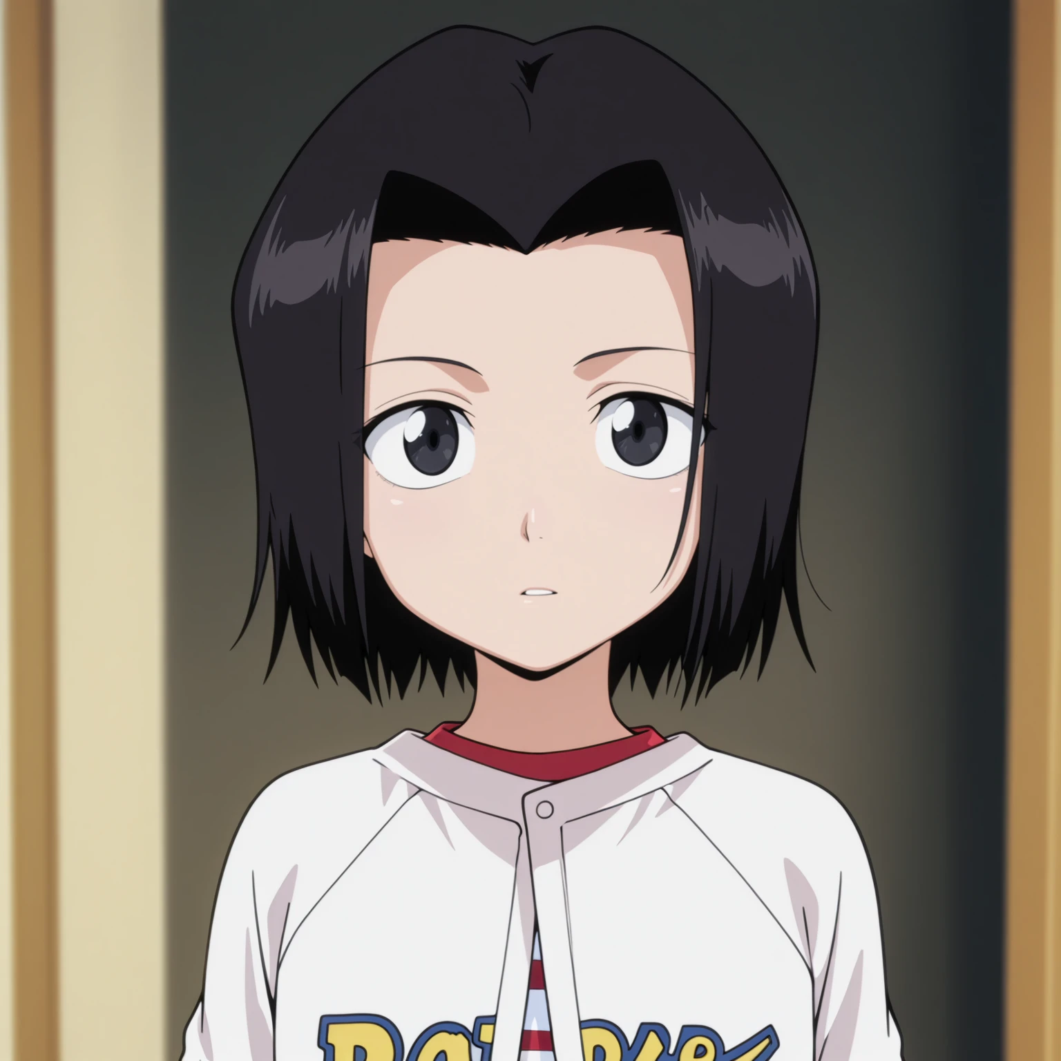 karin, 1girl, short hair, black eyes, black hair, parted bangs, flapper shirt, striped shirt, purple bike shorts,