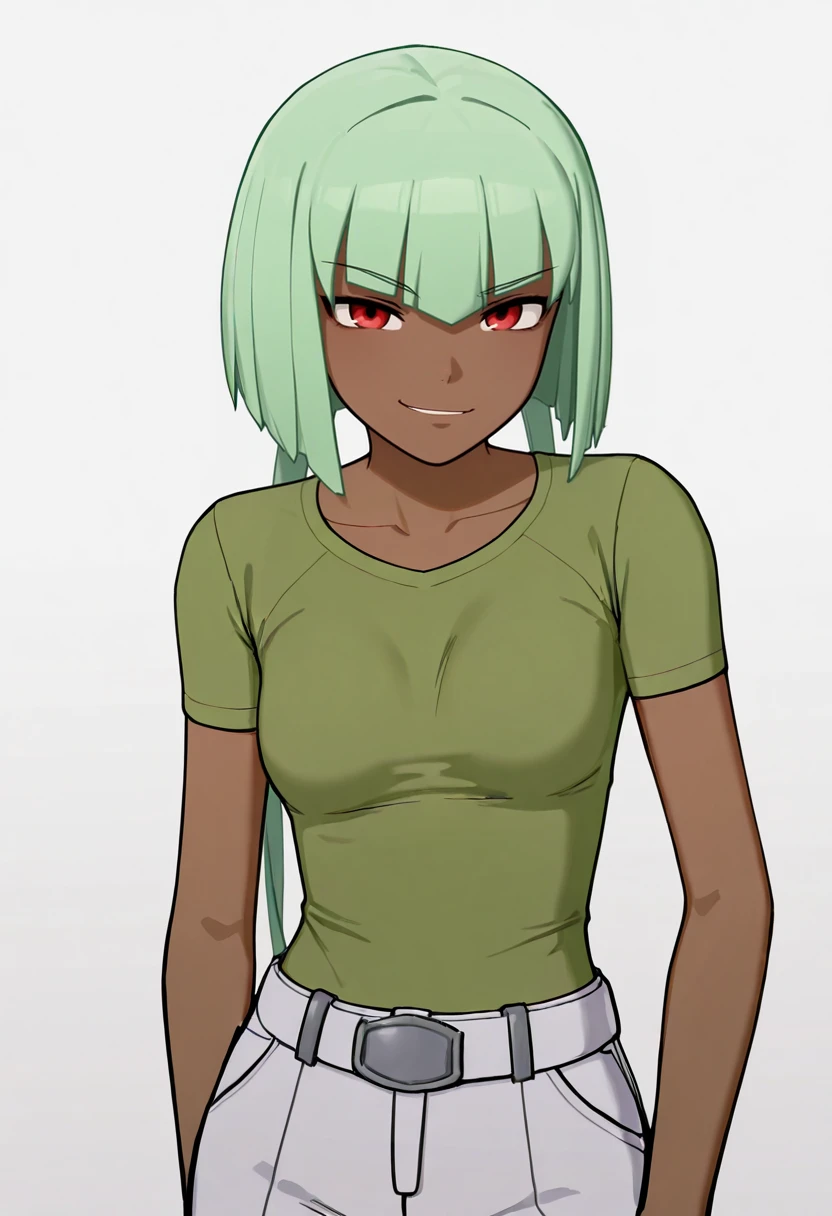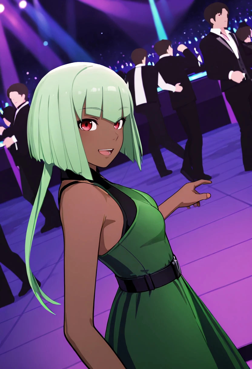 Base appearance prompts:ydemeraldsustrai, 1girl, solo, green_hair, blunt_bangs, short_hair, atypical_hair, asymmetrical_hair, red_eyes, dark-skinned female