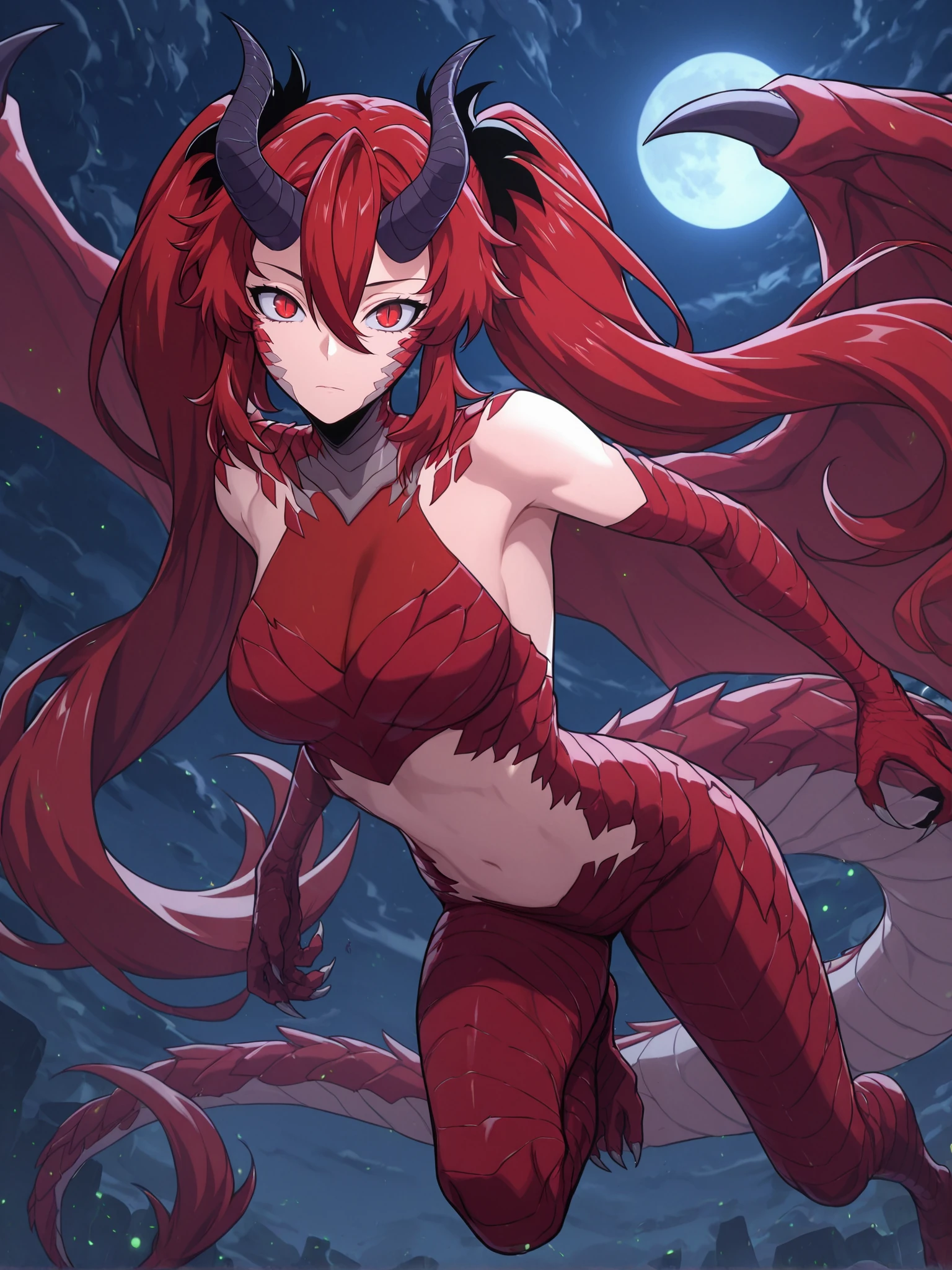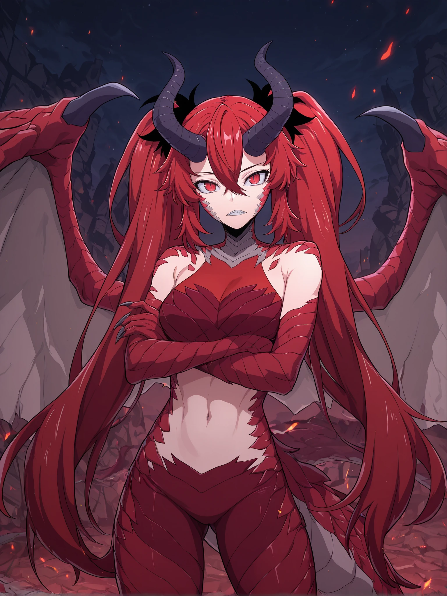 1girl,grossglockner_(the cold blooded warrior),dragon humanoid,purple dragon horns,red hair,twintails,hair between eyes,red eyes,slit pupils,red dragon tail,red scales,scales body,arms scales,claws,legs scales,legs claw,dragon wings,