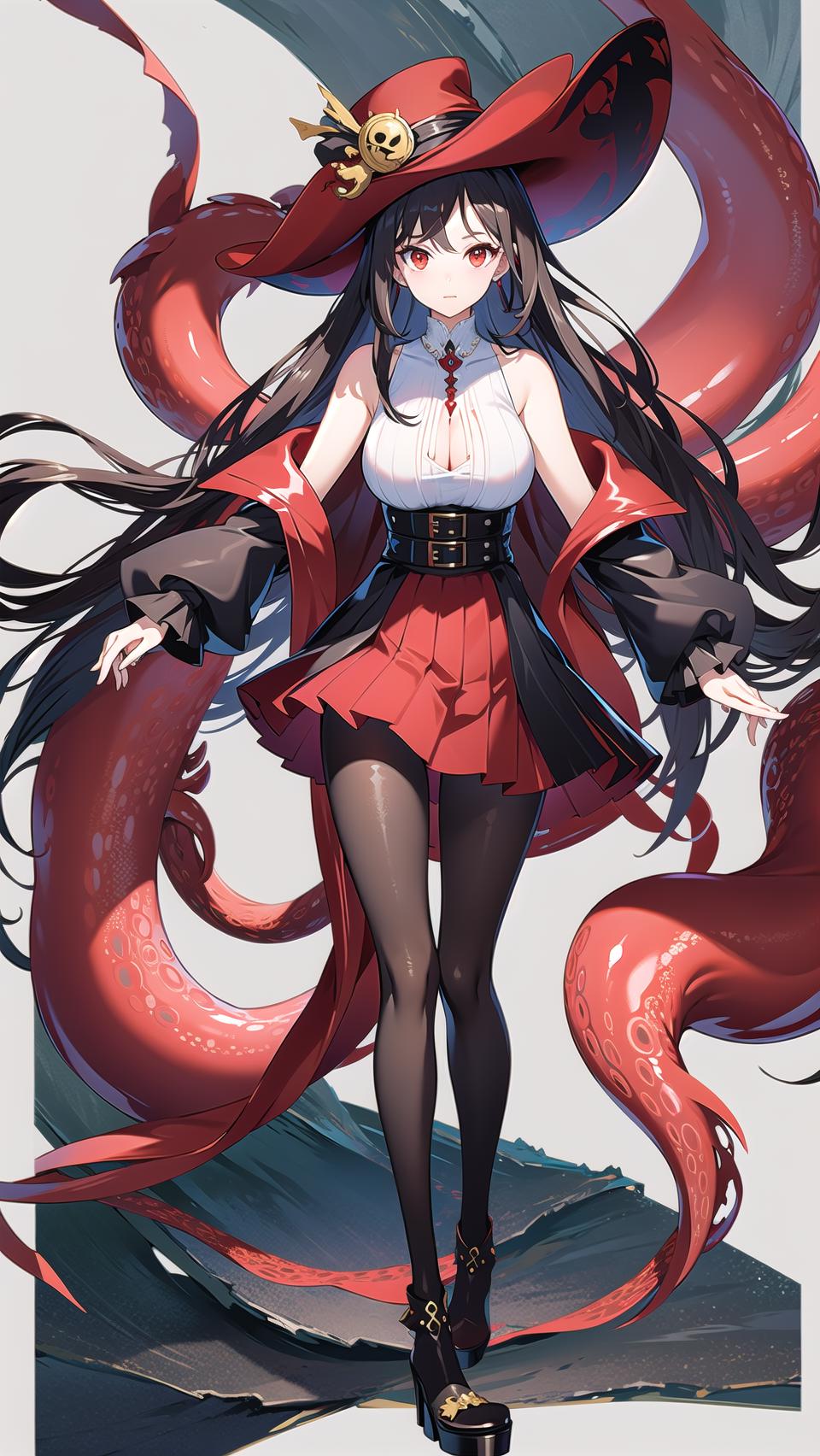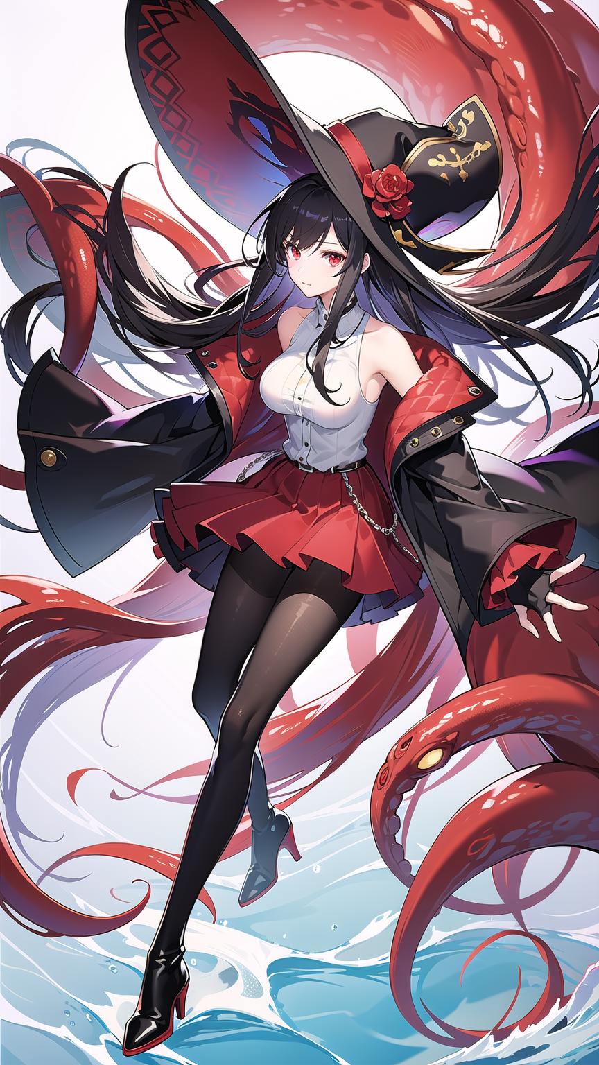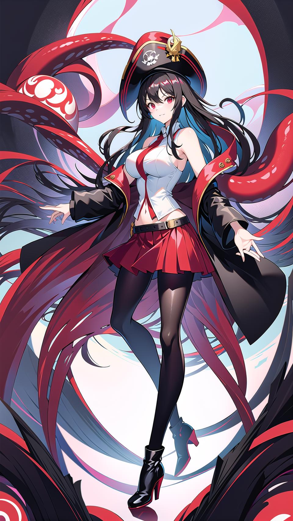 -->Prompts: royalfortune(azur lane), 1girl, red eyes, tentacles, torn clothes, pantyhose, breasts, black hair, red skirt, skirt, black jacket, torn pantyhose, boots, sleeveless, hat, open clothes, bare shoulders, black pantyhose, belt, open jacket, off shoulder, high heels, pirate hat,