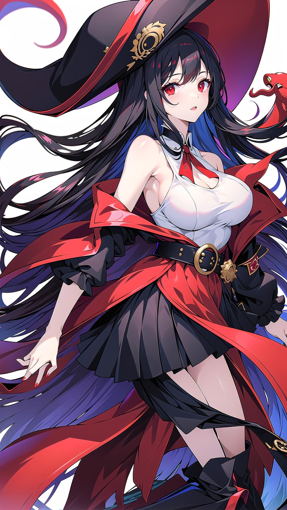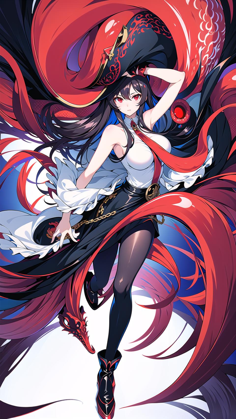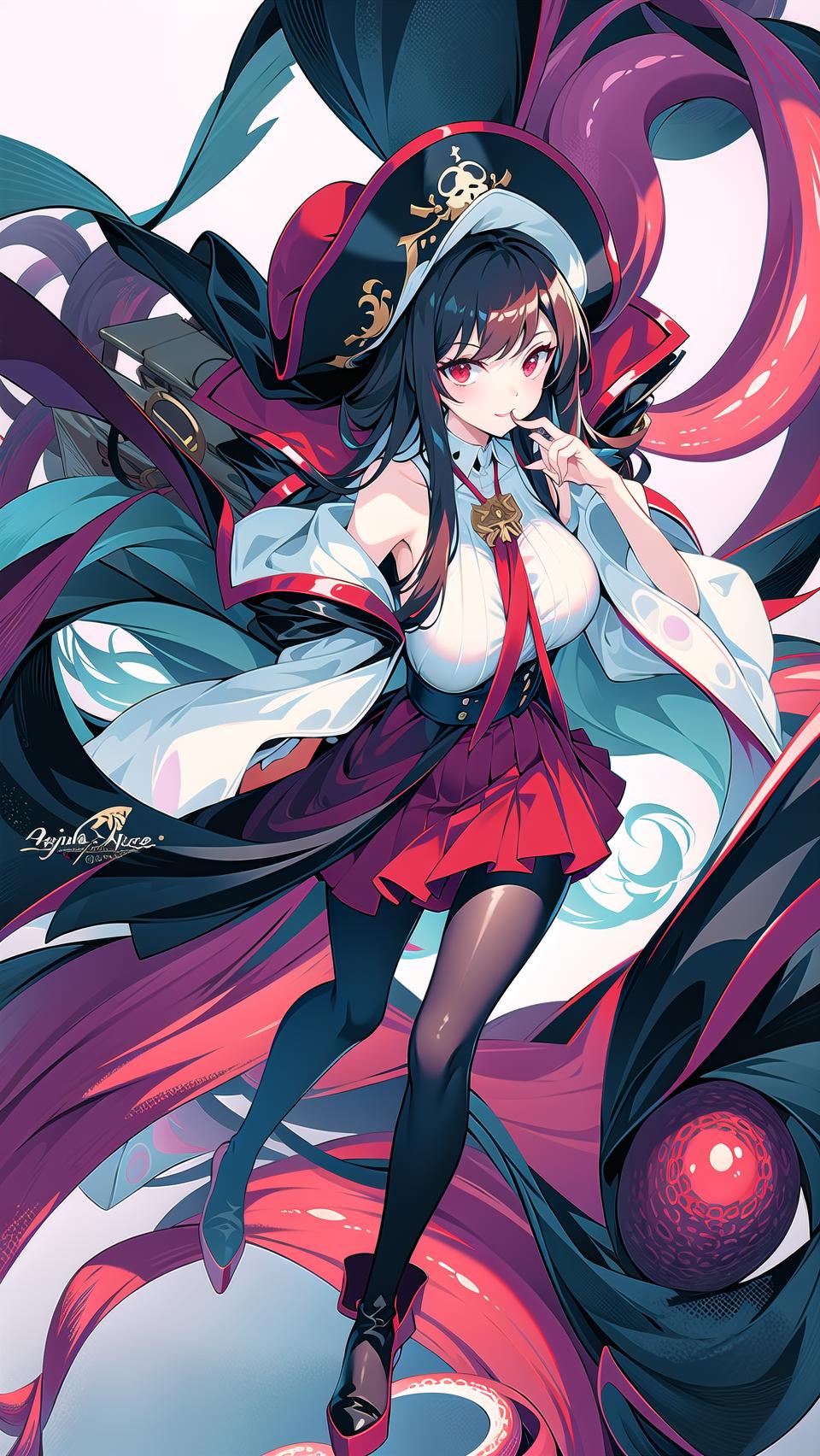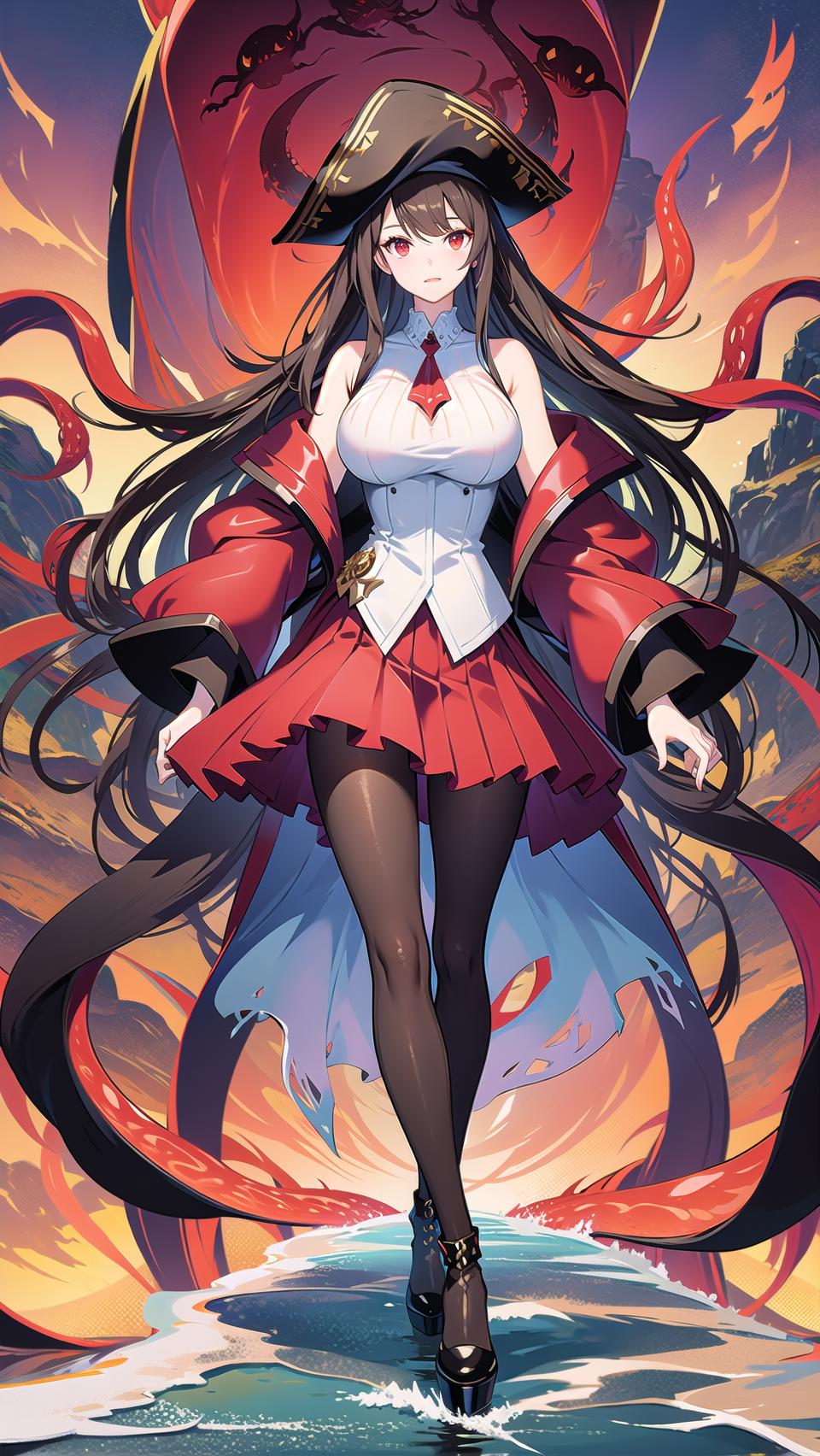 -->Prompts: royalfortune(azur lane), 1girl, red eyes, tentacles, torn clothes, pantyhose, breasts, black hair, red skirt, skirt, black jacket, torn pantyhose, boots, sleeveless, hat, open clothes, bare shoulders, black pantyhose, belt, open jacket, off shoulder, high heels, pirate hat,